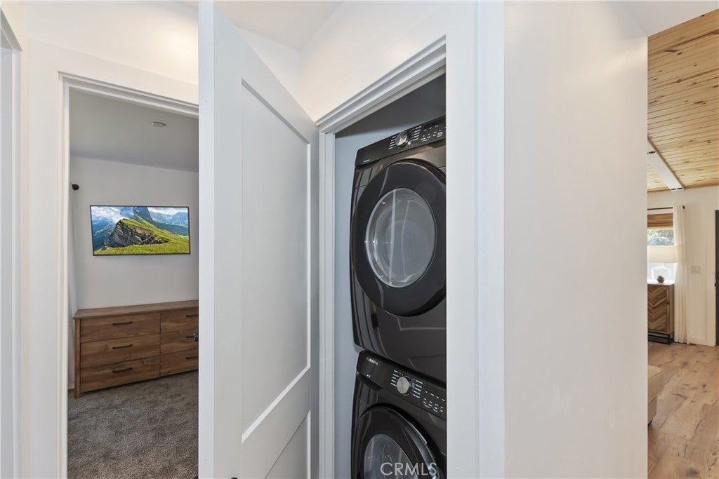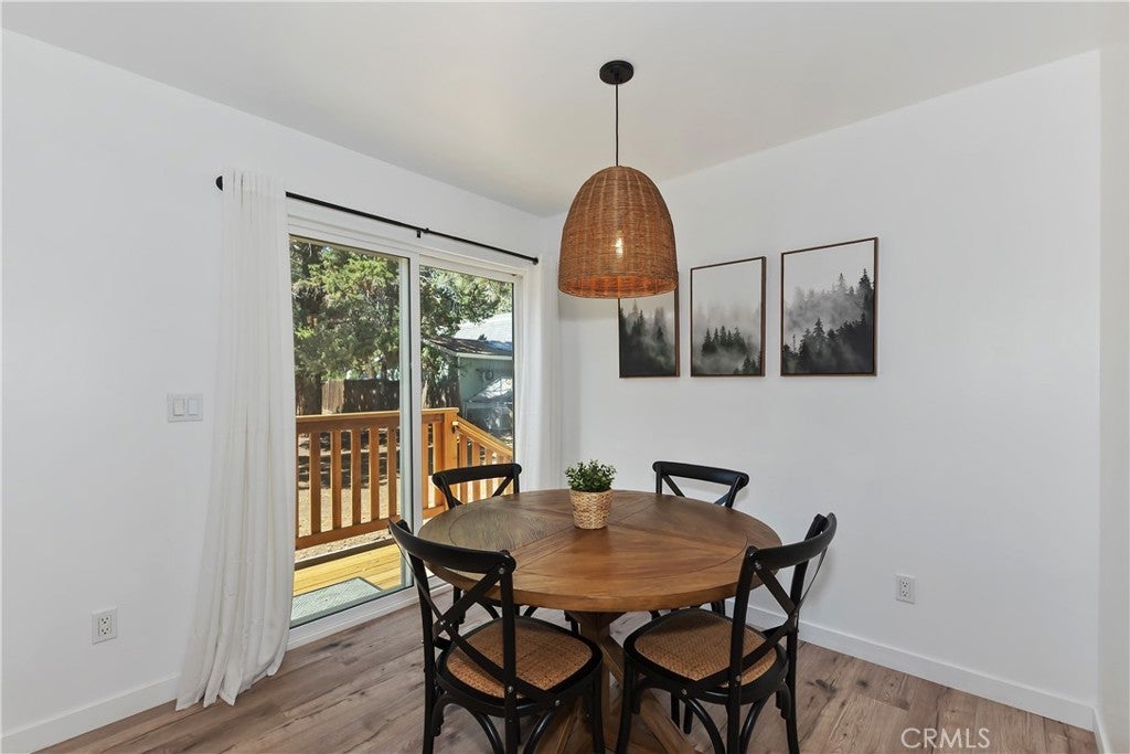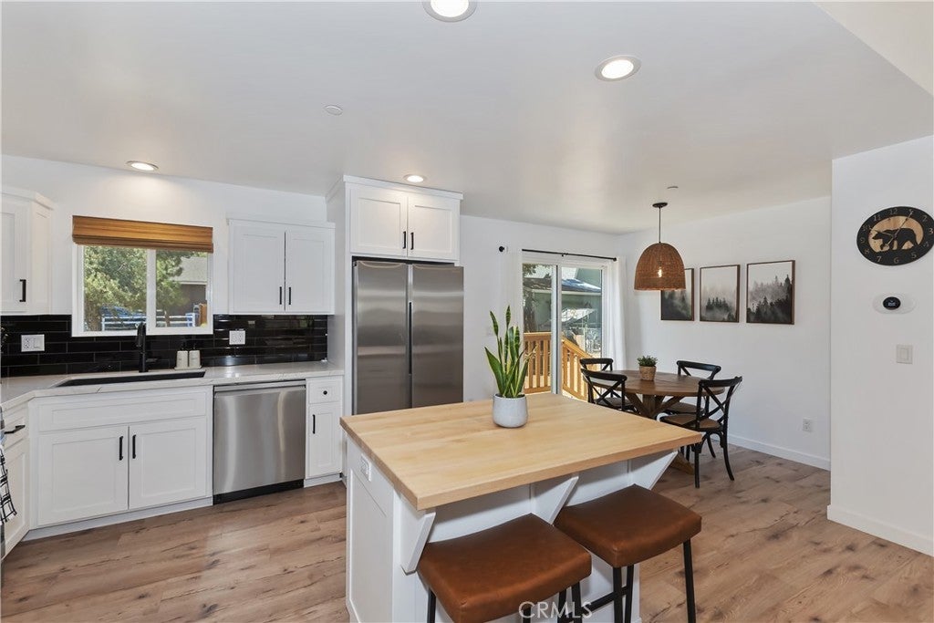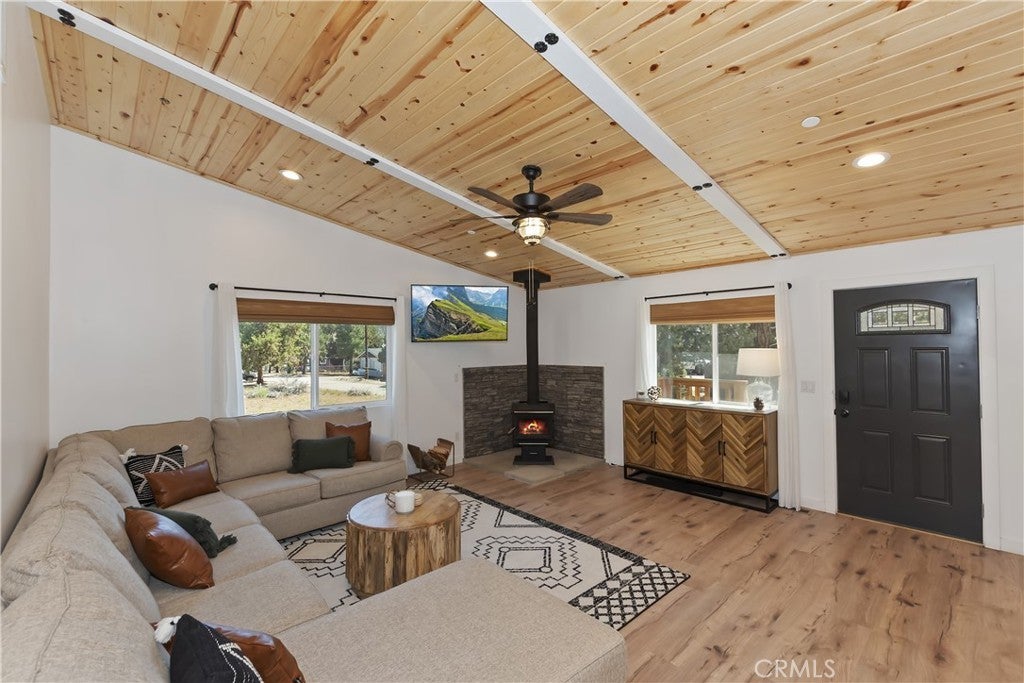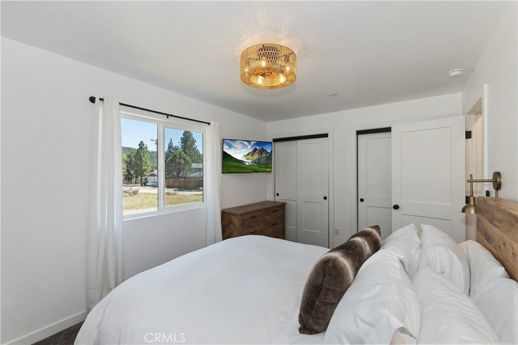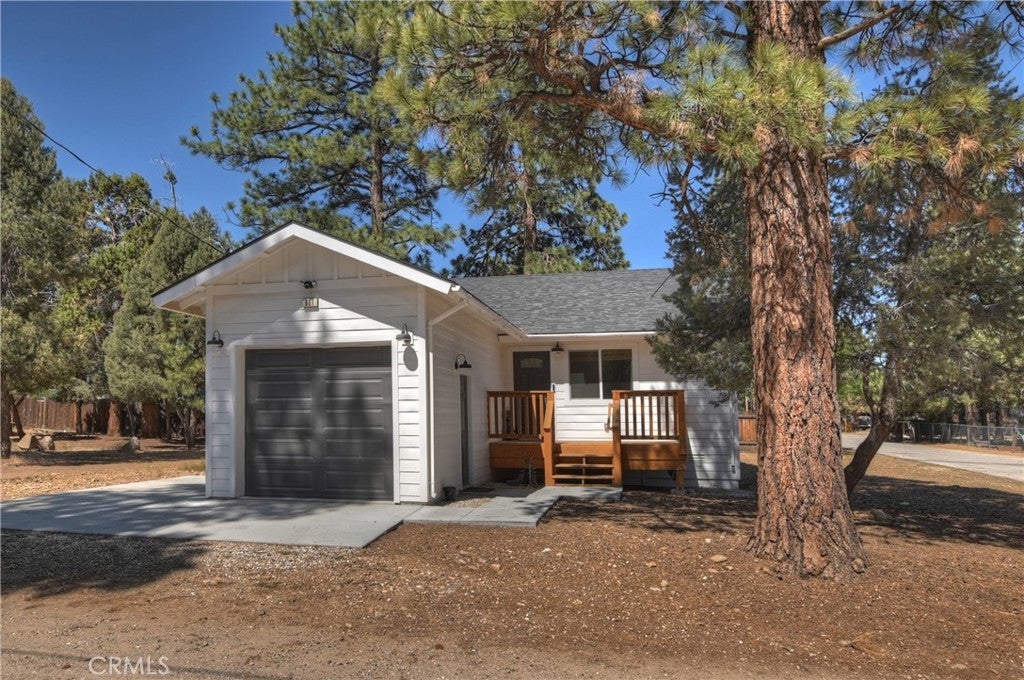 Built in 2022, this beautiful 2-bedroom, 2-bathroom home blends contemporary design with the peaceful charm of Big Bear’s Erwin Lake neighborhood. Step inside this newly built home and you'll immediately appreciate the open-concept living area, showcasing vaulted ceilings, custom flooring, and a Wood burning high efficiency fireplace to keep you cozy and warm on those snowy evenings. The kitchen is a modern delight with stainless steel appliances, quartz countertops, soft-close cabinetry, and island with barstool seating ideal for entertaining. The primary suite offers a blissful escape with its en-suite bath and large closet. A second bedroom and full guest bathroom provide stylish and flexible space for guests or home office. Outdoors, enjoy your spacious yard with room for relaxation, pets or play and plenty of space for future additions like a spa or fire pit. The 1 car detached garage offers extra storage and ease of parking. Located just minutes from hiking trails, Big Bear Lake, and local attractions yet tucked away from the hustle this home is a perfect mix of modern design, comfort and natural beauty.