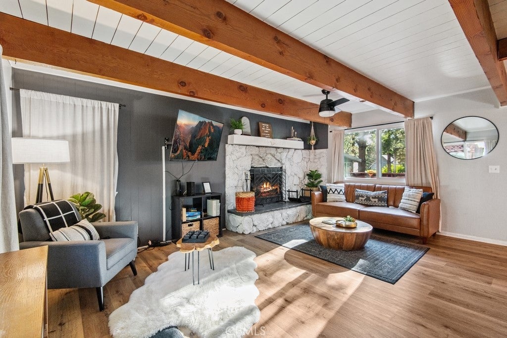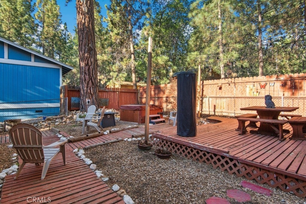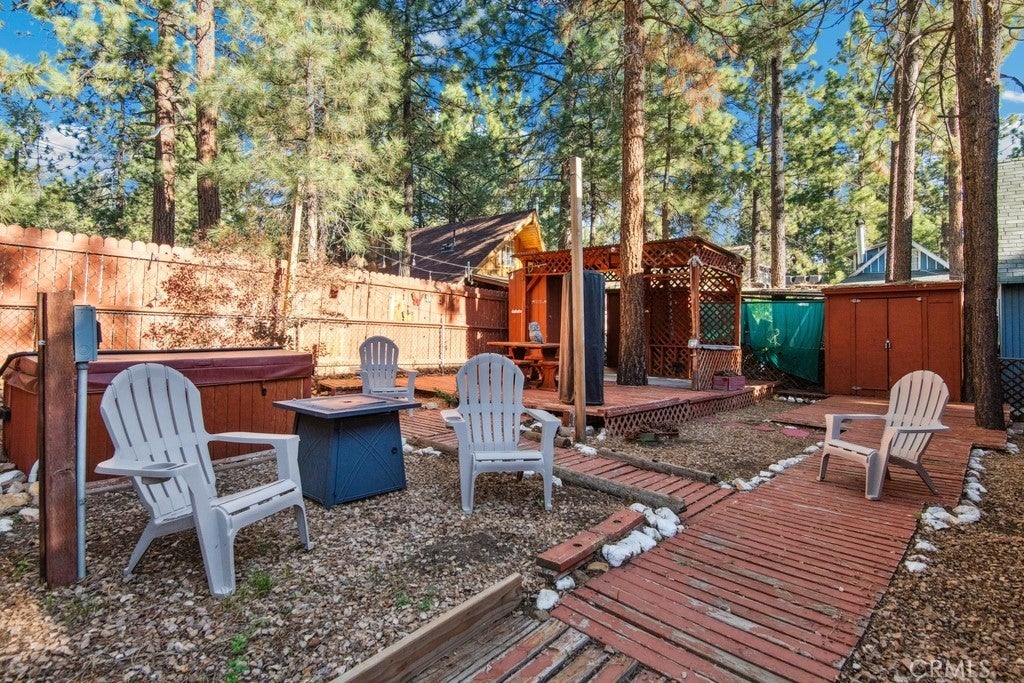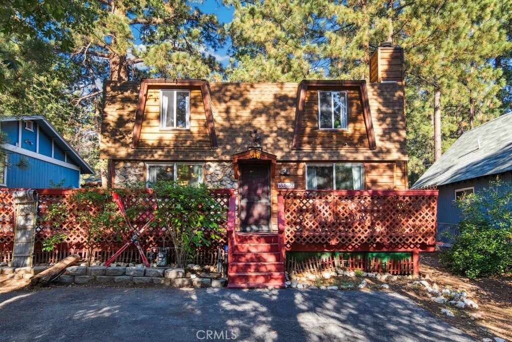 Charming Updated Dutch Gambrel Retreat with Hot Tub & Spacious Outdoor Living. This beautifully updated and fully furnished Dutch gambrel-style home offers mountain charm with modern touches throughout. Enjoy ample off-street parking on the spacious pad and a fully fenced lot for added privacy and security. The welcoming wrap-around deck and wood-beamed ceilings add character and warmth from the moment you arrive. Inside, relax by the cozy rock fireplace in the inviting living area. The eat-in kitchen features granite countertops and stylish decor, perfect for entertaining or everyday comfort. A full bathroom is conveniently located on the main level. Upstairs, you’ll find two spacious bedrooms filled with natural light and plenty of space. The expansive backyard retreat includes multiple wood decks, a covered patio, hot tub, and storage sheds, creating the ultimate outdoor living experience. Located just minutes from shopping and dining, this turnkey getaway is ideal for full-time living, a second home, or a vacation rental.
