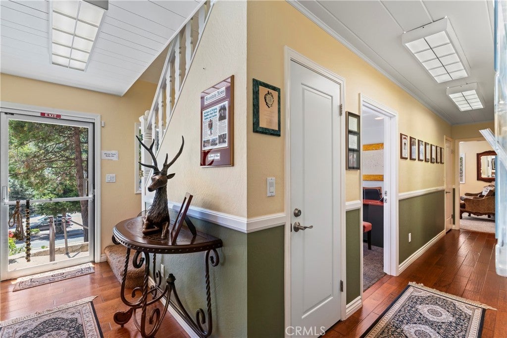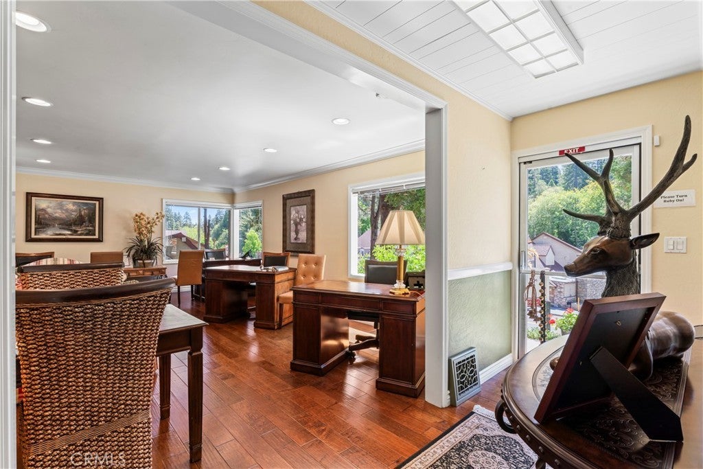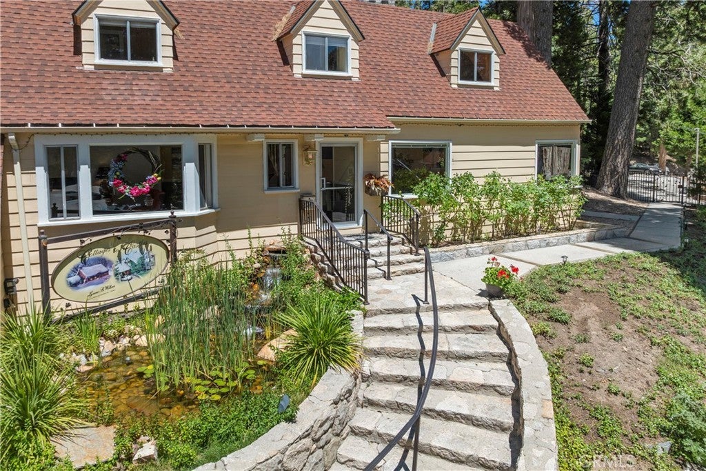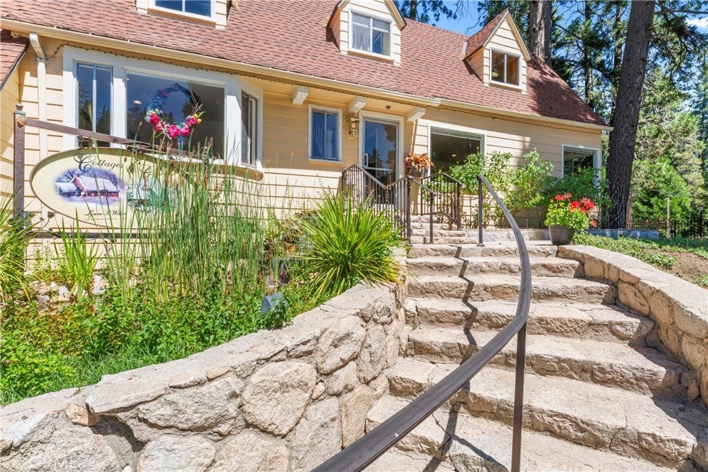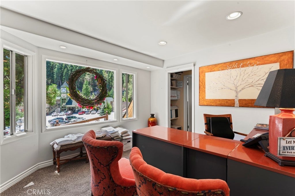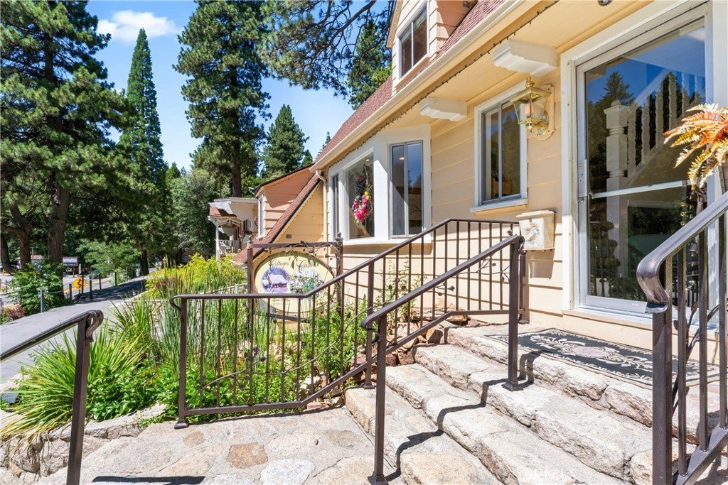 Iconic Office Building in the Heart of Blue Jay Village 27180 State Highway 189 offers a rare opportunity to own a standout commercial property in one of the most visible and desirable locations on the mountain. Positioned at the gateway to Lake Arrowhead and currently home to a thriving real estate firm, this meticulously maintained office building combines charm, function, and unbeatable curb appeal — including a professionally installed $50,000 waterfall and pond that greets clients with a lasting impression. Sitting on a spacious ½ acre parcel, the property includes excellent parking in the rear lot, an attached garage for additional storage or operational flexibility, and premium signage visibility along a high-traffic corridor. The main level features a welcoming entry, a separate client greeting room with a cozy fireplace, a spacious conference room (or executive office), two additional private offices, an updated kitchen with built-in cabinets, sink and refrigerator, and a beautifully remodeled full bathroom. A private enclosed stone patio offers a peaceful outdoor space — ideal for breaks, small meetings, or just enjoying the mountain air. Upstairs, you’ll find a second large conference room, three more private offices, and a modern half bath — creating a flexible layout for professional use, collaborative workspaces, or a multi-tenant setup. With generous square footage, stylish finishes, and a layout adaptable to many business types — from professional services to creative studios or boutique retail — this property is ready for its next chapter.