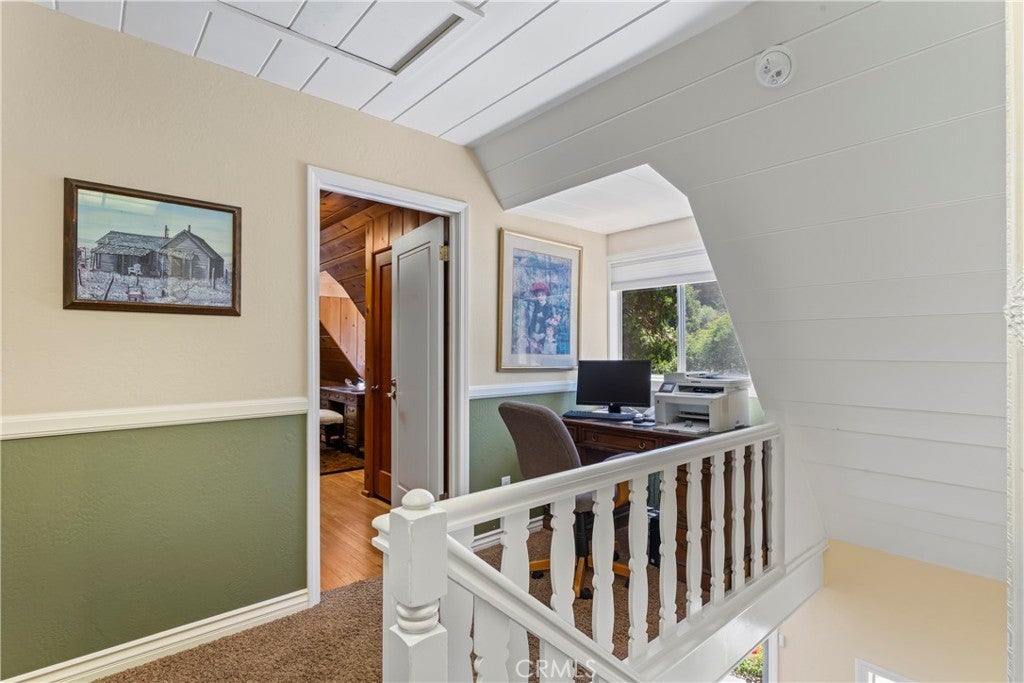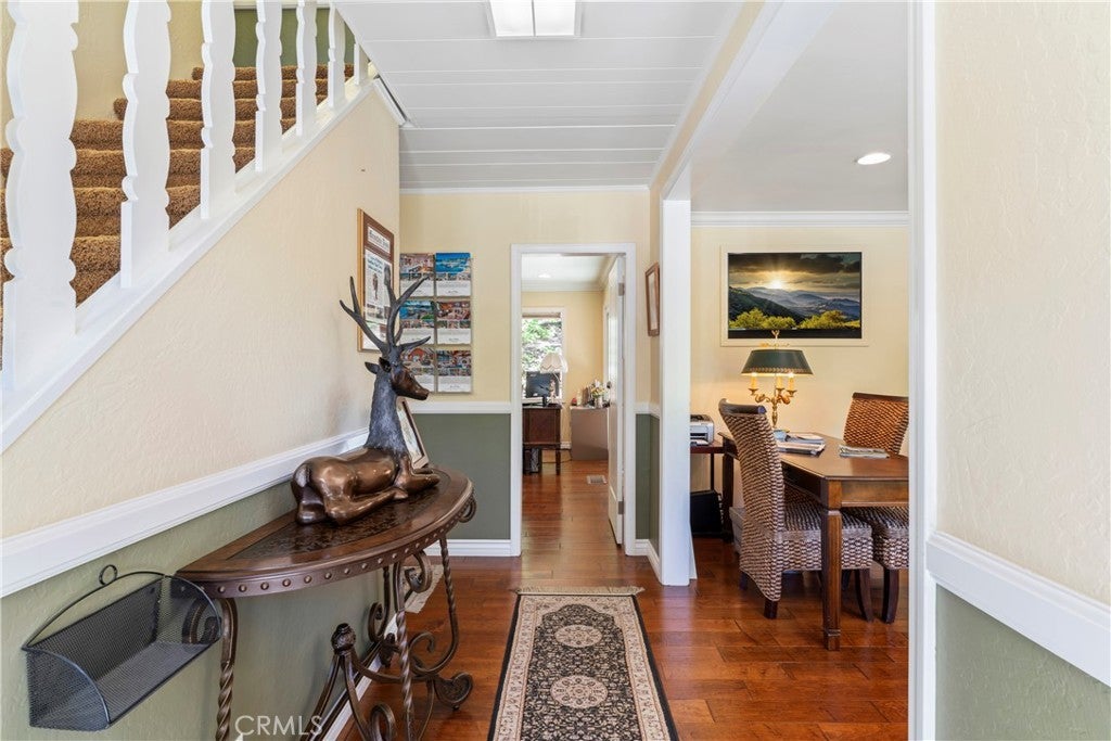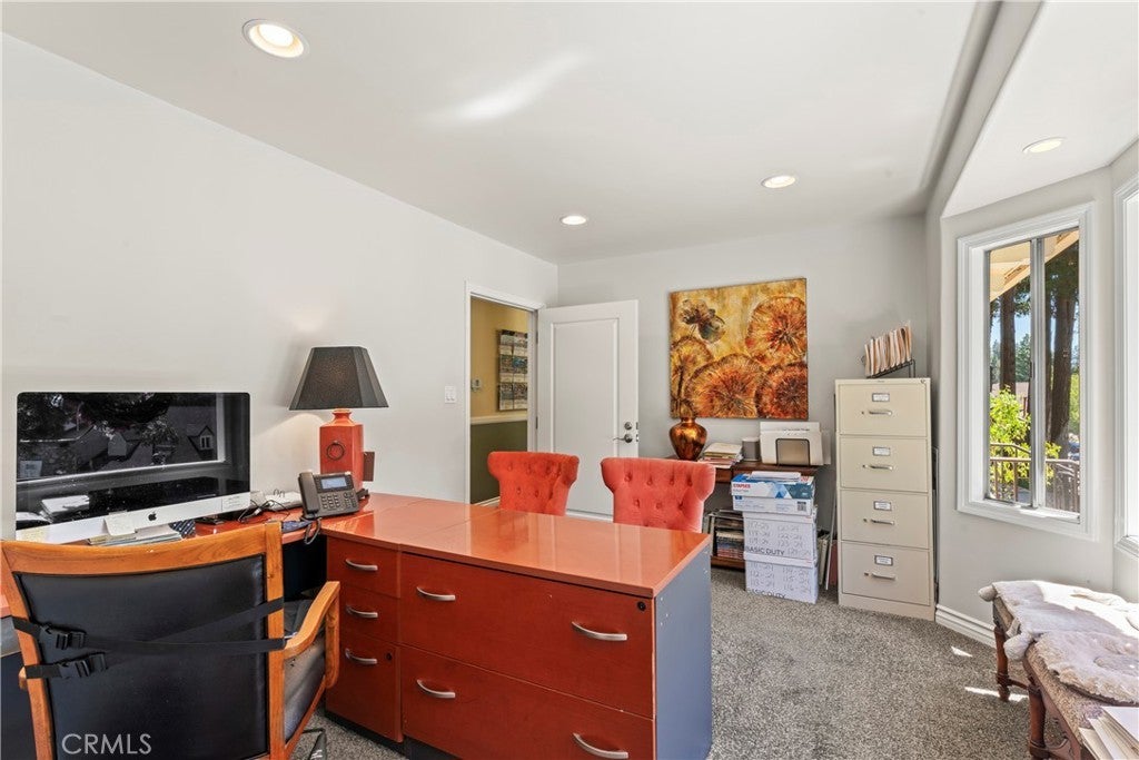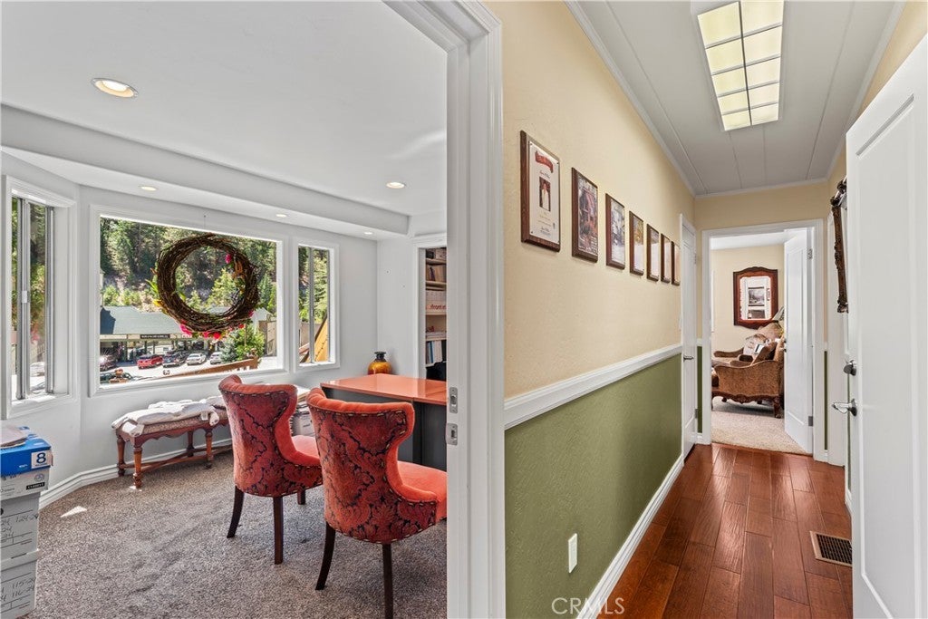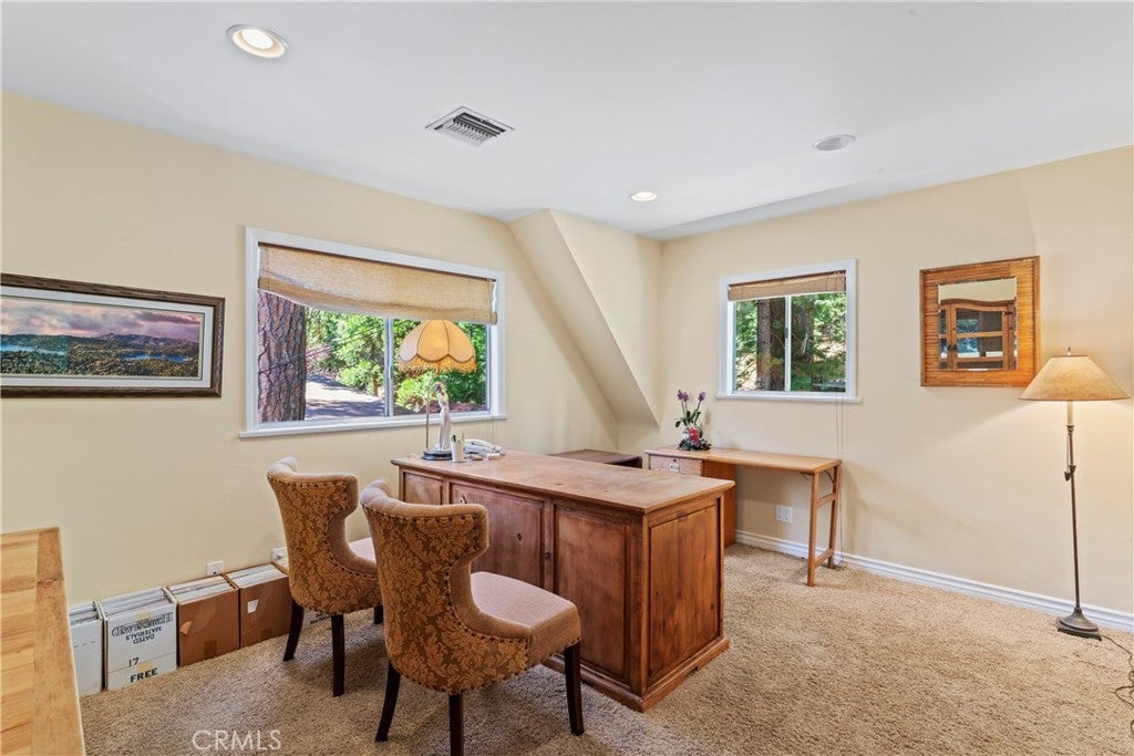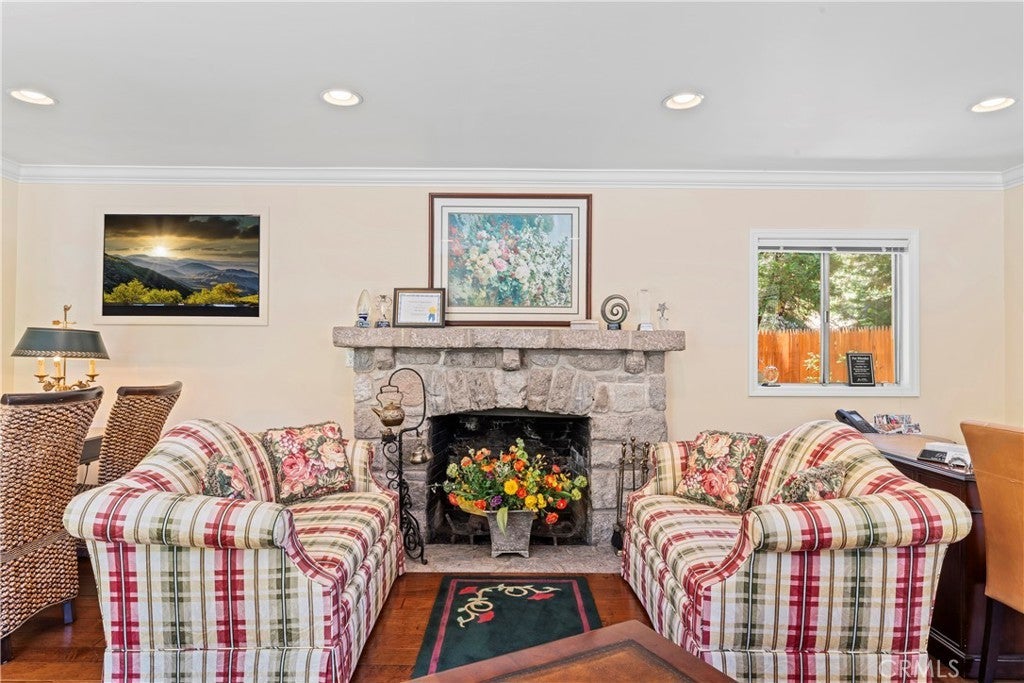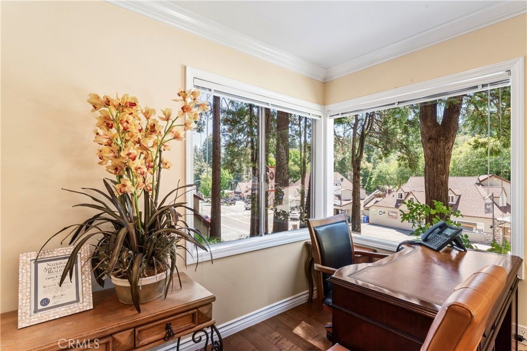 Iconic Office Building in the Heart of Blue Jay Village 27180 State Highway 189 offers a rare opportunity to own a standout commercial property in one of the most visible and desirable locations on the mountain. Positioned at the gateway to Lake Arrowhead and currently home to a thriving real estate firm, this meticulously maintained office building combines charm, function, and unbeatable curb appeal — including a professionally installed $50,000 waterfall and pond that greets clients with a lasting impression. Sitting on a spacious ½ acre parcel, the property includes excellent parking in the rear lot, an attached garage for additional storage or operational flexibility, and premium signage visibility along a high-traffic corridor. The main level features a welcoming entry, a separate client greeting room with a cozy fireplace, a spacious conference room (or executive office), two additional private offices, an updated kitchen with built-in cabinets, sink and refrigerator, and a beautifully remodeled full bathroom. A private enclosed stone patio offers a peaceful outdoor space — ideal for breaks, small meetings, or just enjoying the mountain air. Upstairs, you’ll find a second large conference room, three more private offices, and a modern half bath — creating a flexible layout for professional use, collaborative workspaces, or a multi-tenant setup. With generous square footage, stylish finishes, and a layout adaptable to many business types — from professional services to creative studios or boutique retail — this property is ready for its next chapter.