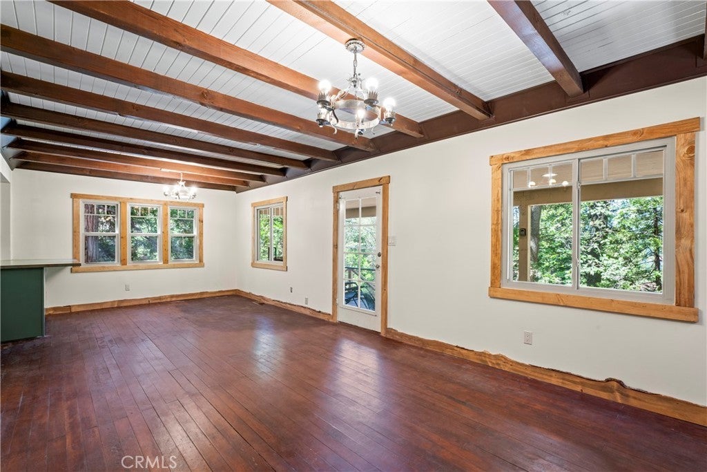 Beamed Ceilings, Ceiling Fan(s), Living Room Deck Attached, Open Floorplan, Recessed Lighting, Unfurnished, Wood Product Walls, Main Level Primary