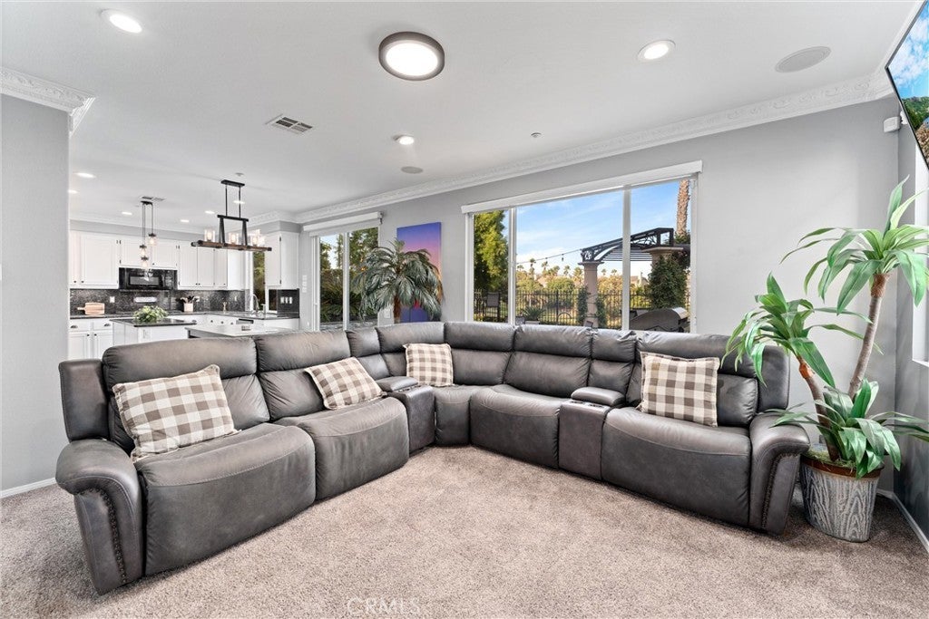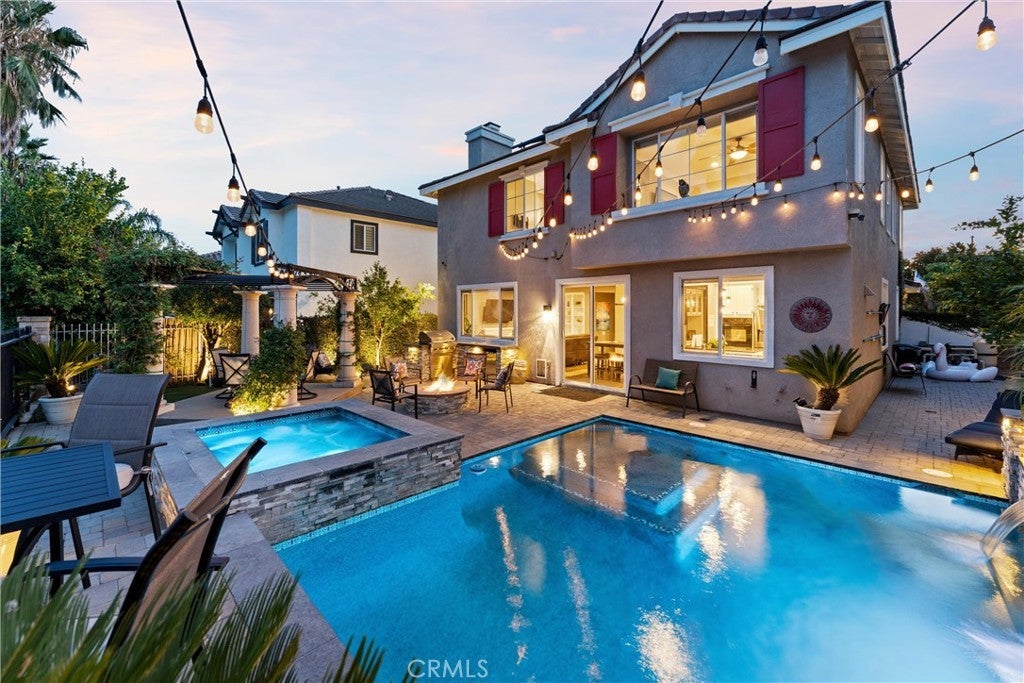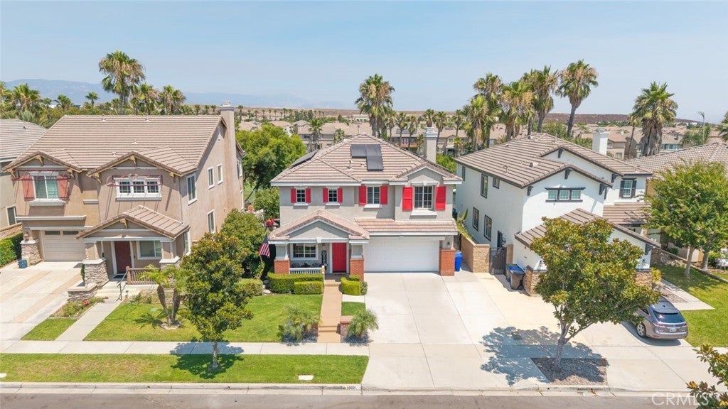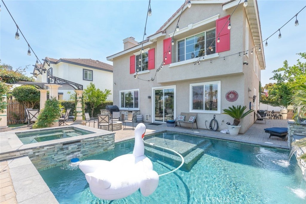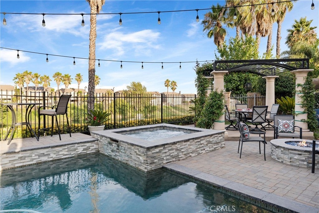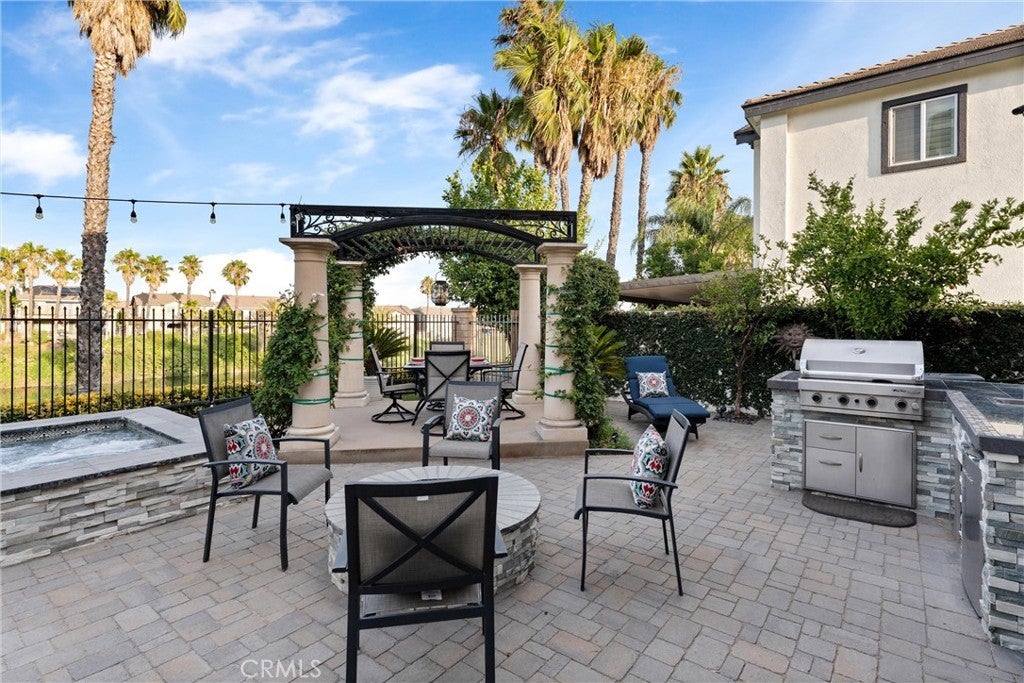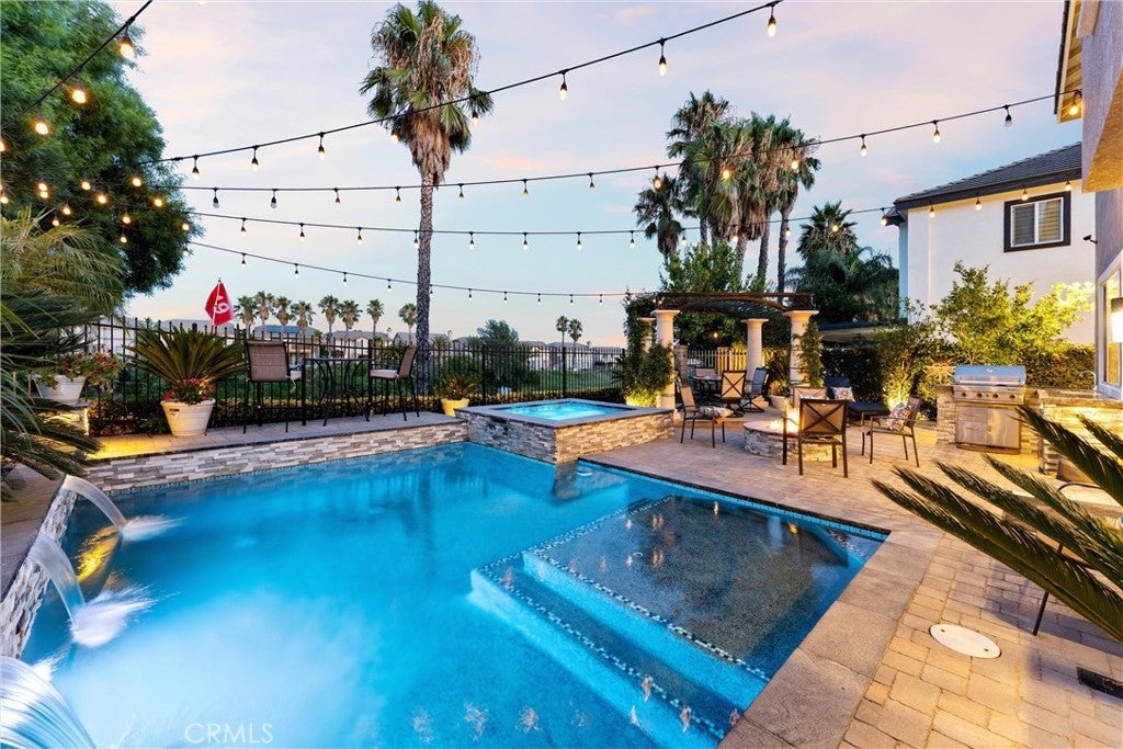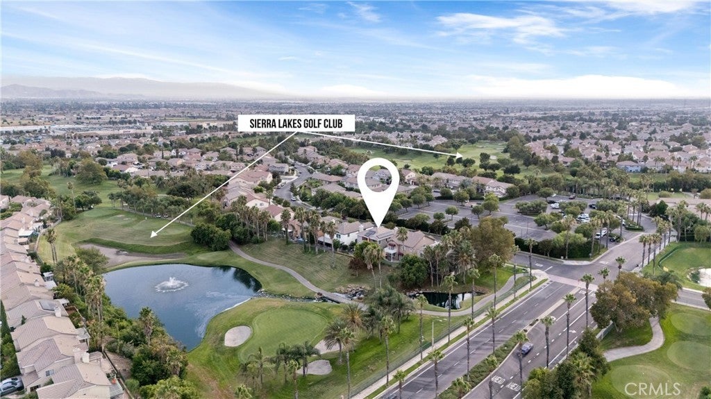 Welcome to this beautiful pool home in a premier community on the Sierra Lakes Golf Course! This stunning 4-bedroom, 3-bathroom home offers luxury and resort-style living. Located on the signature hole #6, which boasts a large water feature with a stunning fountain, and offering the most breathtaking view in the neighborhood, this property is a rare find for those seeking elegance. Step inside to discover a thoughtfully designed interior with custom crown molding and rich wood flooring throughout. The formal dining room, featuring a striking decorative stone wall and custom chandelier, is perfect for hosting dinner parties. A separate formal living room adds sophistication, while the cozy family room with a fireplace invites relaxation. Upstairs, a built-in desk provides a convenient workspace, and select furniture is included for a seamless move-in. The upgraded kitchen is a chef’s delight, boasting a double oven, walk-in pantry, custom lighting, and all appliances, including the refrigerator. The downstairs powder room impresses with a modern floating vanity, and the upstairs primary suite offers a serene retreat with custom ceiling fans for added comfort. The upstairs laundry room, complete with a sink, ample storage, washer, and dryer, makes chores a breeze. Outdoor living is where this home truly shines. The backyard is an entertainer’s paradise, featuring a built-in barbecue with refrigerator and sink, covered gazebo, fire pit, and a sparkling saltwater pool with waterfalls, controlled by a Pentair system via a phone app. Unwind in the jacuzzi or tend to the herb garden in the expansive side yard, dotted with grapefruit, orange, and lime trees. The beautifully landscaped grounds enhance the stunning views, making every day feel like a vacation. Practical features include a two-car garage with overhead storage, a solar system with battery backup, a Tesla 220V charging system, and a tankless water heater. The HVAC system is serviced annually for peace of mind, and new window screens add a fresh touch. Stay connected with a smart sprinkler system and secure with a Vivant security system, both app-controlled. Community amenities elevate the lifestyle, with a clubhouse just a two-minute walk away, offering Sunday brunch rated #2 in the Inland Empire. Golf enthusiasts will love the top-ranked Southern California golf course, a true golfer’s paradise.
