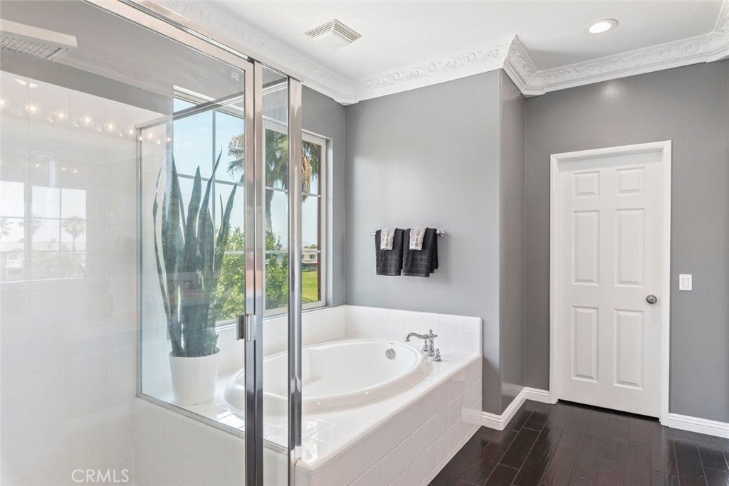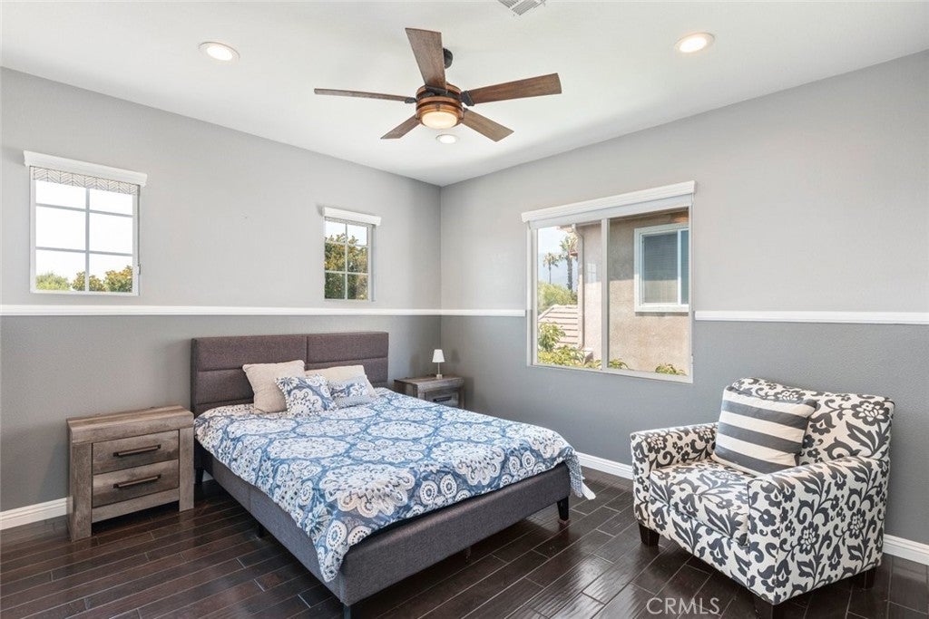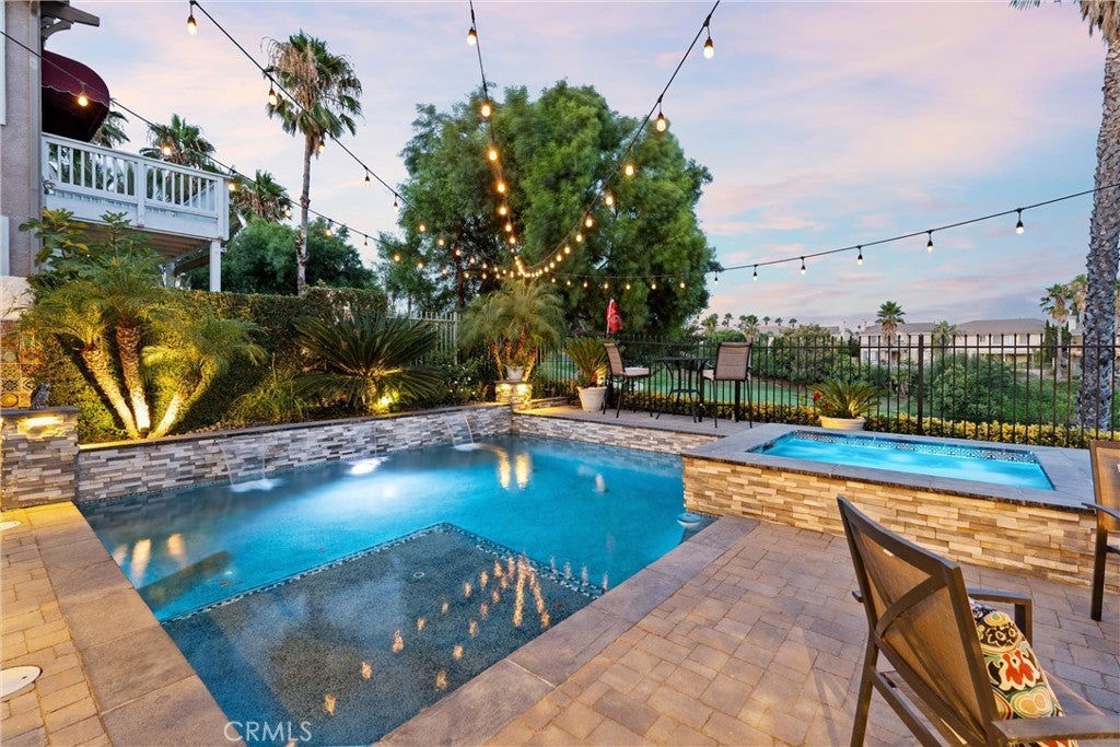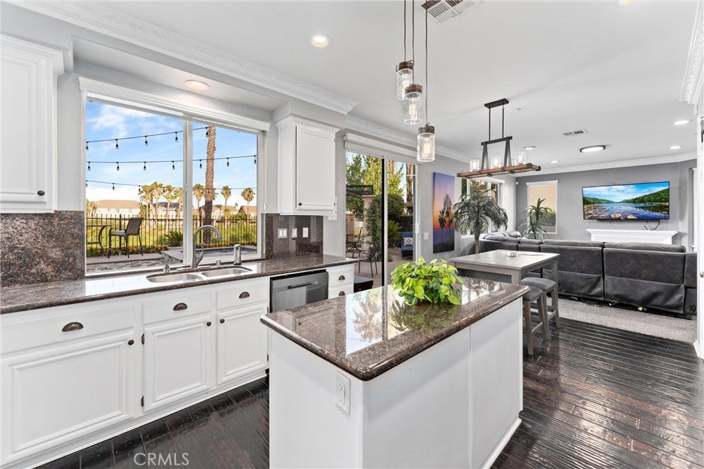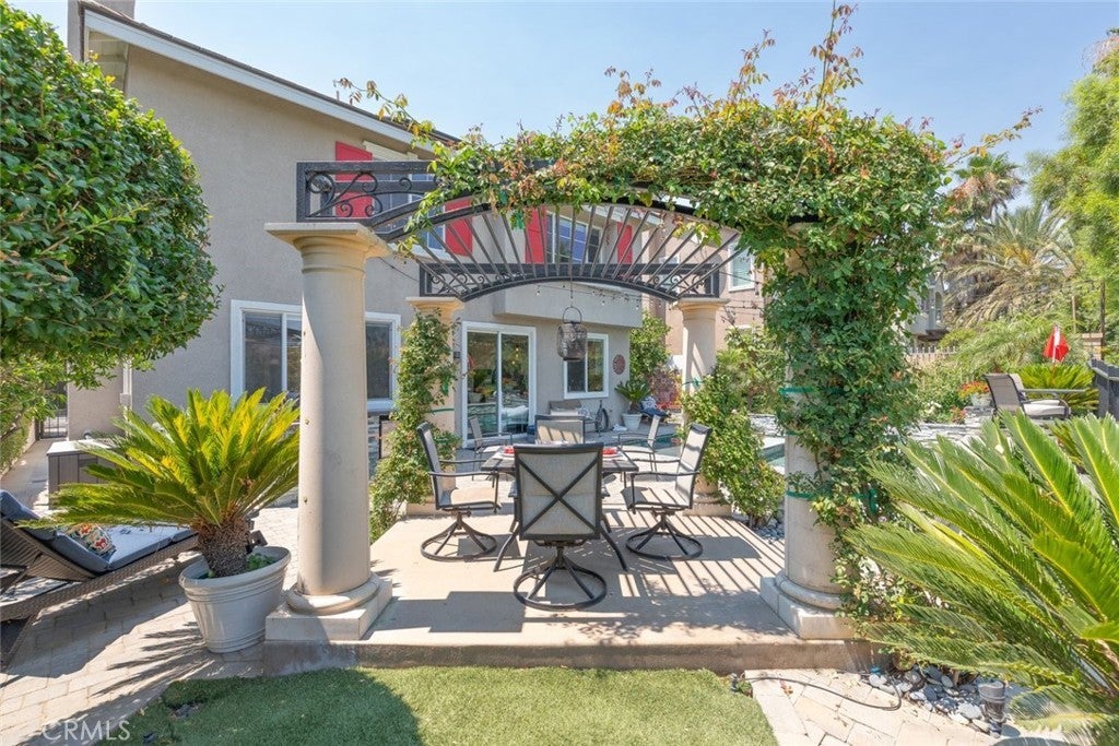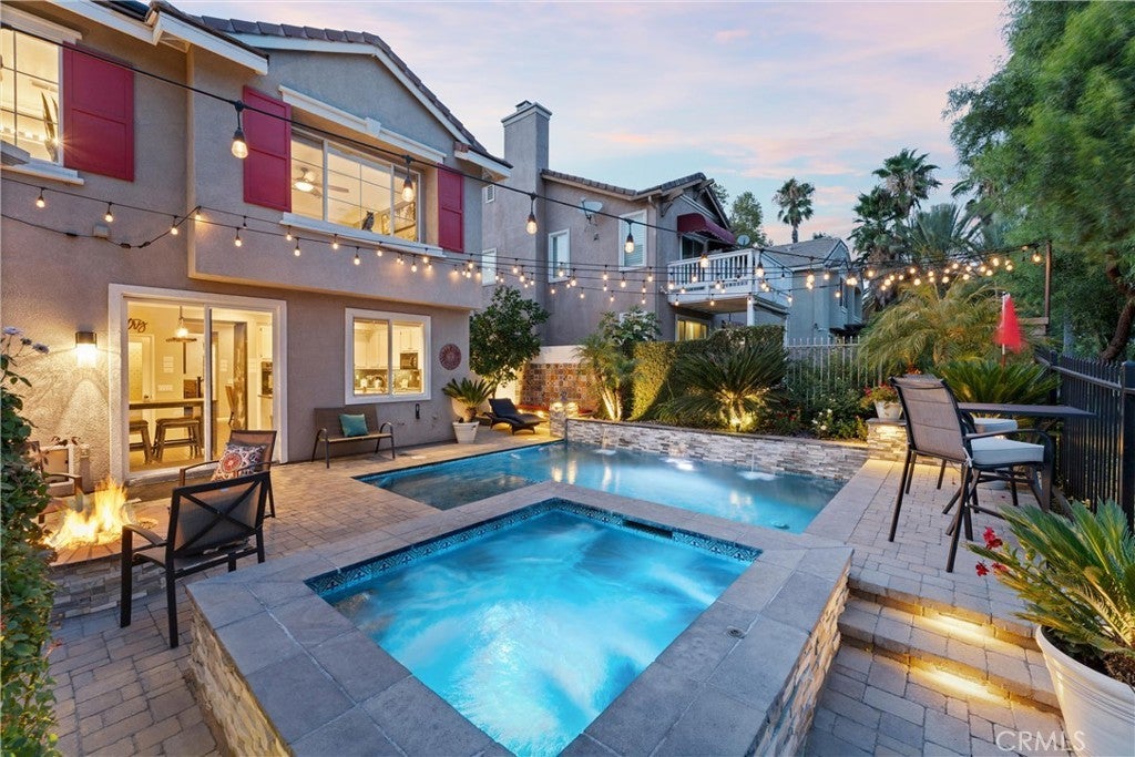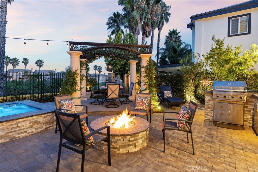 Welcome to this beautiful pool home in a premier community on the Sierra Lakes Golf Course! This stunning 4-bedroom, 3-bathroom home offers luxury and resort-style living. Located on the signature hole #6, which boasts a large water feature with a stunning fountain, and offering the most breathtaking view in the neighborhood, this property is a rare find for those seeking elegance. Step inside to discover a thoughtfully designed interior with custom crown molding and rich wood flooring throughout. The formal dining room, featuring a striking decorative stone wall and custom chandelier, is perfect for hosting dinner parties. A separate formal living room adds sophistication, while the cozy family room with a fireplace invites relaxation. Upstairs, a built-in desk provides a convenient workspace, and select furniture is included for a seamless move-in. The upgraded kitchen is a chef’s delight, boasting a double oven, walk-in pantry, custom lighting, and all appliances, including the refrigerator. The downstairs powder room impresses with a modern floating vanity, and the upstairs primary suite offers a serene retreat with custom ceiling fans for added comfort. The upstairs laundry room, complete with a sink, ample storage, washer, and dryer, makes chores a breeze. Outdoor living is where this home truly shines. The backyard is an entertainer’s paradise, featuring a built-in barbecue with refrigerator and sink, covered gazebo, fire pit, and a sparkling saltwater pool with waterfalls, controlled by a Pentair system via a phone app. Unwind in the jacuzzi or tend to the herb garden in the expansive side yard, dotted with grapefruit, orange, and lime trees. The beautifully landscaped grounds enhance the stunning views, making every day feel like a vacation. Practical features include a two-car garage with overhead storage, a solar system with battery backup, a Tesla 220V charging system, and a tankless water heater. The HVAC system is serviced annually for peace of mind, and new window screens add a fresh touch. Stay connected with a smart sprinkler system and secure with a Vivant security system, both app-controlled. Community amenities elevate the lifestyle, with a clubhouse just a two-minute walk away, offering Sunday brunch rated #2 in the Inland Empire. Golf enthusiasts will love the top-ranked Southern California golf course, a true golfer’s paradise.