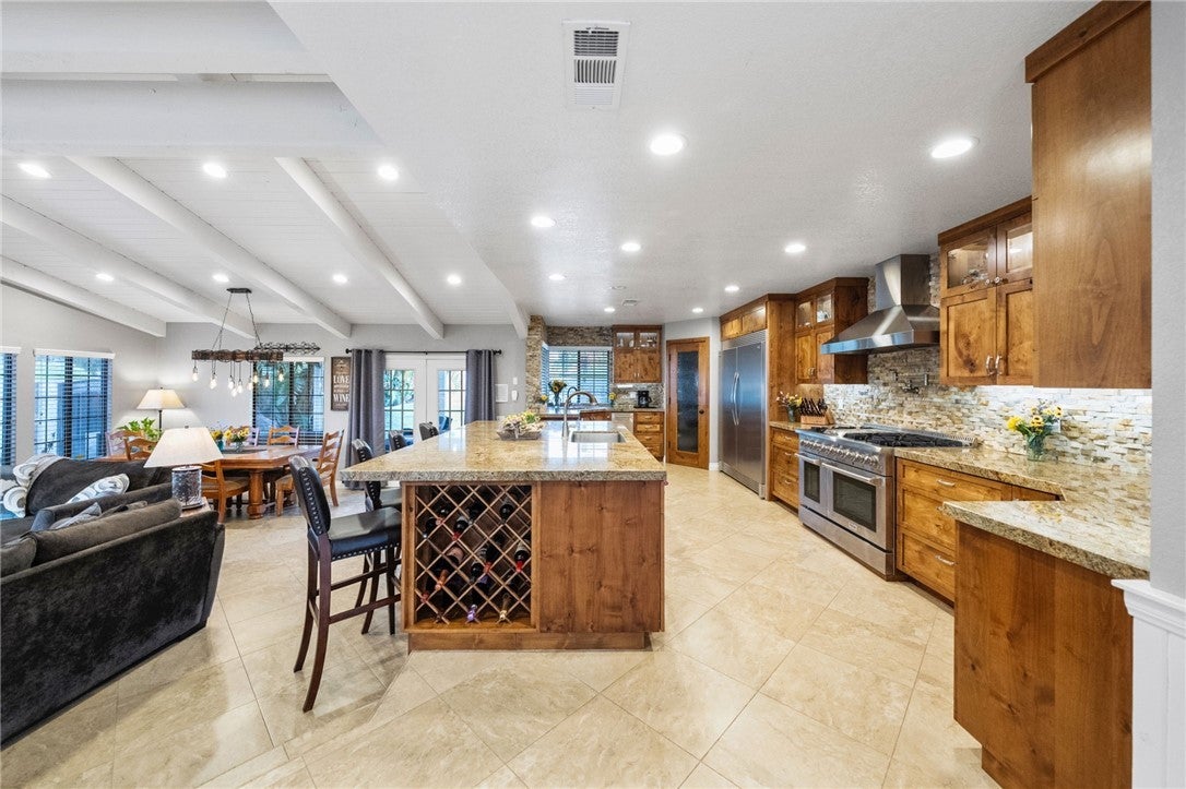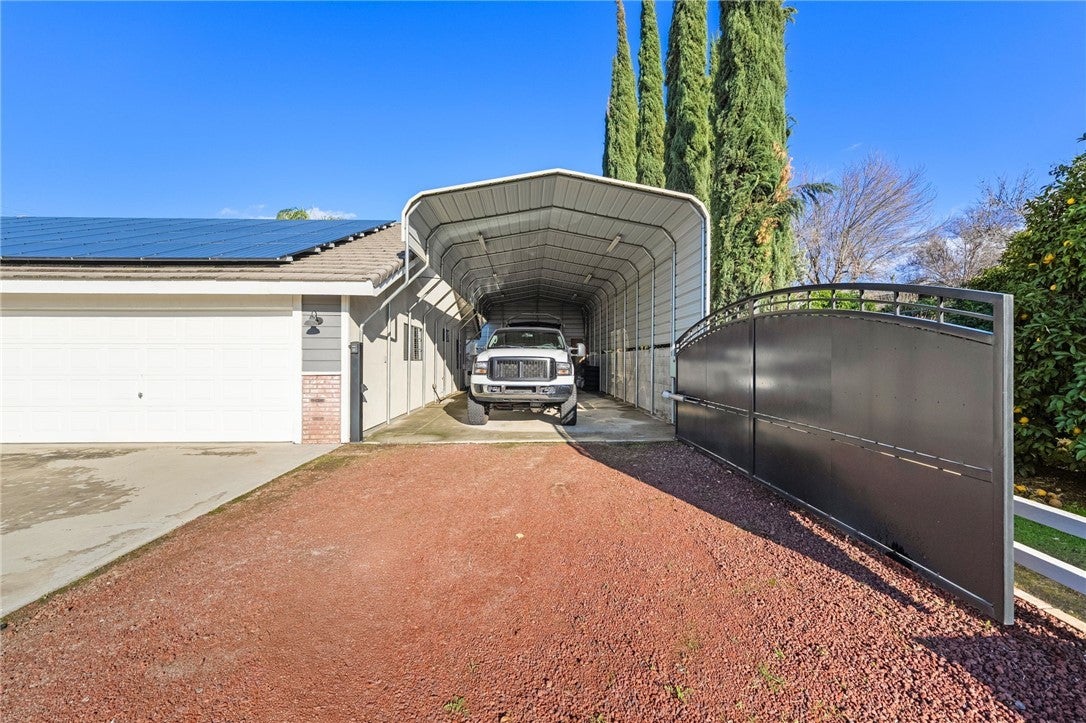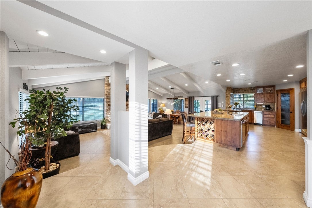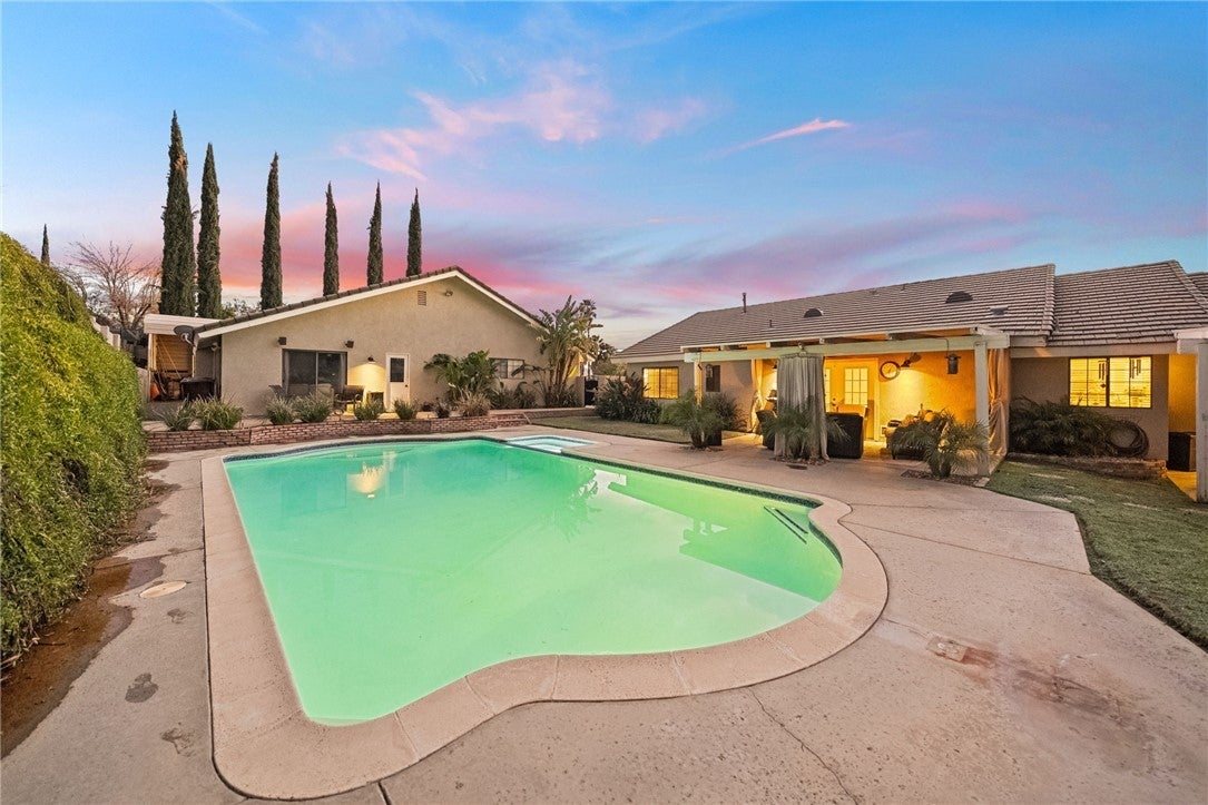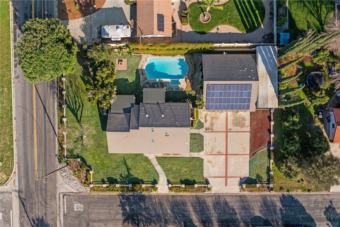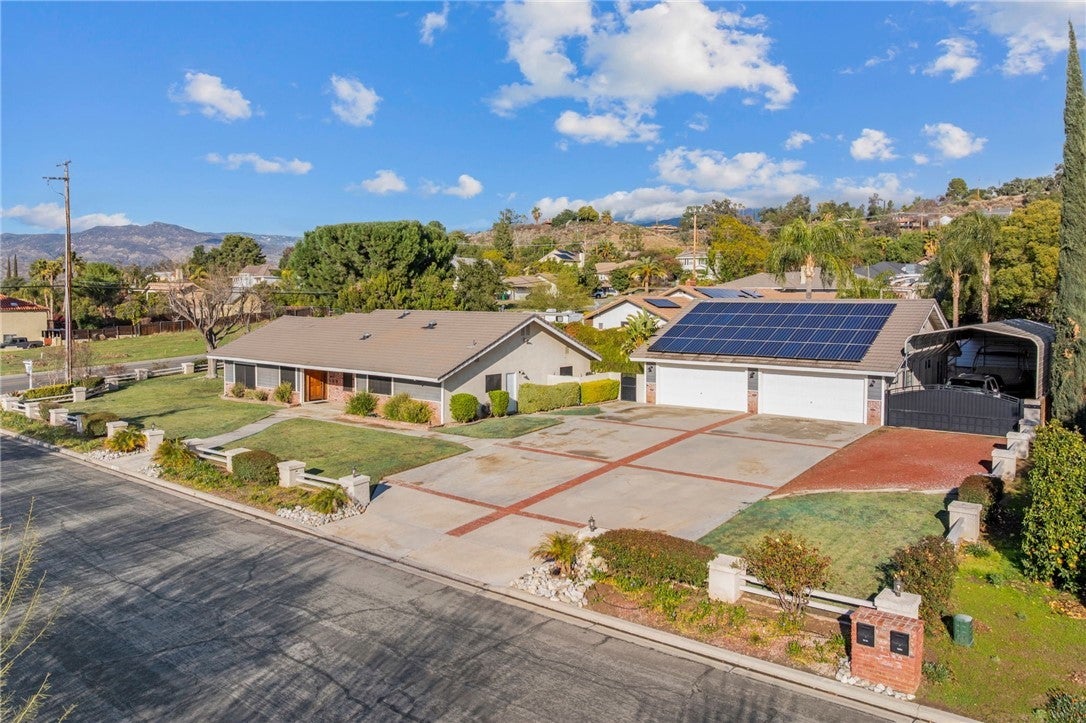 Welcome to this stunning and meticulously upgraded 3,007 sq. ft. custom estate located adjacent to the picturesque orange groves of East Hemet. Nestled on a spacious .46-acre corner lot, this property features four bedrooms, three bathrooms, and a thoughtfully designed ADU—perfect for multi-generational living. Step inside to be greeted by vaulted, beamed ceilings in the living room, creating an inviting and airy ambiance. The heart of the home is the chef’s gourmet kitchen designed for culinary enthusiast, featuring a seamless single-slab granite countertop, a large island with ample storage, custom soft-close cabinetry, a stylish rock backsplash, a pot filler, and premium stainless steel appliances, including a double oven range, two dishwashers, and a trash compactor. A turntable organizer maximizes storage efficiency, while under-cabinet lighting and upper glass cabinets with interior lighting add a touch of elegance. All bedrooms are generously sized, with ceiling fans, walk-in closets, and the capacity to comfortably accommodate king-size beds. The primary suite is a true retreat, boasting crown molding and a spa-like en-suite bath with dual vanities and an oversized shower featuring dual shower heads. Throughout the home, you’ll find a mix of plush carpet and 20” diagonally laid tile flooring, offering both comfort and style.This home is wired for modern convenience, with an intercom system that extends to the exterior ADU, ethernet wiring throughout, and a whole-house attic fan. Energy-efficient upgrades include a tankless water heater, a reverse osmosis system, and fully paid solar system. The ADU is approx. 800 sq. ft. and fully equipped with a kitchenette, bar area, oven, dishwasher, sink, full bathroom, bedroom, and a cozy living space—ideal for guests or extended family. The property’s exterior is equally impressive, featuring a four-car garage with epoxy flooring, built-in cabinetry, a workbench, dog washing station and Wi-Fi-enabled doors. A covered RV parking area includes remote gate access, 220V power, and full sewer and water hookups. Outdoor living is an entertainer's dream with a covered patio, a gas fire pit, and a sparkling salt water pool and Jacuzzi with app-controlled operation and newer equipment. Exterior landscape lighting enhances the ambiance, while the permanent holiday lighting package adds charm year-round. With modern upgrades completed recently, including updated plumbing, electrical, this home is truly move-in ready.