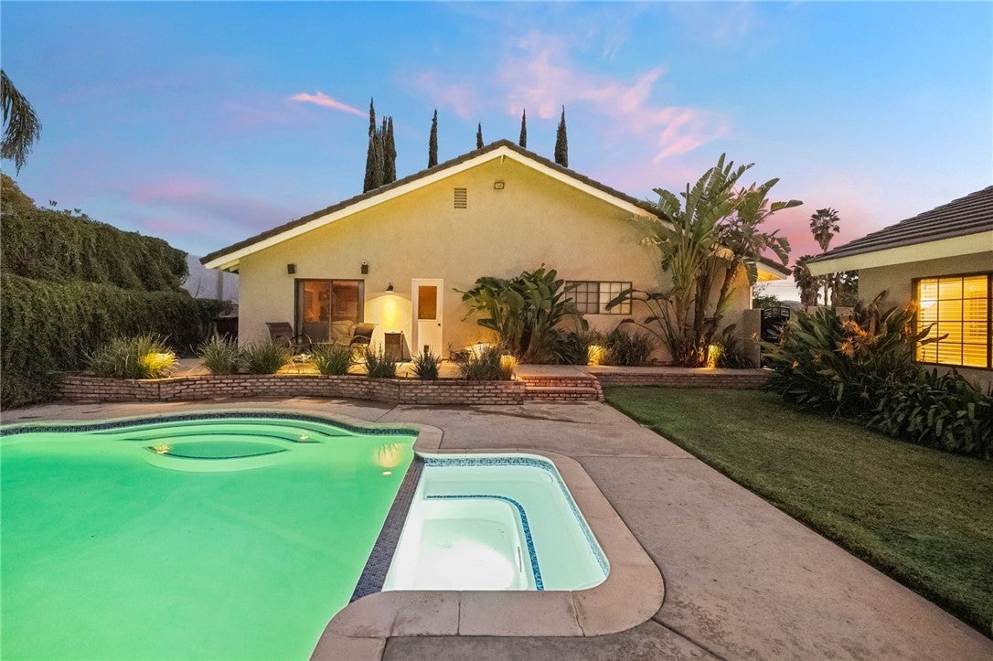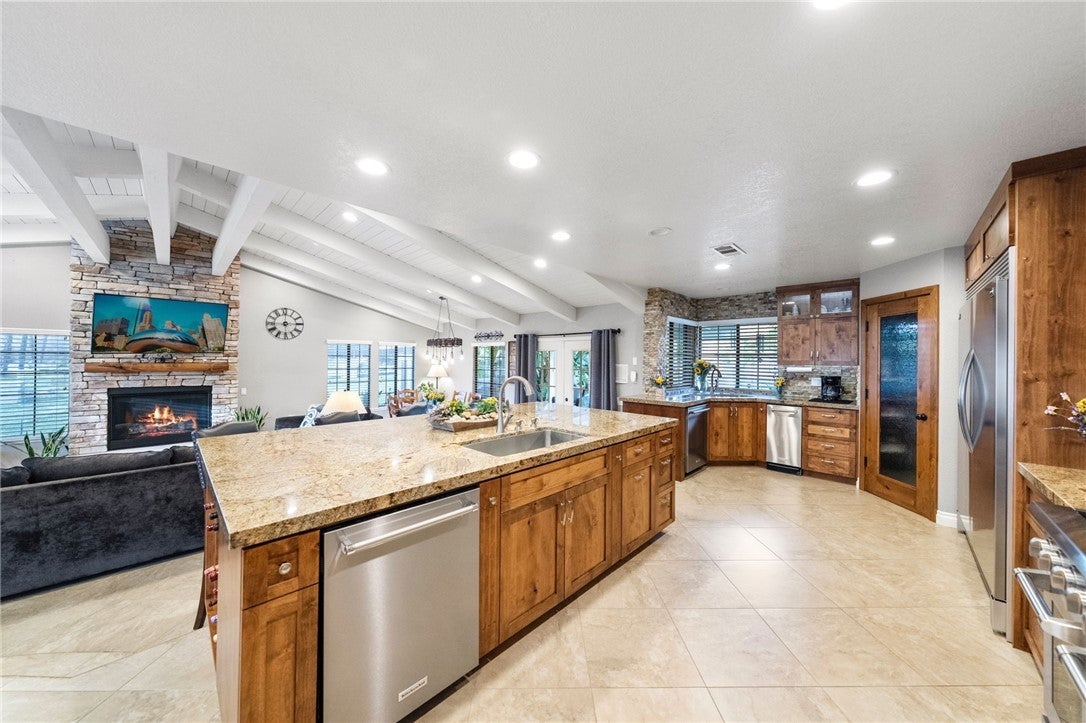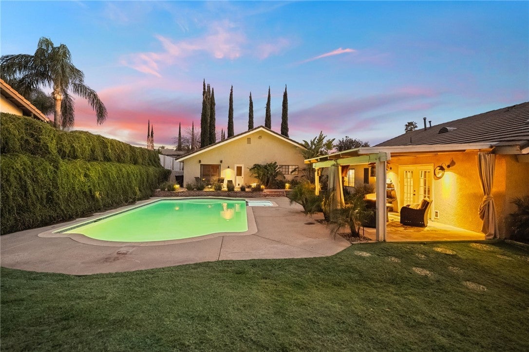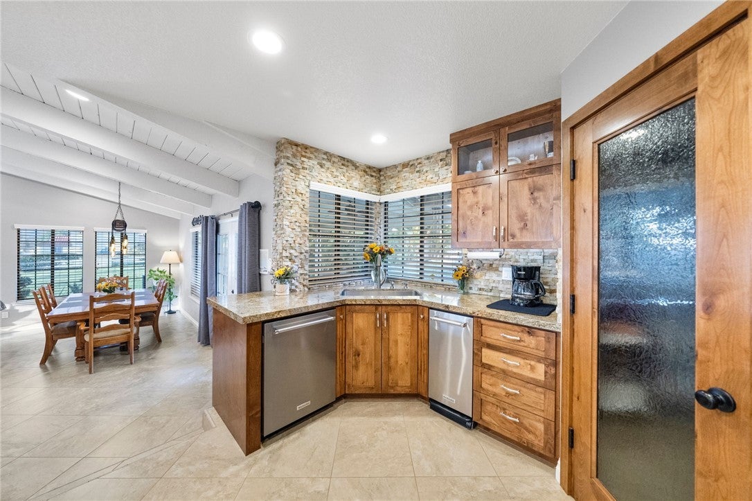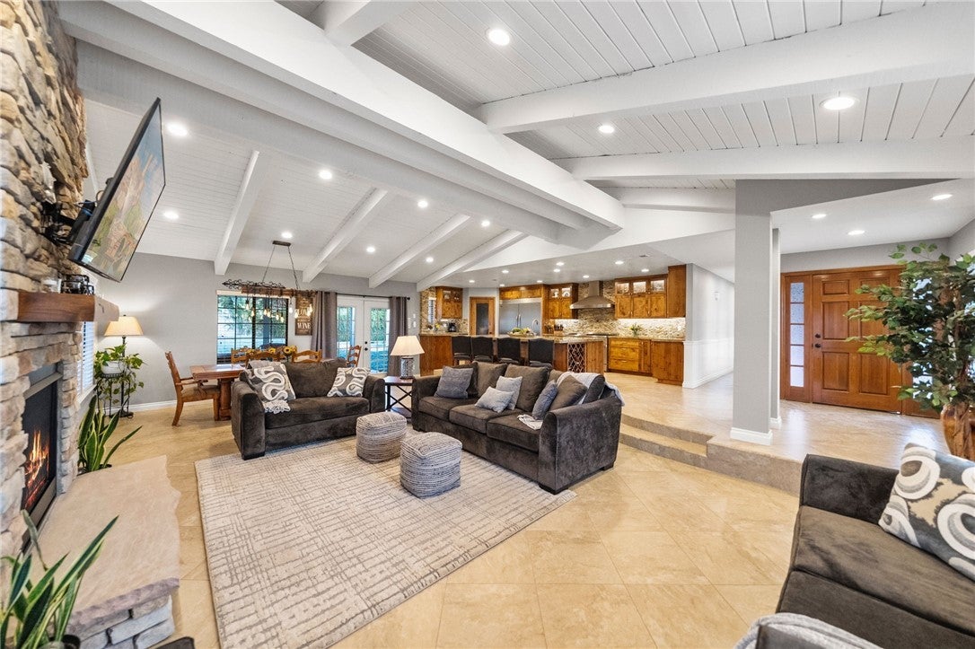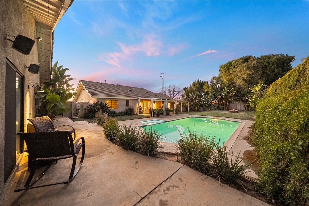 Welcome to this stunning and meticulously upgraded 3,007 sq. ft. custom estate located adjacent to the picturesque orange groves of East Hemet. Nestled on a spacious .46-acre corner lot, this property features four bedrooms, three bathrooms, and a thoughtfully designed ADU—perfect for multi-generational living. Step inside to be greeted by vaulted, beamed ceilings in the living room, creating an inviting and airy ambiance. The heart of the home is the chef’s gourmet kitchen designed for culinary enthusiast, featuring a seamless single-slab granite countertop, a large island with ample storage, custom soft-close cabinetry, a stylish rock backsplash, a pot filler, and premium stainless steel appliances, including a double oven range, two dishwashers, and a trash compactor. A turntable organizer maximizes storage efficiency, while under-cabinet lighting and upper glass cabinets with interior lighting add a touch of elegance. All bedrooms are generously sized, with ceiling fans, walk-in closets, and the capacity to comfortably accommodate king-size beds. The primary suite is a true retreat, boasting crown molding and a spa-like en-suite bath with dual vanities and an oversized shower featuring dual shower heads. Throughout the home, you’ll find a mix of plush carpet and 20” diagonally laid tile flooring, offering both comfort and style.This home is wired for modern convenience, with an intercom system that extends to the exterior ADU, ethernet wiring throughout, and a whole-house attic fan. Energy-efficient upgrades include a tankless water heater, a reverse osmosis system, and fully paid solar system. The ADU is approx. 800 sq. ft. and fully equipped with a kitchenette, bar area, oven, dishwasher, sink, full bathroom, bedroom, and a cozy living space—ideal for guests or extended family. The property’s exterior is equally impressive, featuring a four-car garage with epoxy flooring, built-in cabinetry, a workbench, dog washing station and Wi-Fi-enabled doors. A covered RV parking area includes remote gate access, 220V power, and full sewer and water hookups. Outdoor living is an entertainer's dream with a covered patio, a gas fire pit, and a sparkling salt water pool and Jacuzzi with app-controlled operation and newer equipment. Exterior landscape lighting enhances the ambiance, while the permanent holiday lighting package adds charm year-round. With modern upgrades completed recently, including updated plumbing, electrical, this home is truly move-in ready.