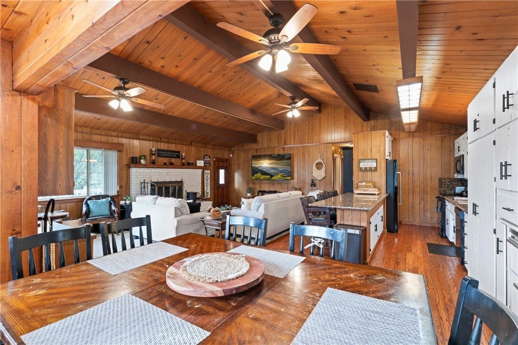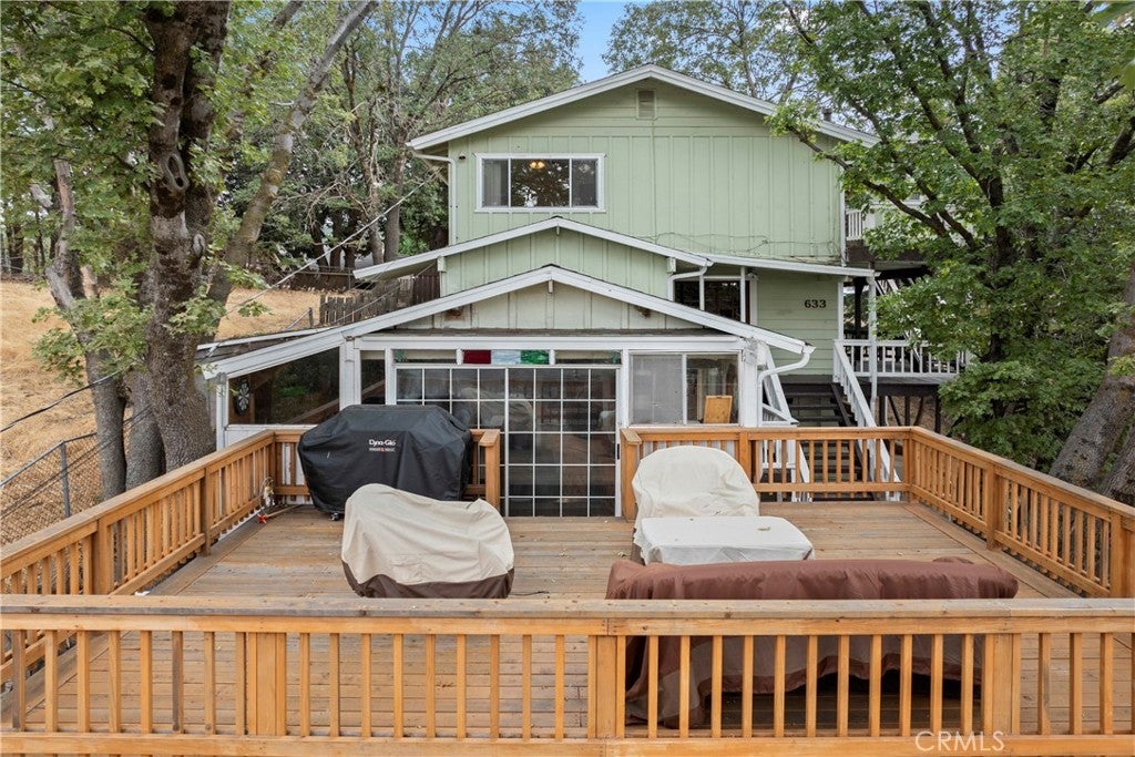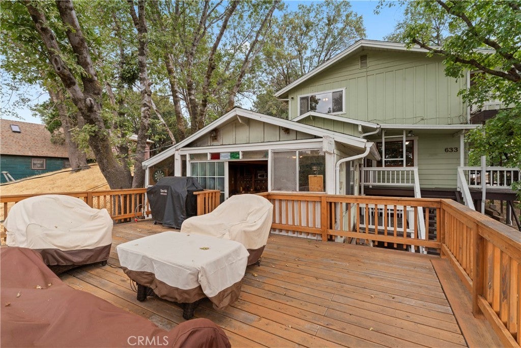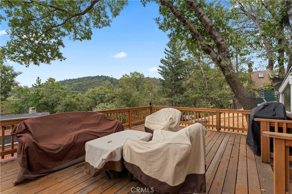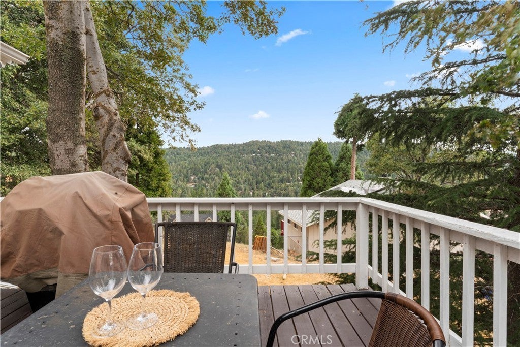 Your Mountain Retreat Awaits. Dreaming of a peaceful mountain getaway with room for everyone? This inviting home blends warmth, comfort, and breathtaking views. Step inside and unwind by the cozy brick fireplace, the perfect spot for winter evenings after a day outdoors. The main level offers a spacious game room, three bedrooms, one and a half baths, and brand new laminate flooring - ideal for family gatherings or weekend guests. Upstairs, light floods into the expansive living and dining area, designed with sweeping vistas to frame your every day. The master suite opens onto a private deck, where you can sip your morning coffee while soaking in the mountain air. A guest room and additional full bath add even more flexibility for family and friends. The heart of the home, the kitchen, features freshly painted cabinets, granite countertops, and a generously sized eating island, perfect for both casual meals and entertaining. Recent upgrades include a new deck, roof and paint. Outdoor living truly shines here with a large entertainment area complete with an outdoor kitchen, bar, and multiple balconies - your own private setting for unforgettable summer evenings under the stars. Centrally located near Lake Gregory, Lake Arrowhead, and popular mountain attractions, this home delivers the serene mountain lifestyle you’ve dreamed of, with convenience never far away.