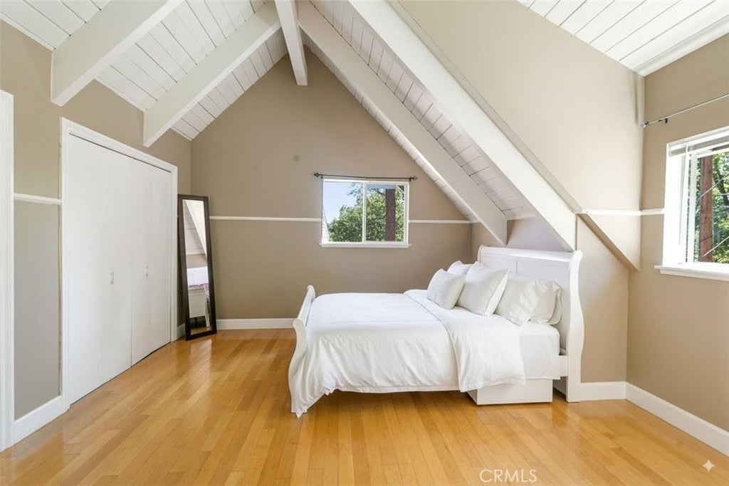 She's back on the market after the sellers rented her but decided to sell - this may well be the absolute best value Lake Rights home available! This adorable, 60s cabin-style home offers the perfect trifecta of mountain home features: level entry, Lake Rights, an attached 2 car garage! It is also within walking distance to Tavern Bay Beach Club and UCLA Conference center. Truth be told, this particular combination of features is very rare in the mountains (especially at this price point) and something you only truly appreciate in the winter months when Lake Arrowhead transforms into a snowy winter wonderland so ease of access and keeping your car(s) out of the cold, wind and snow is *everything*. Talking of snow, this sizable, almost 8,800 sq ft lot means you have a wonderfully spacious backyard space that’s gently sloped, unlike most mountain homes where it can be terrifyingly steep, and therefore it is absolutely perfect for entertaining friends and family in the summer or for your sledding adventures in the winter - happy memories just waiting to be made that'll last a lifetime. The sizable, recently repainted balcony offers an awe-inspiring view that lifts the spirits as soon as you step out onto it and gives you an almost otherworldly feeling of being immersed in the forest. Take a nice deep breath and enjoy that mountain zen on a daily basis while you sip your morning coffee or a glass of chilled wine while watching the sun go down. You’ll love the stunningly high cathedral ceilings too and cosy brick fireplace in the living room and downstairs bedroom that lend much character and warmth to the home. The primary bedroom is conveniently located on the main level, making it an ideal choice for those who want to avoid endless steps which you often find with mountain homes. Fully maintained county road too so no ploughing for you and added reassurance during winter! The high quality kitchen features granite countertops, custom cabinetry and flows nicely into the Living Room giving a spacious and open feel that's perfect for entertaining. With a bathroom on each level and a separate deck off the lower level, it is ideal for hosting your friends and family to celebrate special occasions, the holidays or just quality time in tranquil surroundings. To top it all off, the front yard is immaculately maintained and offers such a cute and timeless curb appeal that's also easy to maintain. Come and explore one of the best homes Lake Arrowhead has to offer!