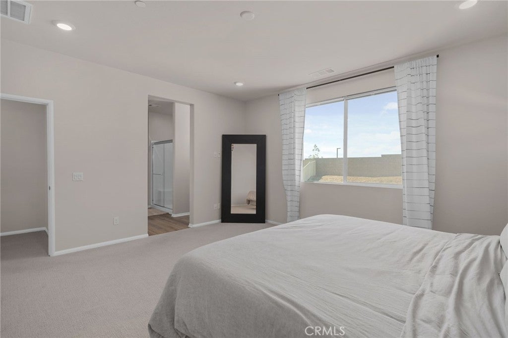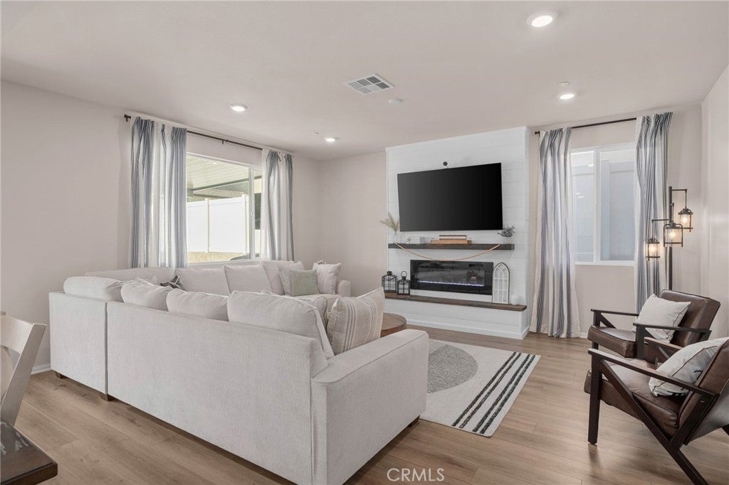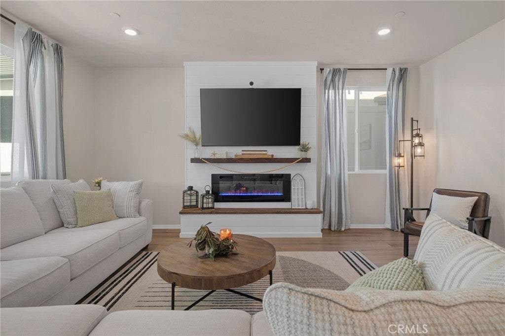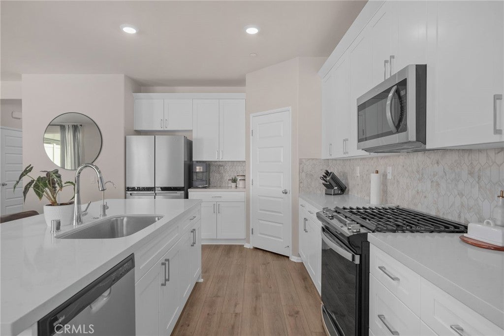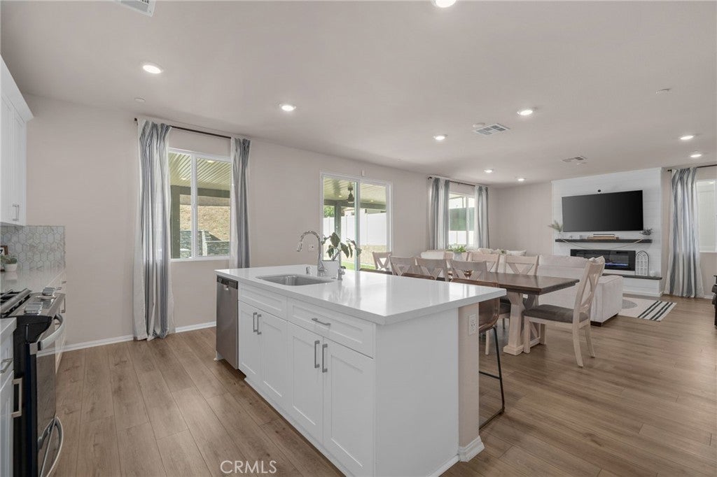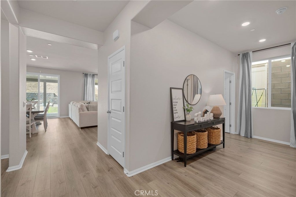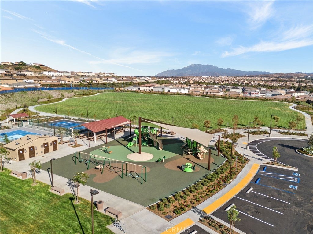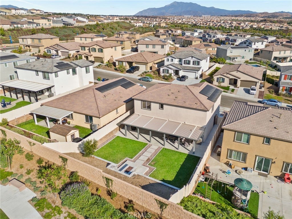 This stunning home boasts excellent curb appeal, pristine upkeep, and low-maintenance landscaping, all with a beautiful view of the local mountains. One of its most valuable features? A fully paid-off solar system—providing significant energy savings from day one with no lease or loan to assume! Step inside through the elongated entryway to find stylish LVP flooring that flows throughout the main level. A versatile den or home office sits near the front of the home, along with a guest bedroom and a full bathroom featuring a charming shiplap accent wall. The spacious family room is the heart of the home, showcasing a cozy fireplace framed with a custom shiplap enclosure. The open-concept kitchen overlooks the family room and dining area, offering a large kitchen island, quartz countertops, porcelain tile backsplash, walk-in pantry, and built-in cooktop—perfect for both everyday living and entertaining. Upstairs, you’ll find a massive loft, an oversized primary bedroom retreat with a deep walk-in closet, and a spa-like primary bath with a walk-in shower. Three additional bedrooms, a bathroom with dual sinks, and a convenient upstairs laundry room complete the second floor. The backyard is an entertainer’s dream, featuring a large covered patio with lighting and ceiling fans, stamped concrete, a built-in fire pit, rock wall, lush green grass, and beautiful landscaping. A 3-car tandem garage offers plenty of parking and storage space. Best of all, this home backs up to a large park with a walking trail, sports court, and playground—perfect for outdoor enjoyment. Immaculately maintained inside and out, this property showcases true pride of ownership. With the added bonus of fully paid-off solar, this home is not only beautiful—it's energy efficient and cost-effective for years to come! This vibrant new community offers an array of amenities, including swimming pools, a splash pad, playground, scenic walking trails, a sports court, fitness center, clubhouse, and so much more!