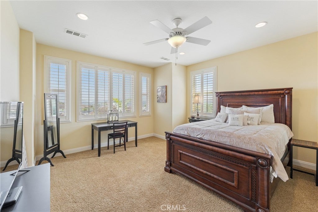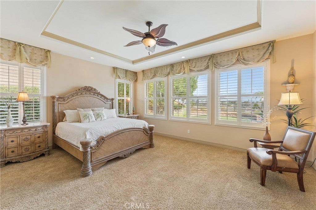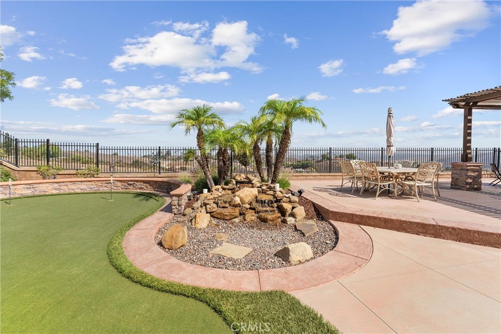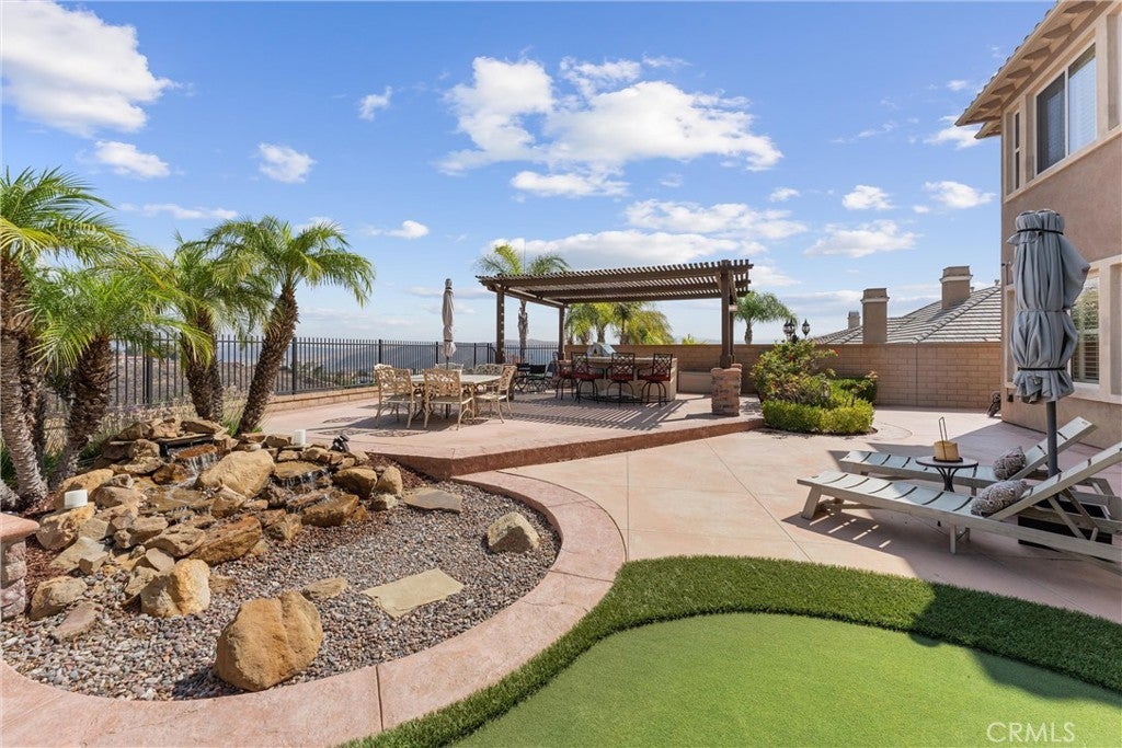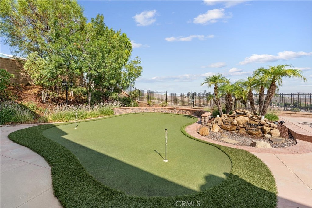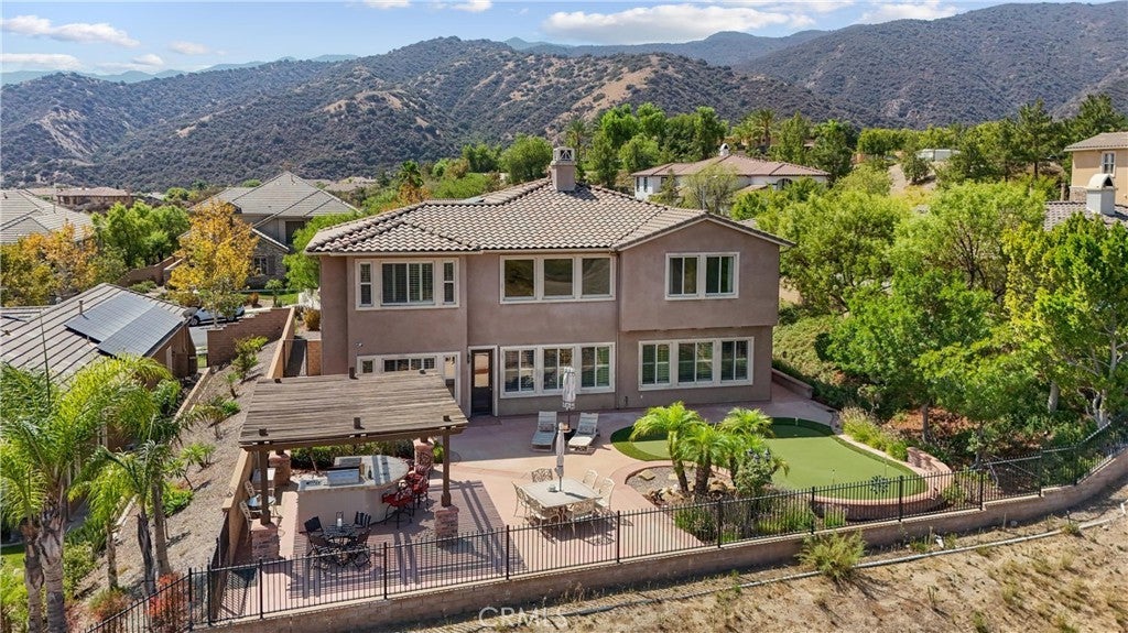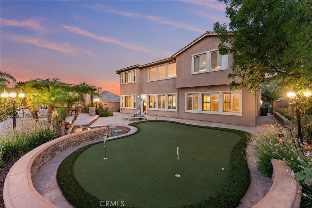 5 BEDROOMS (INCLUDING DOWNSTAIRS PRIMARY + 3 SUITES) | 3-CAR GARAGE | Welcome to this prestigious executive estate, nestled in the sought-after Retreat Community where privacy, elegance, and refined living define everyday life. Enter through the oversized private courtyard and step into the grand formal entry, where soaring ceilings, custom mosaic tile, art display niches, wood flooring, and a sweeping staircase set the tone for timeless sophistication. The open-concept Family Room is both inviting and refined, boasting a gas fireplace, custom drapes, plantation shutters, and seamless access to the backyard. The chef’s Kitchen is designed for the culinary enthusiast, featuring an oversized island with breakfast bar seating, pantry, granite countertops, stainless steel appliances, butler’s pantry, pot and pan drawers, and coffee station, all flowing into the formal Dining Room. French doors from the formal Dining Room open to front courtyard for effortless entertaining. A bonus Living Room offers versatility as a music room, office, or more gathering space. The main-level Primary Ensuite Bedroom is a true retreat, highlighted by coffered ceilings, private sitting area, and serene views. The spa-inspired Primary Ensuite Bathroom features dual vanities, a deep soaking tub, oversized walk-in shower with bench, make-up vanity, and a custom walk-in closet with center island. Upstairs, 4 additional bedrooms offer unparalleled comfort. Bedroom #2 is oversized with its own bathroom and walk-in closet. Bedroom #3 features French doors and a full bath with granite counters. Bedroom #4, currently an office, includes its own ensuite and private balcony with sunrise views. Bedroom #5 completes this wing, ideal for multi-generational living. A separate Laundry Room with sink, cabinetry, and folding station adds convenience. The backyard is an entertainer’s paradise, complete with custom hardscape, stone waterfall, artificial turf, four-hole putting green, built-in BBQ with sink, refrigerator, and bar seating, all framed by low Maintenace wrought iron and block fencing. ENERGY EFFICIENCY: Solar panels, recessed lighting, & ceiling fans add efficiency to unmatched elegance. AMENITIES: Community pool, playground, basketball court, & fireplace. LOCATION: Quick access to 15 Expressway, 91 & 71 Freeways, & 241 Toll Road. This home is more than a residence—it’s a statement of luxury living.