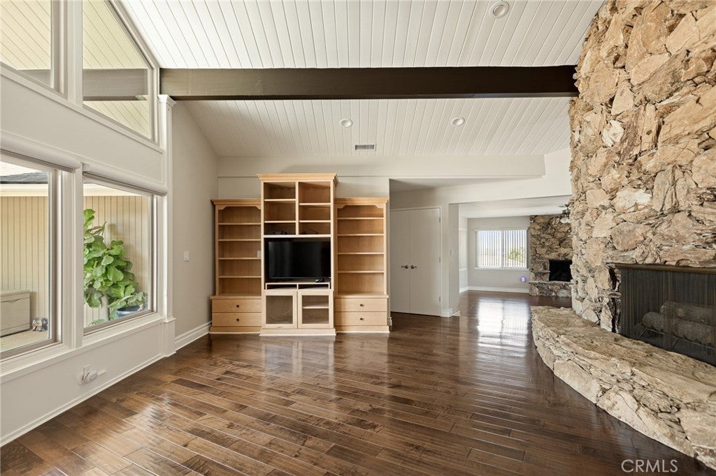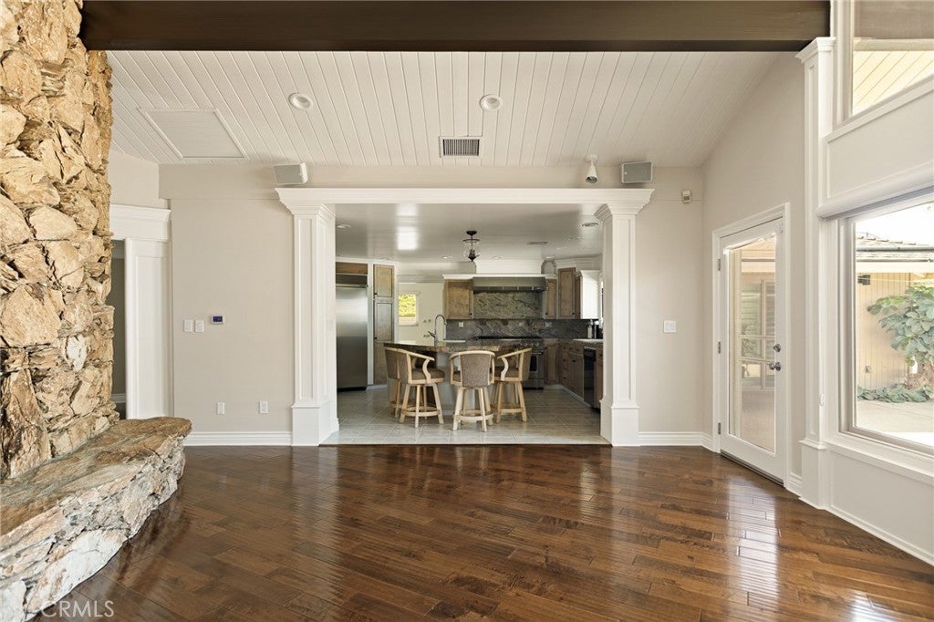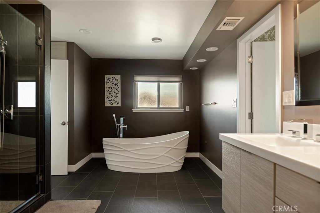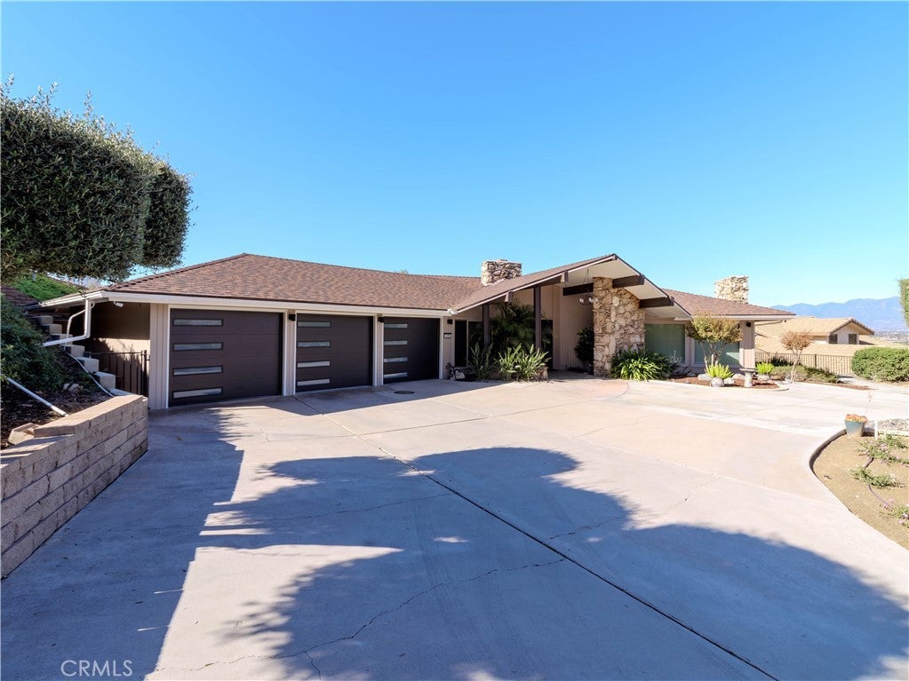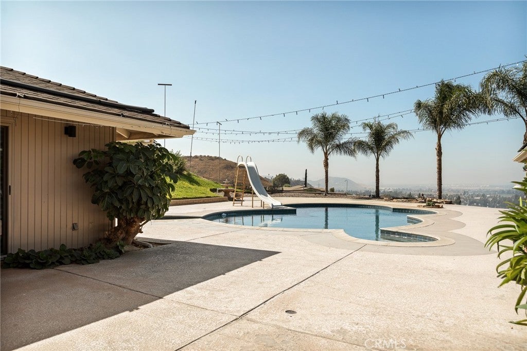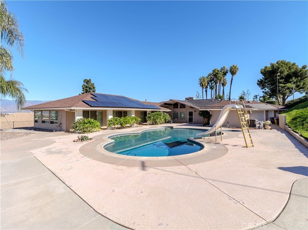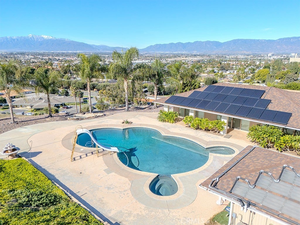 Experience luxury living at its finest in this beautifully updated mid-century modern home. Nestled in the desirable Indian Knolls hillside, just minutes from Loma Linda University, with convenient access to both I10 and the 215 freeways. Step thru the elegant double glass door entry into an expansive living space filled with natural light. The home's open beam ceilings create an airy, architectural feel that perfectly complements its mid-century modern design. The thoughtfully designed floor plan wraps around the stunning backyard pool area, creating a seamless indoor-outdoor flow ideal for entertaining or relaxing in privacy. The spacious living room features a cozy fireplace and large windows framing spectacular views of the mountains and city lights. Down the extra wide hallway, lined with cabinets, large windows overlooking the pool, are three spacious bedrooms and two beautifully remodeled bathrooms, including a luxurious primary suite with a walk-in shower and breathtaking views. Huge closets in the master have cabinetry and are fully mirrored. On the opposite wing, enjoy a family room with a classic rock fireplace and hearth. The gourmet kitchen showcases an 8 burner Kucht professional range, double ovens, a massive granite island with seating, abundant cabinets and desk space. The Dining room is adjacent and overlooks the peaceful, quiet front entrance. A private fourth bedroom and bath are on the South side has both private entry and sliding door to the pool. The large laundry room with sink offer a perfect setup for multi-generational living or guests. Garage access is through the laundry room. Throughout the home, high ceilings, crown molding, hardwood floors, and custom built storage add sophistication and function. Nearly every detail has been updated, including windows, interior and exterior doors. There are two separate (paid for) solar systems for the home and pool. Detailed attention was given to insure functionality, energy efficiency and low maintenance. A three car garage with separate doors and car charge capacity complete this exceptional home. Outside, the fully fenced and gated property offers peace, privacy and fantastic views.