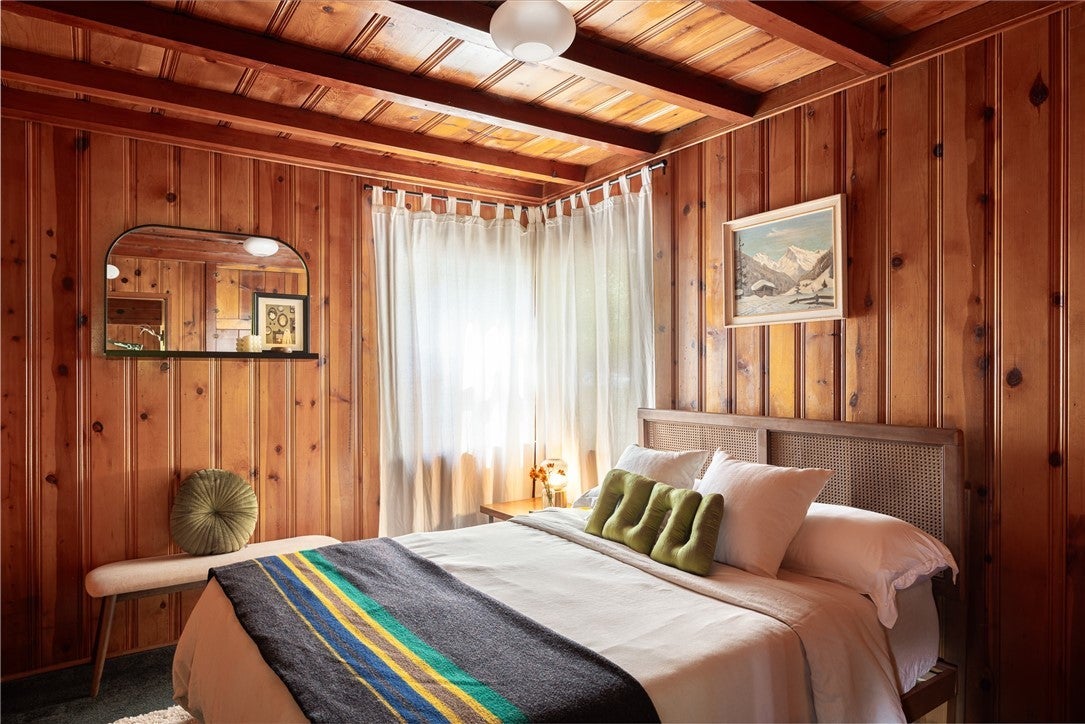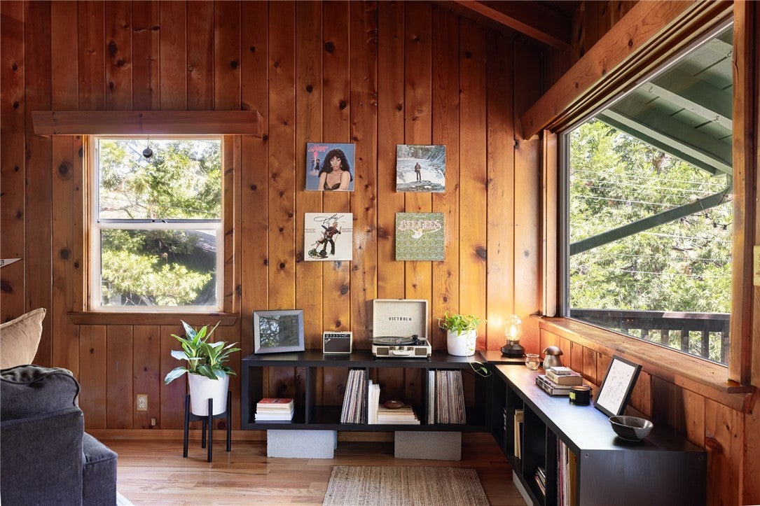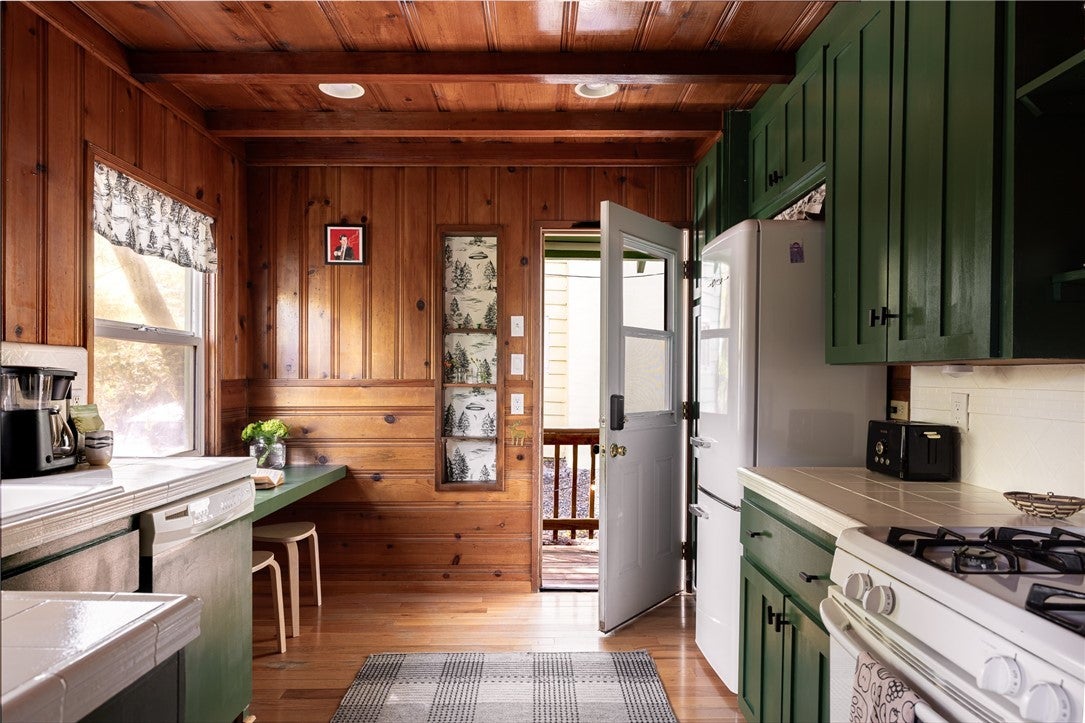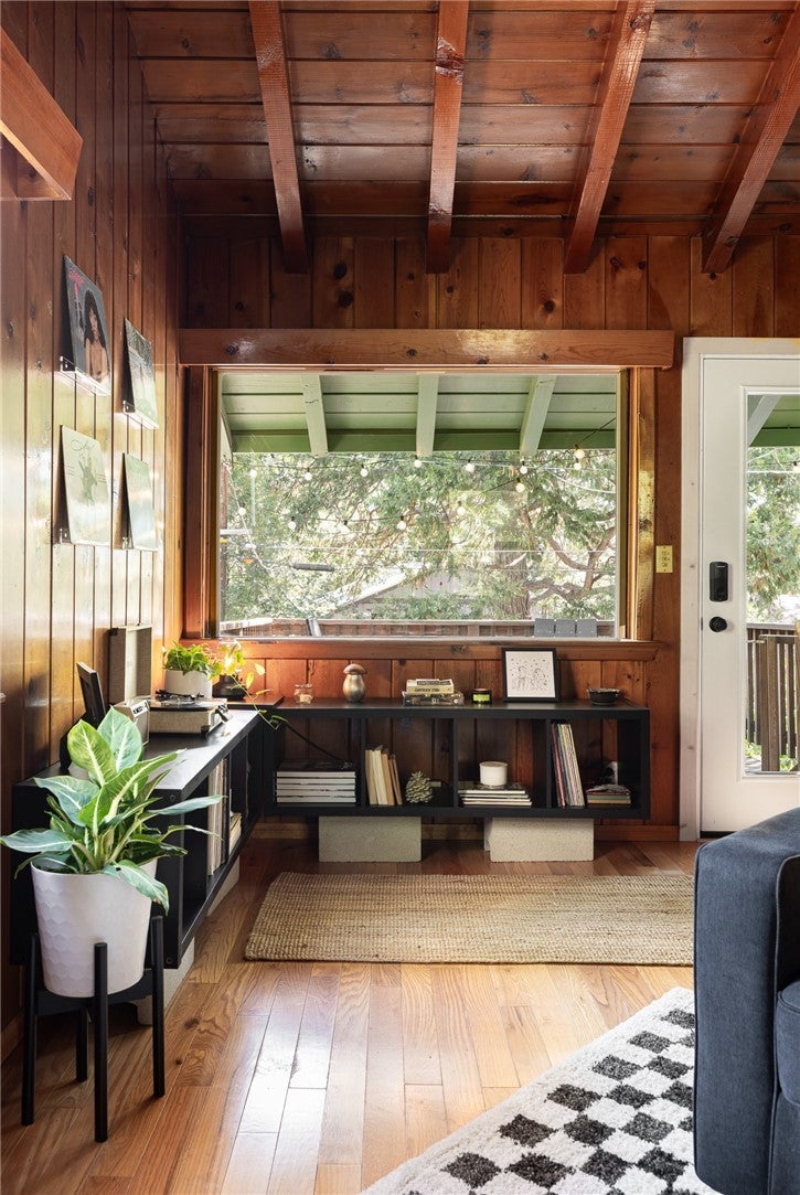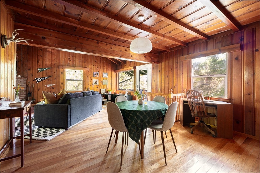 A dream 1940s cabin in the woods! Tucked away behind lush, green landscaping that offers both privacy and plenty of natural light, this enchanting cabin is the perfect retreat. Step through the front door into a cozy kitchen featuring freshly painted cabinets, a charming vintage-inspired fridge, and a sweet built-in breakfast nook—ideal for enjoying morning coffee and a good book. Gorgeous wood paneling and hardwood floors run throughout, adding warmth and character. The open-concept living and dining space is centered around a stunning brick fireplace. A sunny corner with a large picture window—currently used as a music nook—adds charm, while another well-lit workspace with a desk makes working from home a joy. The spacious bedroom offers ample storage and is conveniently located next to the vintage-style bathroom. Step out from the living room onto a large wood deck—perfect for lounging, entertaining, or gathering around the fire-pit on cool evenings. The backyard also has room to add an additional parking space if desired. Downstairs, a versatile bonus space with its own private entrance and patio presents an exciting opportunity—ideal for guests, a home studio, or even a rental investment. This lower level also includes a half bath and laundry area. This cabin is full of character, functionality, and potential—come see it for yourself!