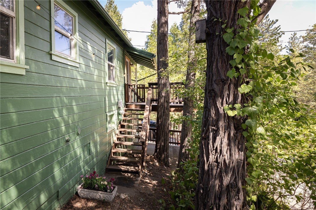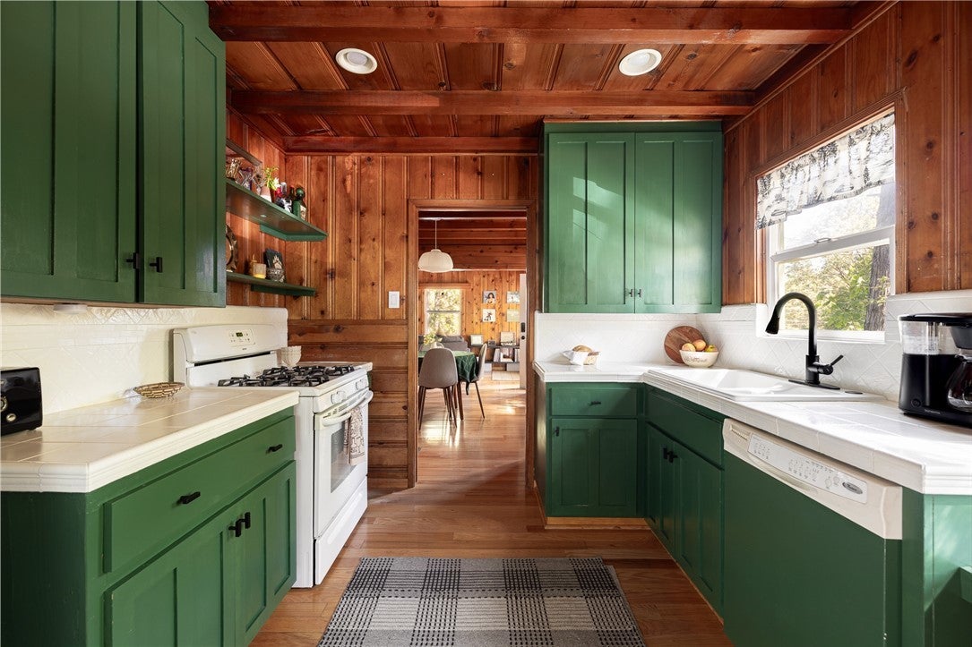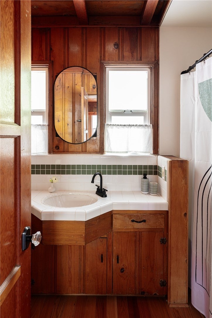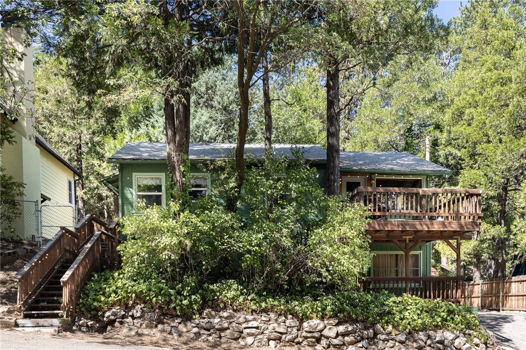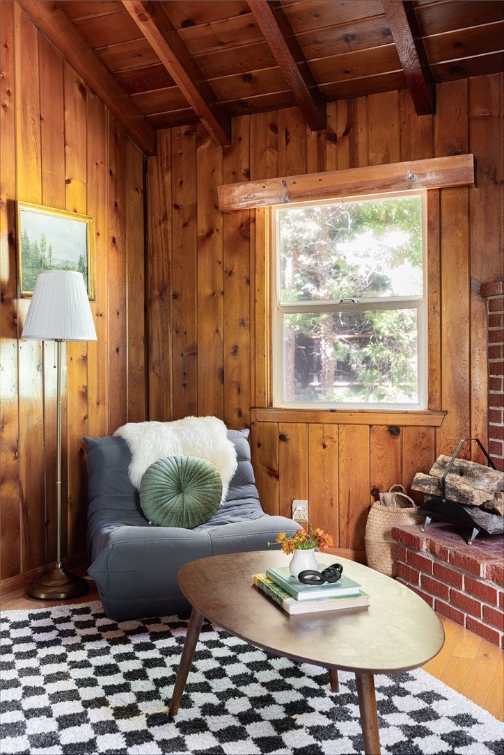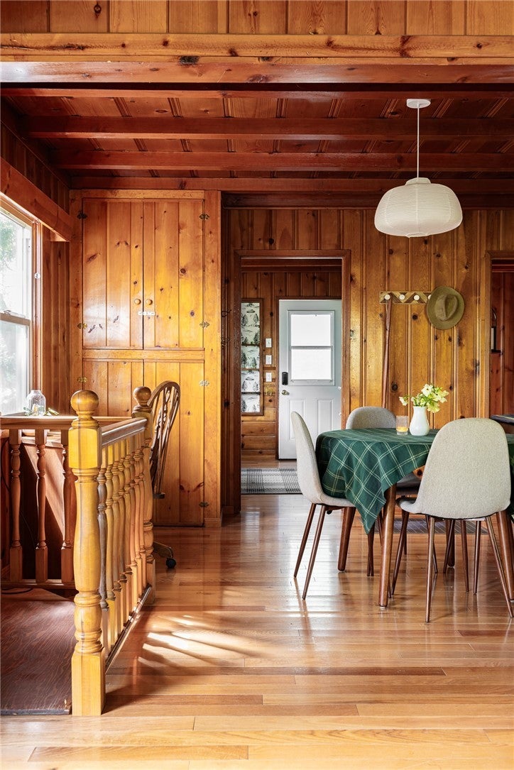 A dream 1940s cabin in the woods! Tucked away behind lush, green landscaping that offers both privacy and plenty of natural light, this enchanting cabin is the perfect retreat. Step through the front door into a cozy kitchen featuring freshly painted cabinets, a charming vintage-inspired fridge, and a sweet built-in breakfast nook—ideal for enjoying morning coffee and a good book. Gorgeous wood paneling and hardwood floors run throughout, adding warmth and character. The open-concept living and dining space is centered around a stunning brick fireplace. A sunny corner with a large picture window—currently used as a music nook—adds charm, while another well-lit workspace with a desk makes working from home a joy. The spacious bedroom offers ample storage and is conveniently located next to the vintage-style bathroom. Step out from the living room onto a large wood deck—perfect for lounging, entertaining, or gathering around the fire-pit on cool evenings. The backyard also has room to add an additional parking space if desired. Downstairs, a versatile bonus space with its own private entrance and patio presents an exciting opportunity—ideal for guests, a home studio, or even a rental investment. This lower level also includes a half bath and laundry area. This cabin is full of character, functionality, and potential—come see it for yourself!