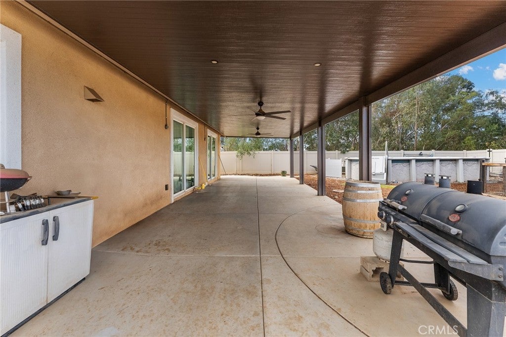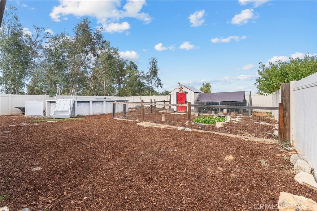 This beautiful upgraded single-story home sits on .86 of an acre at the end of the expansive cul-de-sac, offering a peaceful, private sanctuary. The interior features appealing upgrades, including tile floors, built-ins, and granite countertops, and with many special touches throughout. The great room boasts a fireplace, space for a big-screen TV, and adjoins the kitchen, which has a massive island, extra counter space, and plenty of cabinets. The floorplan is designed with three separate bedroom areas. A very large En-suite includes an adjoining bath with a soaking tub, separate shower, and walk-in closet. The shared En-suite consists of two good-sized bedrooms, a shared bathroom, and a built-in linen cabinet in the hallway. You will enjoy relaxing and entertaining on your covered patio. The huge backyard is fun filled with above ground pool, outbuilding that is currently the hens barn and additional fenced outdoor roaming area for the Hens. Tranquil pond with fish, and still plenty of room for your custom touches. The additional land has room for Horses and maybe a round pen, or your own vineyard, orchard or workshop or Sports area. Several possibilities for the RV's and Toys. You experience the quaintness of a neighborhood, yet the feeling of being in the wide open country and NO HOA.