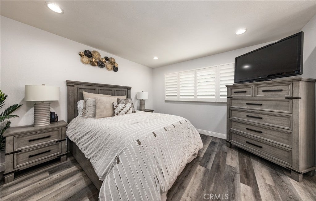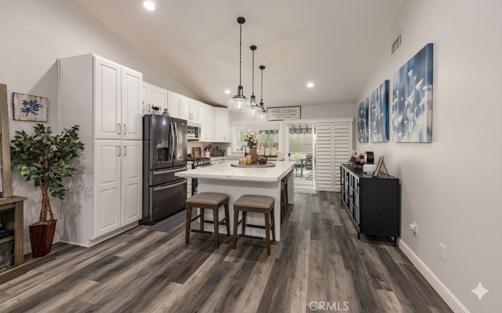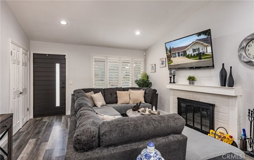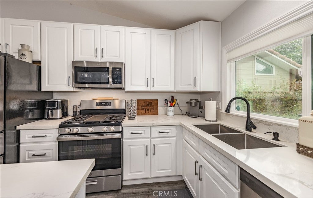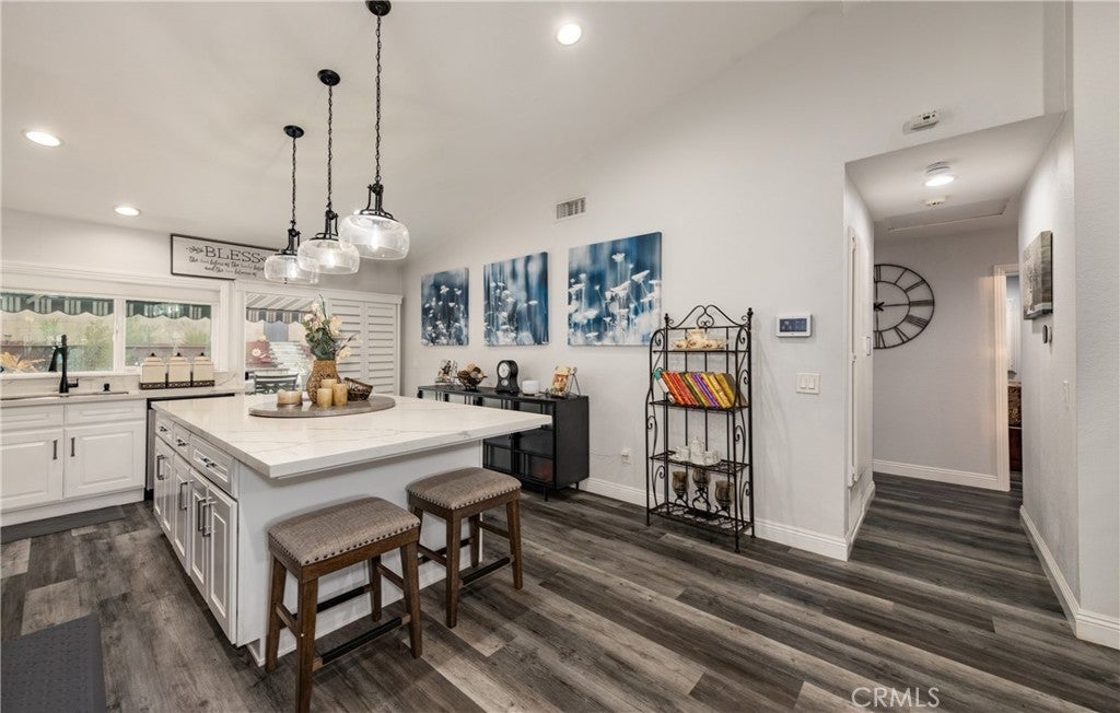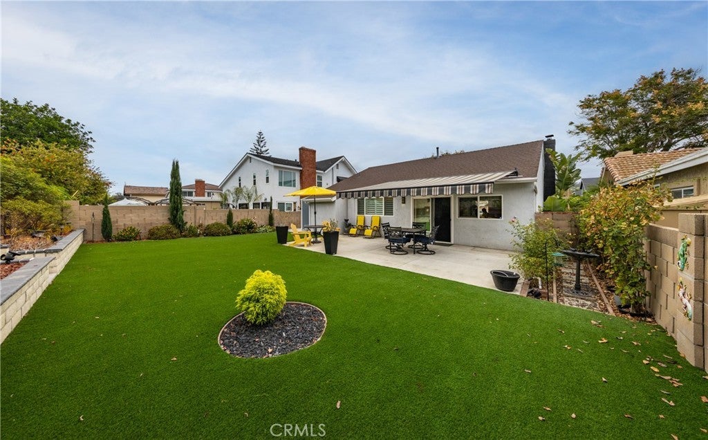 Cute single-story home with countless upgrades!! Upon entering the home, there is an open concept main living and kitchen area with vaulted ceilings. The family room has a cozy fireplace whereas the kitchen features notable upgrades such as newer cabinets, quartz countertops, newer appliances and fixtures (2021). The extra large kitchen island provides room for meal prep as well as space for seating. Both bathrooms are also newer: the primary bathroom has a dual vanity and mirrors with integrated lights and a separate room with the toilet and walk-in shower with a glass sliding door. The second bathroom is complete with a toilet, newer vanity and a shower in tub with tiled walls and a glass sliding door. The vinyl flooring and AC unit are newer, the water heater was installed in 2023, all windows are dual pane and the majority of them have louvered shutters. Other interior features include the SMART thermostat and alarm system. The 2-car spacious garage has epoxy floors and a modern newer garage door. Outside, the front and back yards are easy to maintain with artificial turf and the rain gutters have been outfitted with leaf filters to keep the gutters clear. The backyard has a concrete patio with a motorized retractable awning and a storage shed for extra items. You can't go wrong with this location: situated in a well-established neighborhood and close to parks, stores, restaurants, schools, etc etc. This beauty is MOVE-IN READY!!