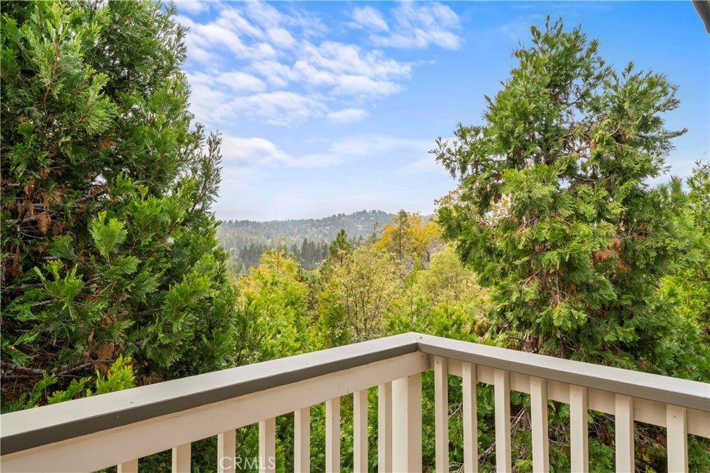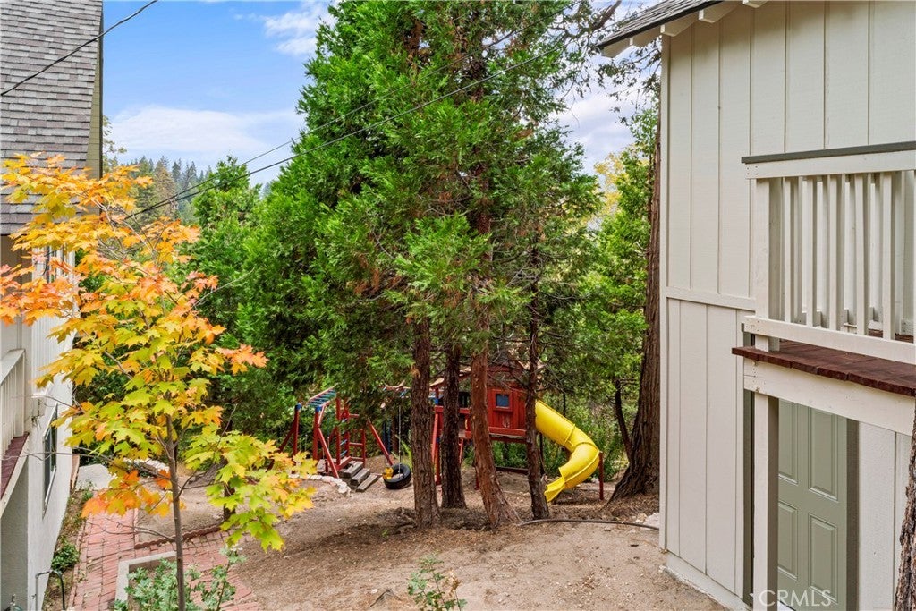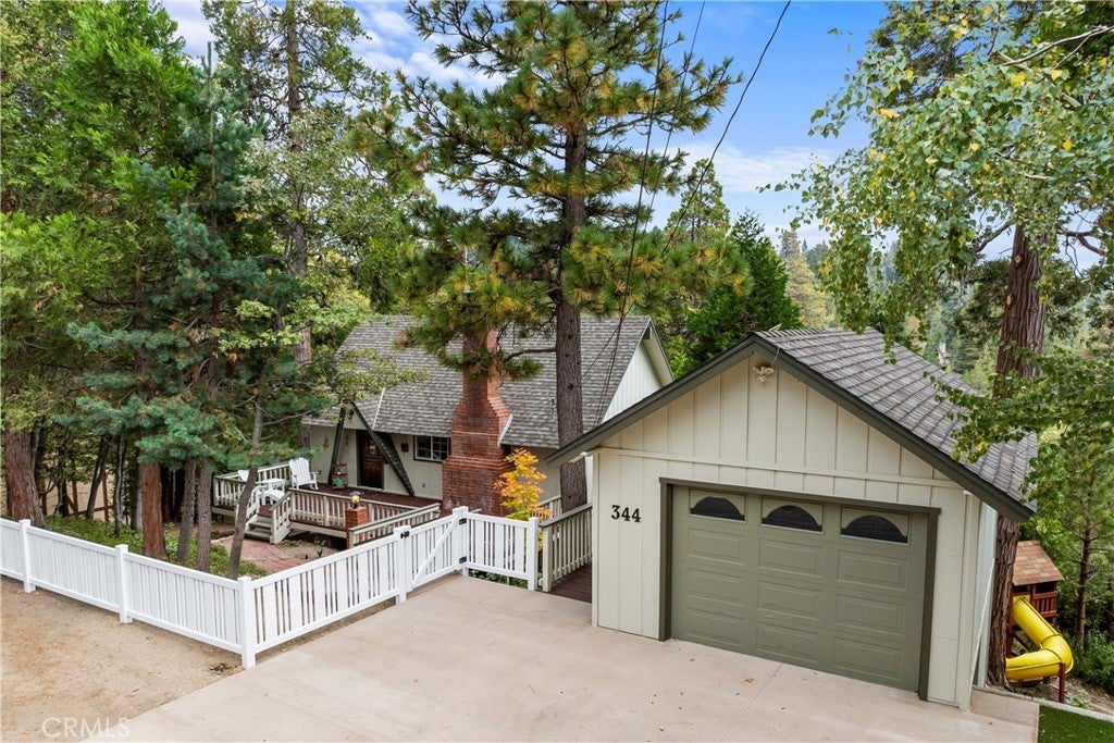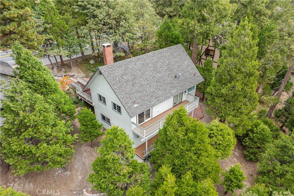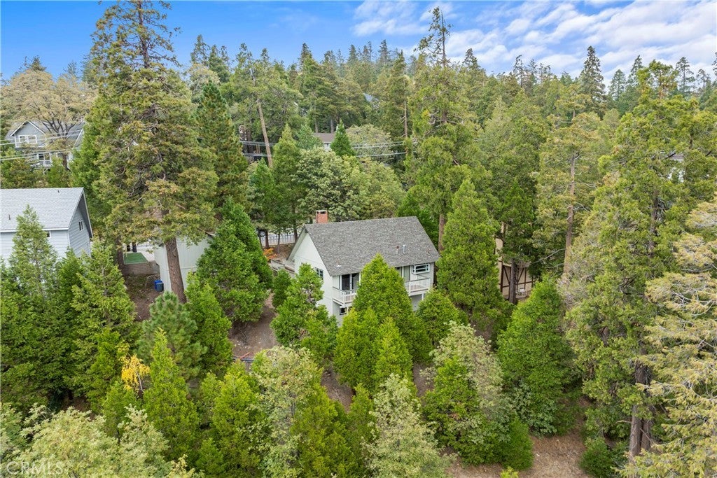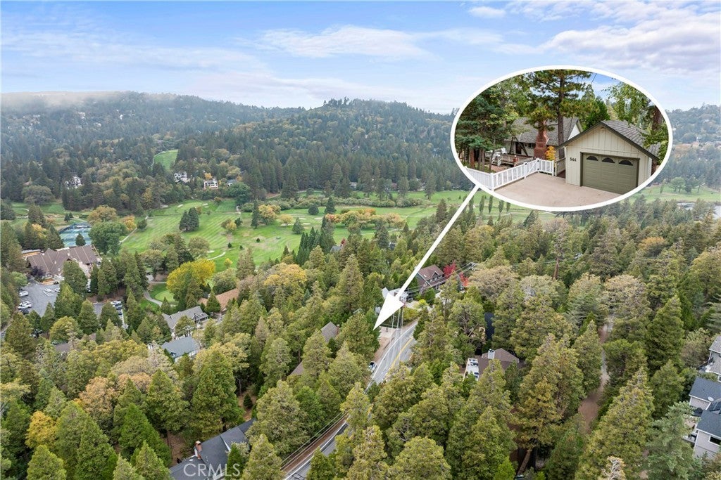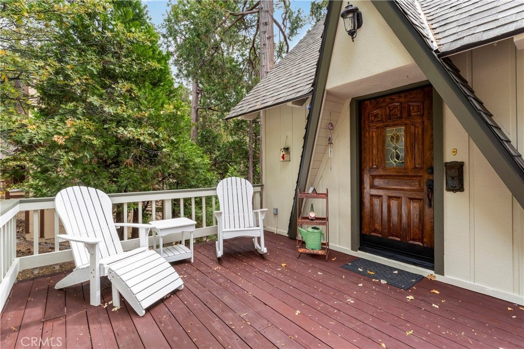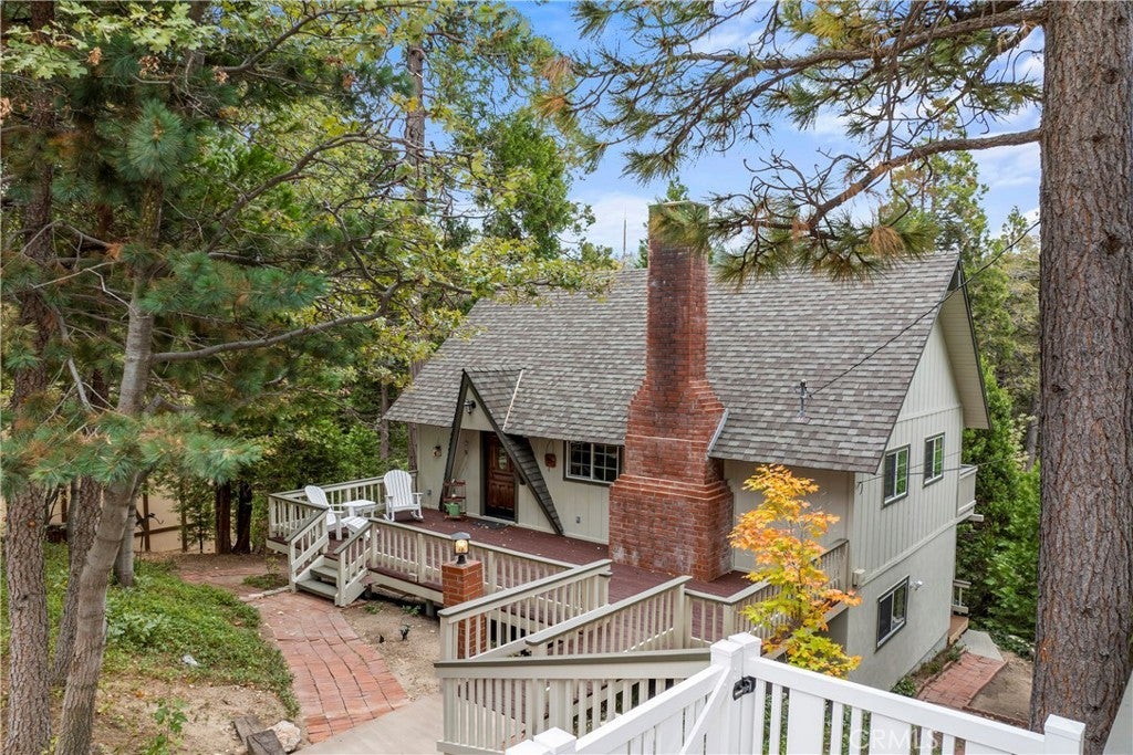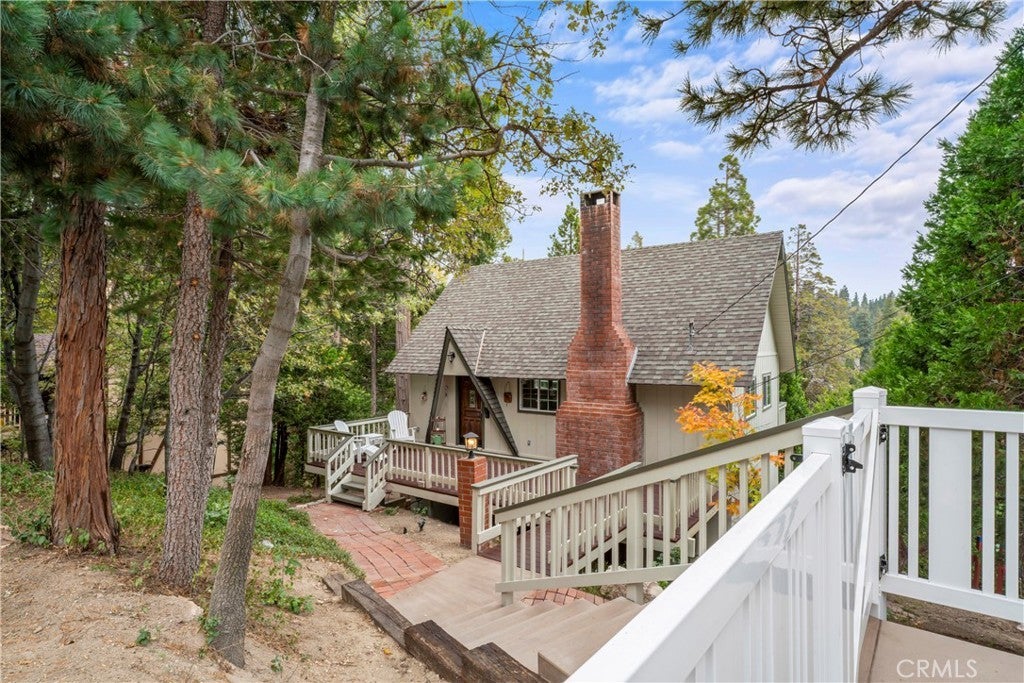 MID-CENTURY GEM WITH LAKE RIGHTS IN PRESTIGIOUS GRASS VALLEY NEIGHBORHOOD. Join one of the premier residential areas in Lake Arrowhead with LAKE RIGHTS and its own Grass Valley Lake. This home blends modern updates with classic mountain charm, offering privacy, views, and a lifestyle that’s both tranquil and connected. PROPERTY HIGHLIGHTS: This meticulously renovated cabin w/2 BD, 2 Full BA on two levels and THREE SCENIC DECKS (front, back and lower level). The cozy home’s entrance is set back well off the street. Street-LEVEL garage entry plus lighted concrete steps lead to a custom front door with vintage glass and A-Frame overhang. OPEN FLOOR PLAN: Step inside to an inviting open-concept layout featuring a foyer, bright kitchen w/island, dining nook and expansive living room. Soaring cathedral ceilings in wide plank caramel pine pair beautifully with ebony wood-framed windows and doors, while a whitewashed brick fireplace anchors the large living area with timeless elegance. Sliders open to a spacious deck for morning coffee or evening entertaining. Above the main living area, a sun-drenched loft offers flexible space for a home office, reading retreat or guest sleeping. LOWER-LEVEL COMFORT: Two generously sized bedrooms with large windows and custom cabinetry are downstairs. One BD has wood wainscotting accents and is adjacent to the first large, gleaming full bath. The ensuite bedroom leads to deck with entrance to this level for easy backyard access. BONUS SPACES & OUTDOOR LIVING: A finished workroom/office with a large window is just steps from the garage. A brick-paved side yard is ideal for entertaining and future firepit installation. Expansive, terraced backyard is complete with an elaborate swing set, children’s playhouse, and a rustic, meditation bench among mature trees. Near the country club golf course and “Arrowhead Ridge” trailhead.