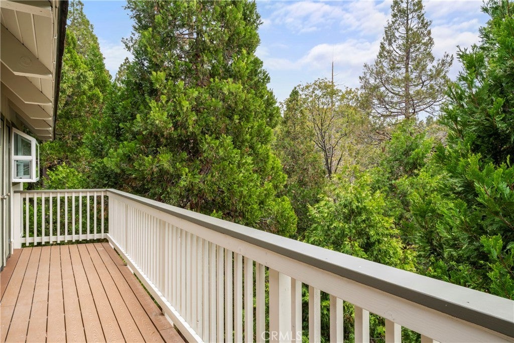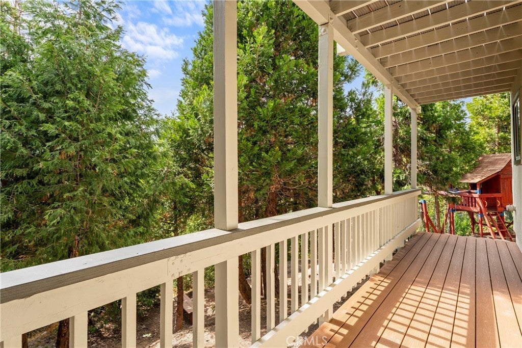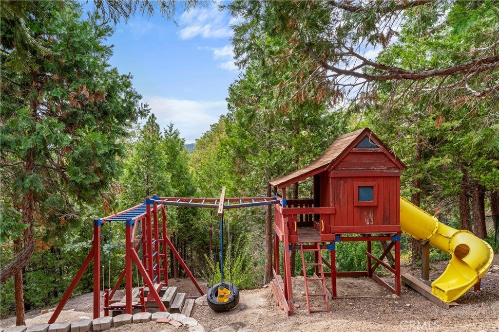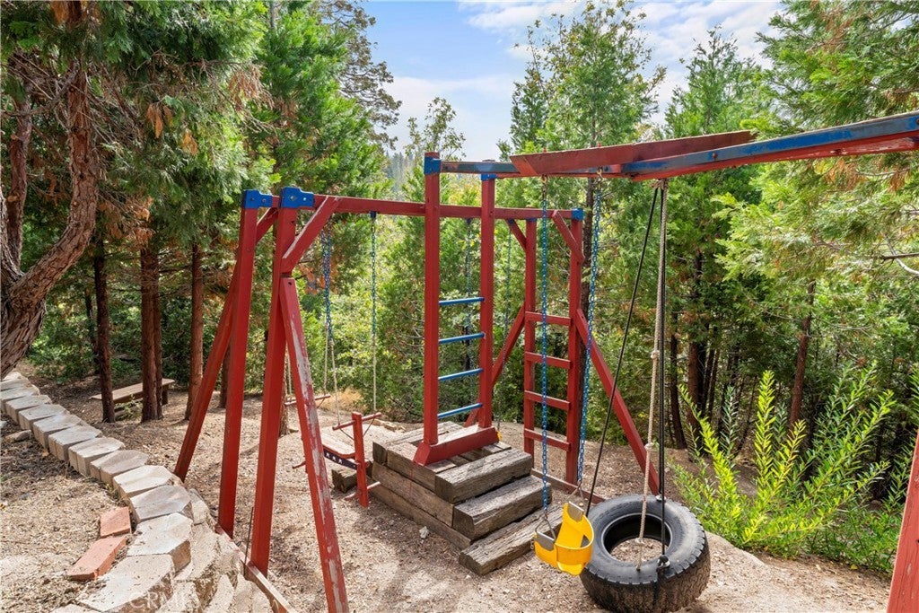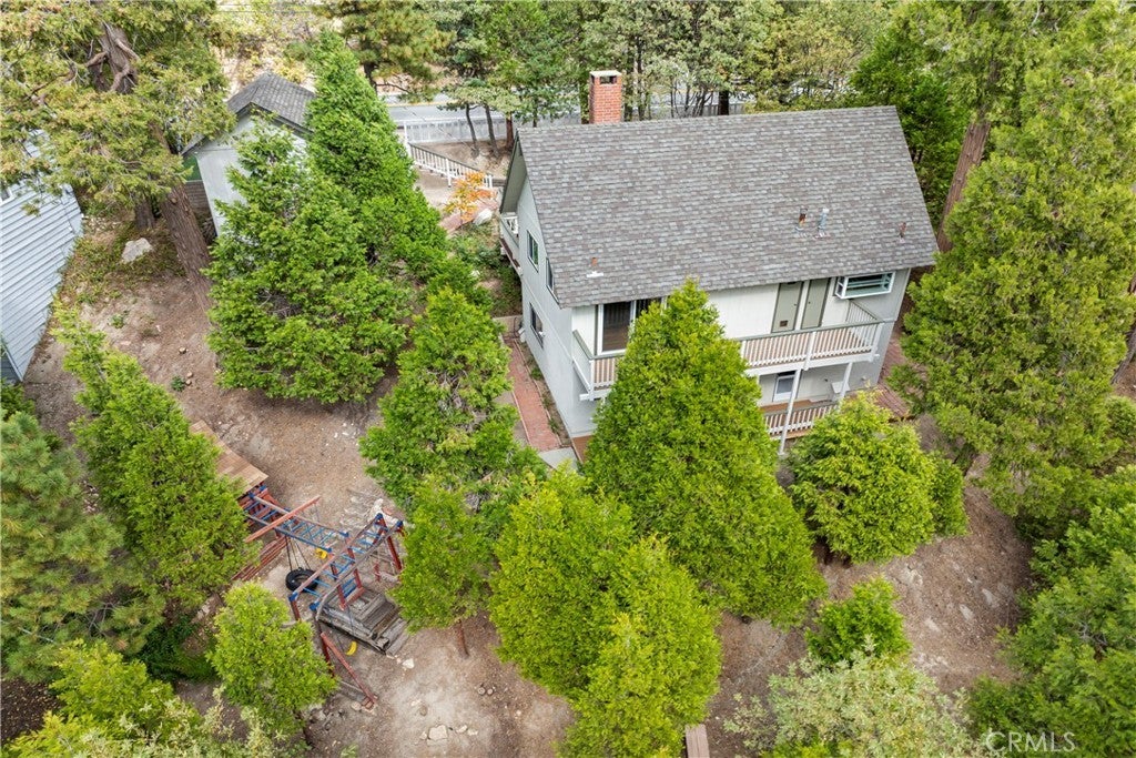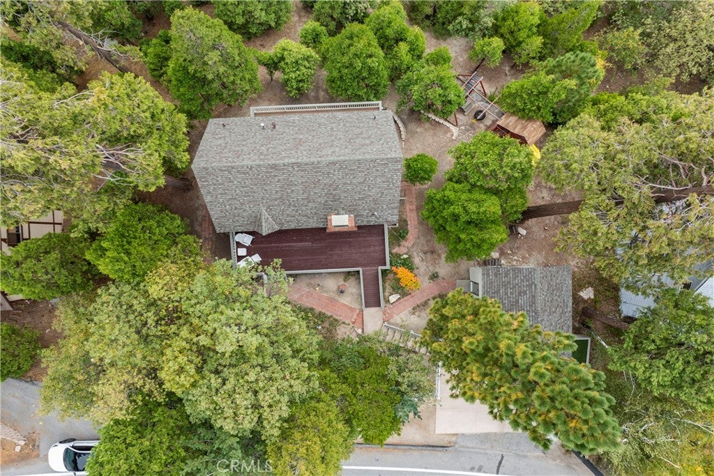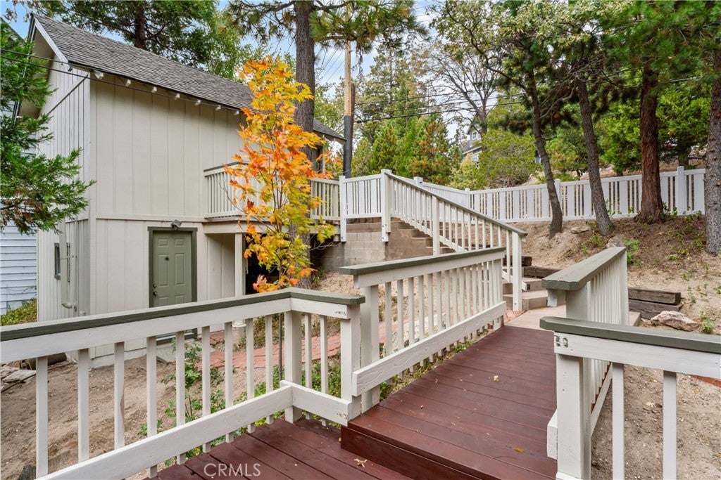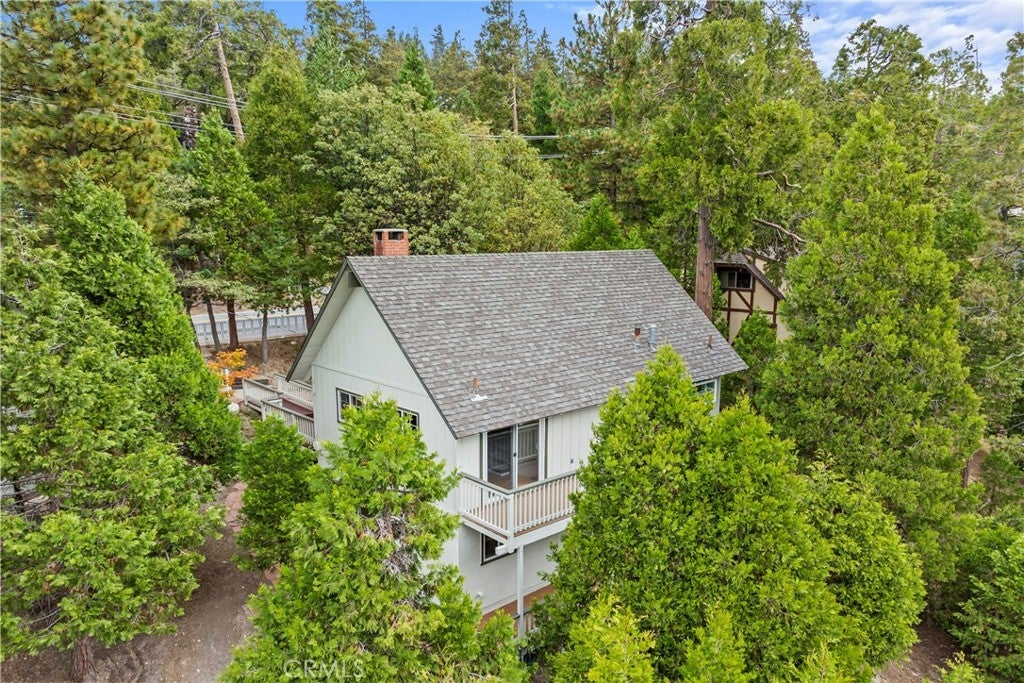 MID-CENTURY GEM WITH LAKE RIGHTS IN PRESTIGIOUS GRASS VALLEY NEIGHBORHOOD. Join one of the premier residential areas in Lake Arrowhead with LAKE RIGHTS and its own Grass Valley Lake. This home blends modern updates with classic mountain charm, offering privacy, views, and a lifestyle that’s both tranquil and connected. PROPERTY HIGHLIGHTS: This meticulously renovated cabin w/2 BD, 2 Full BA on two levels and THREE SCENIC DECKS (front, back and lower level). The cozy home’s entrance is set back well off the street. Street-LEVEL garage entry plus lighted concrete steps lead to a custom front door with vintage glass and A-Frame overhang. OPEN FLOOR PLAN: Step inside to an inviting open-concept layout featuring a foyer, bright kitchen w/island, dining nook and expansive living room. Soaring cathedral ceilings in wide plank caramel pine pair beautifully with ebony wood-framed windows and doors, while a whitewashed brick fireplace anchors the large living area with timeless elegance. Sliders open to a spacious deck for morning coffee or evening entertaining. Above the main living area, a sun-drenched loft offers flexible space for a home office, reading retreat or guest sleeping. LOWER-LEVEL COMFORT: Two generously sized bedrooms with large windows and custom cabinetry are downstairs. One BD has wood wainscotting accents and is adjacent to the first large, gleaming full bath. The ensuite bedroom leads to deck with entrance to this level for easy backyard access. BONUS SPACES & OUTDOOR LIVING: A finished workroom/office with a large window is just steps from the garage. A brick-paved side yard is ideal for entertaining and future firepit installation. Expansive, terraced backyard is complete with an elaborate swing set, children’s playhouse, and a rustic, meditation bench among mature trees. Near the country club golf course and “Arrowhead Ridge” trailhead.
