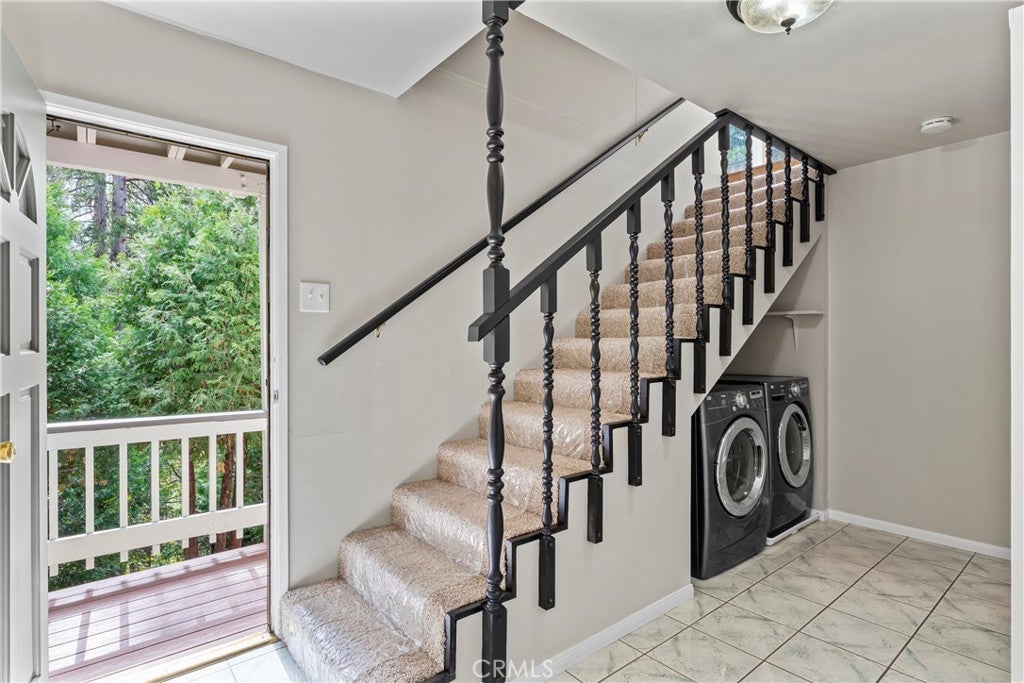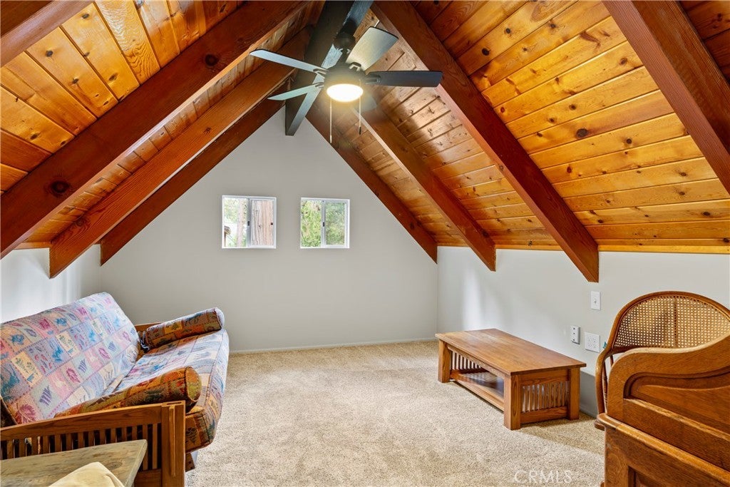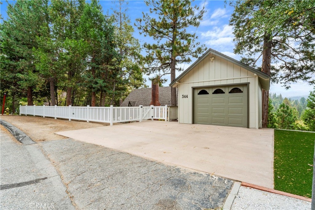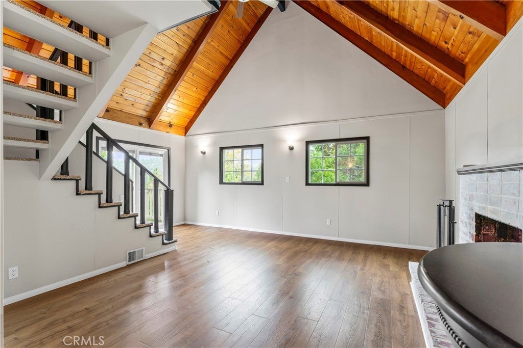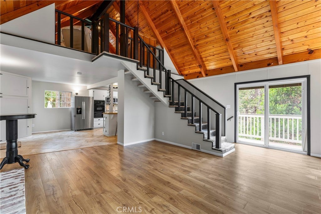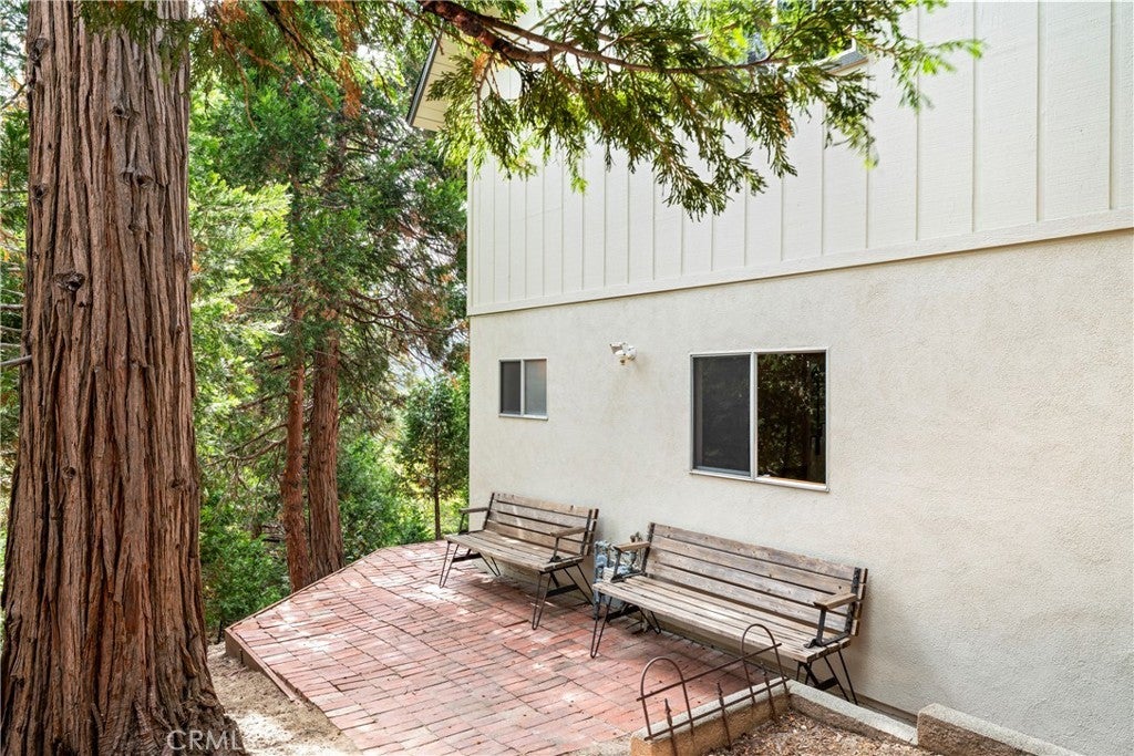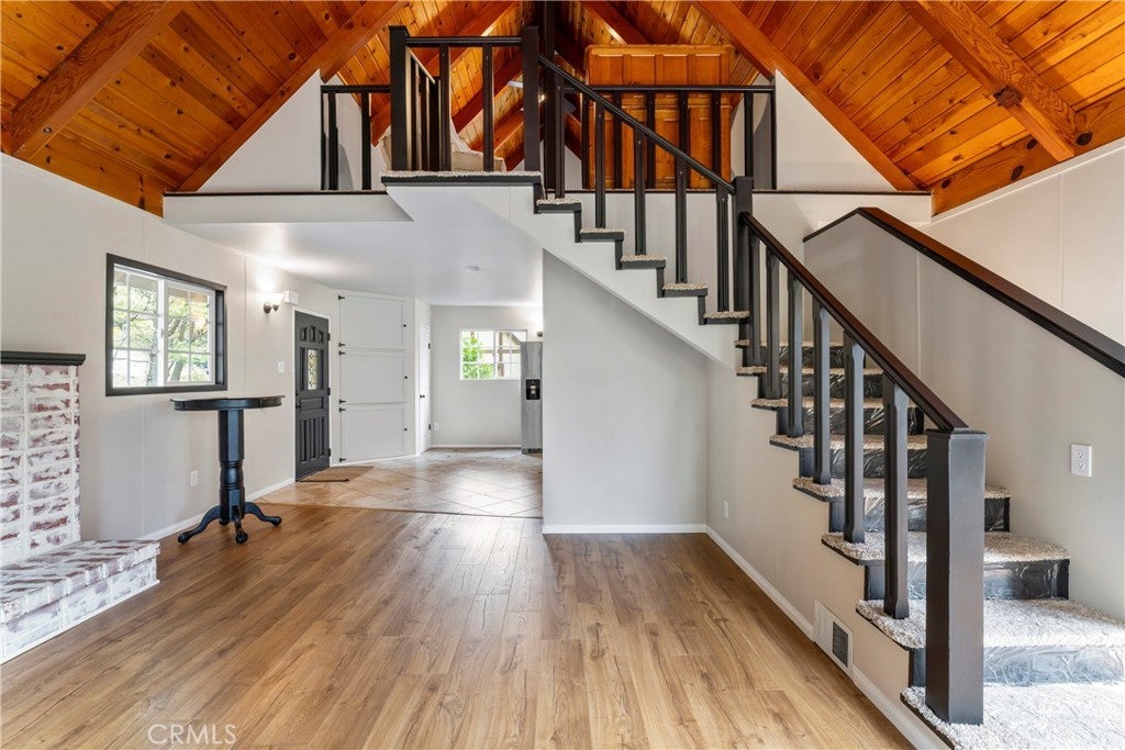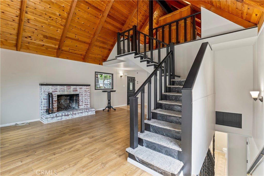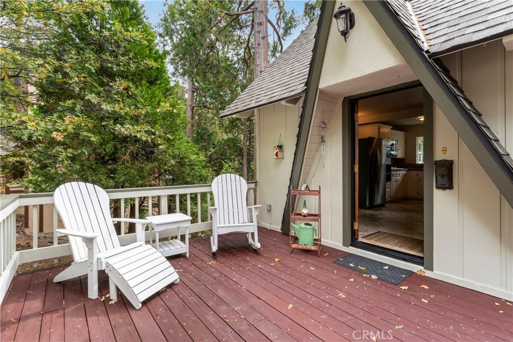 MID-CENTURY GEM WITH LAKE RIGHTS IN PRESTIGIOUS GRASS VALLEY NEIGHBORHOOD. Join one of the premier residential areas in Lake Arrowhead with LAKE RIGHTS and its own Grass Valley Lake. This home blends modern updates with classic mountain charm, offering privacy, views, and a lifestyle that’s both tranquil and connected. PROPERTY HIGHLIGHTS: This meticulously renovated cabin w/2 BD, 2 Full BA on two levels and THREE SCENIC DECKS (front, back and lower level). The cozy home’s entrance is set back well off the street. Street-LEVEL garage entry plus lighted concrete steps lead to a custom front door with vintage glass and A-Frame overhang. OPEN FLOOR PLAN: Step inside to an inviting open-concept layout featuring a foyer, bright kitchen w/island, dining nook and expansive living room. Soaring cathedral ceilings in wide plank caramel pine pair beautifully with ebony wood-framed windows and doors, while a whitewashed brick fireplace anchors the large living area with timeless elegance. Sliders open to a spacious deck for morning coffee or evening entertaining. Above the main living area, a sun-drenched loft offers flexible space for a home office, reading retreat or guest sleeping. LOWER-LEVEL COMFORT: Two generously sized bedrooms with large windows and custom cabinetry are downstairs. One BD has wood wainscotting accents and is adjacent to the first large, gleaming full bath. The ensuite bedroom leads to deck with entrance to this level for easy backyard access. BONUS SPACES & OUTDOOR LIVING: A finished workroom/office with a large window is just steps from the garage. A brick-paved side yard is ideal for entertaining and future firepit installation. Expansive, terraced backyard is complete with an elaborate swing set, children’s playhouse, and a rustic, meditation bench among mature trees. Near the country club golf course and “Arrowhead Ridge” trailhead.