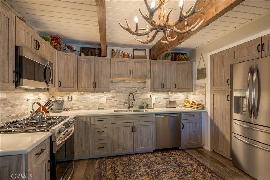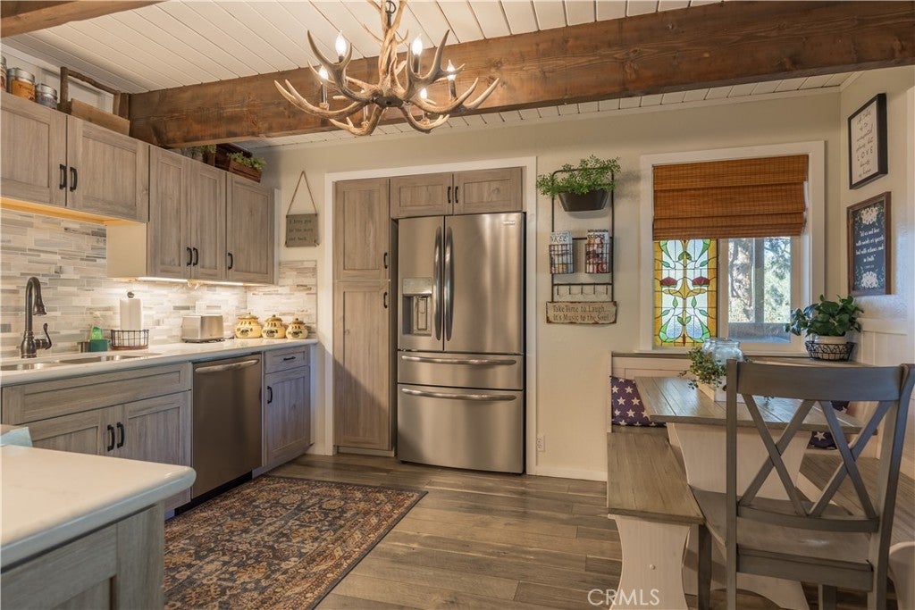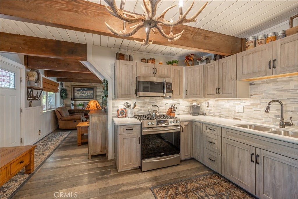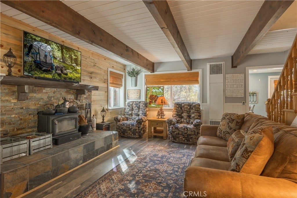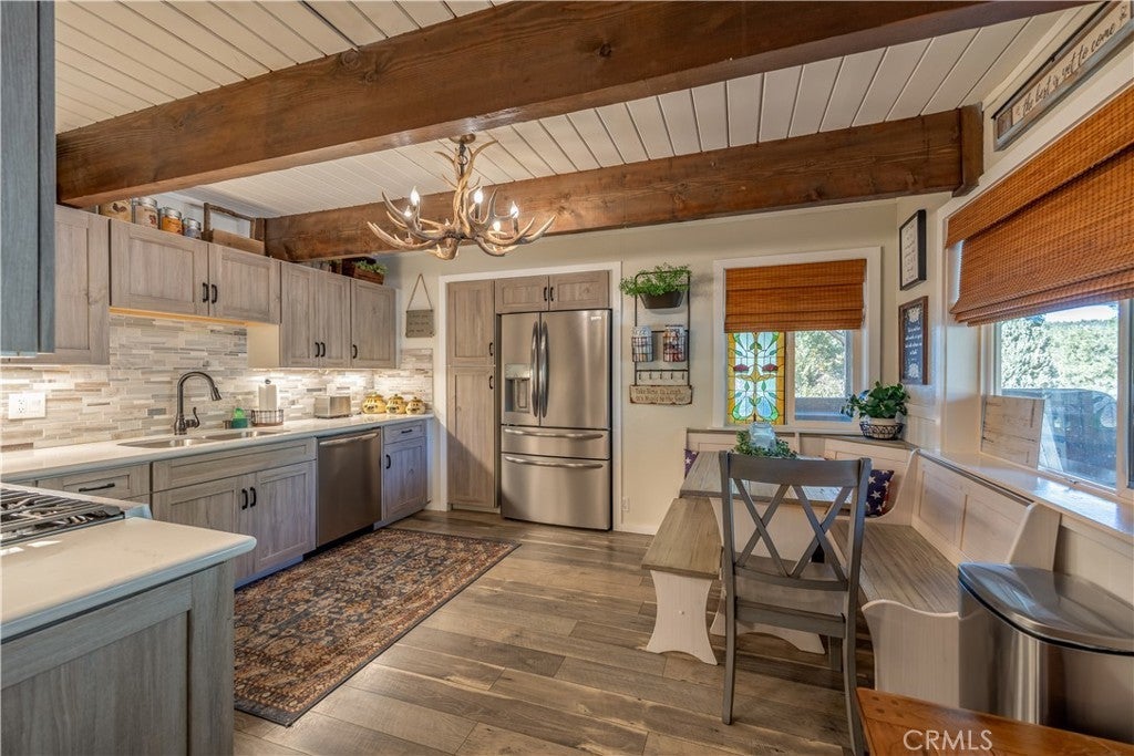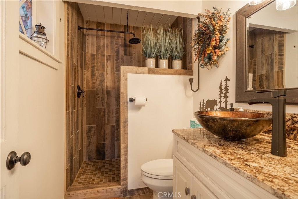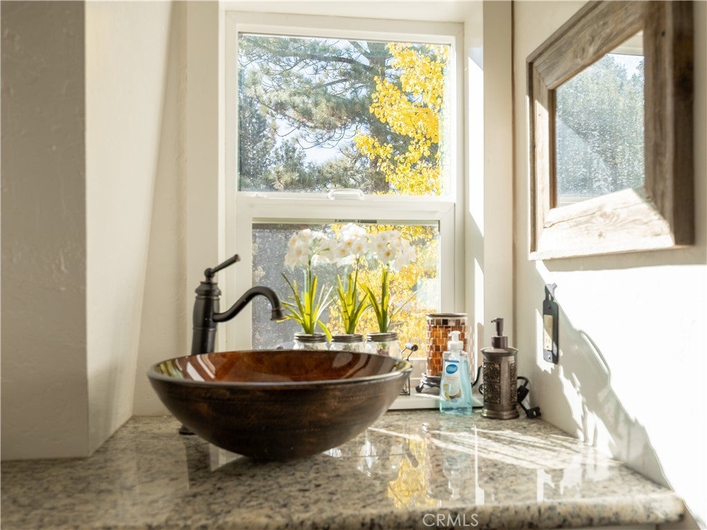 Welcome to your own slice of Big Bear serenity! This picture-perfect mini ranch is nestled in a peaceful, wooded neighborhood where mountain charm meets modern comfort. From the moment you arrive, this property radiates warmth, privacy, and that unmistakable Big Bear vibe. Step inside to discover a light-filled living area featuring wood-beam ceilings, updated flooring, and a classic wood-burning fireplace, making the perfect gathering spot after a day on the slopes or exploring the trails. The remodeled kitchen shines with quartz countertops, modern cabinetry, and plenty of prep space for cooking and entertaining. The home features one bedroom and one bath on the main level, plus two additional bedrooms and a shared bath upstairs. A detached guest Bunk house comfortably sleeps four, ideal for visiting friends, extended family, or use as a creative office space. Outside, the wrap-around deck invites you to take in the mountain air, enjoy morning coffee, or read a book under the pines. The expansive 12,750 sq ft lot provides room to roam, garden, or store your outdoor gear, with ample parking with space for an RV, and other toys. The owned solar system keeps utility costs low, while thoughtful updates include a newer roof, dual-pane windows, and rain gutters for added value and peace of mind. All furnishings, appliances, and amenities are included in the sale, allowing you to move right in and start enjoying the mountain lifestyle from day one. Whether you’re seeking a full-time residence or a weekend getaway that feels worlds away from city life, 1063 H Lane offers comfort, character, and a timeless Big Bear setting that feels like home the moment you arrive.