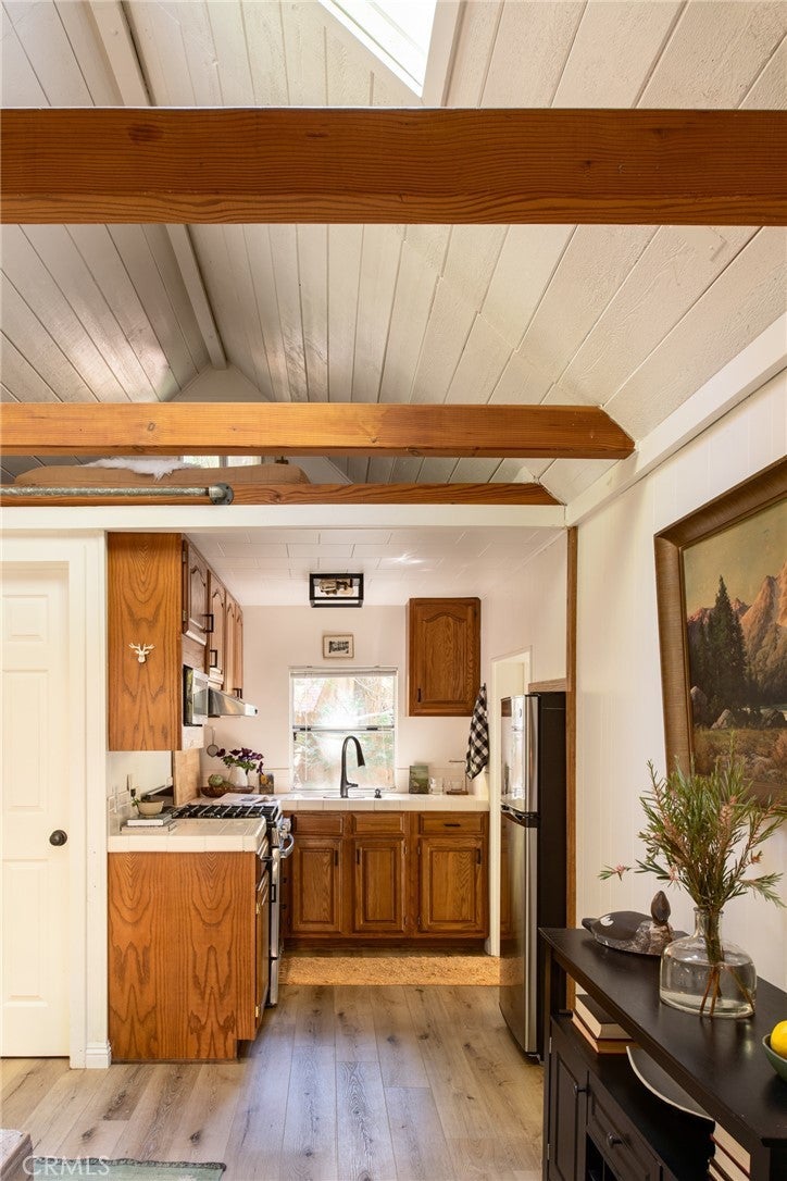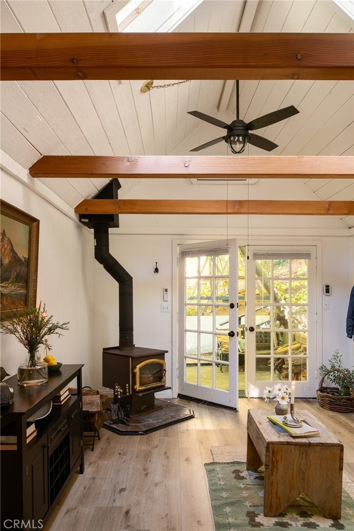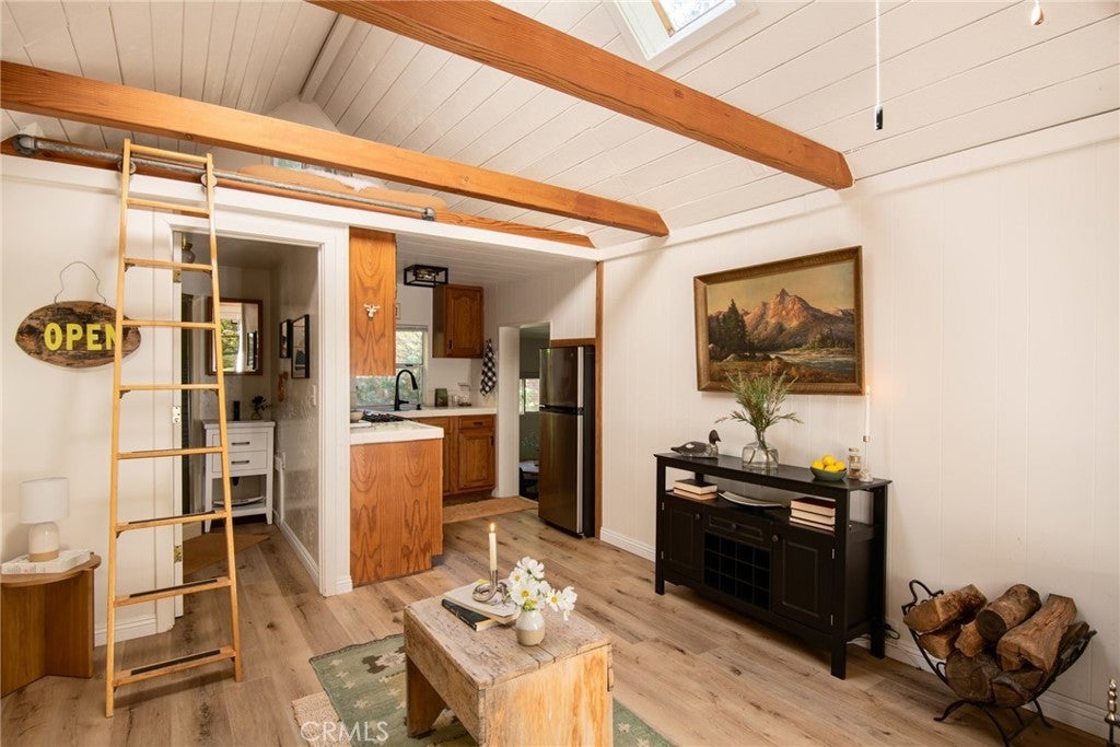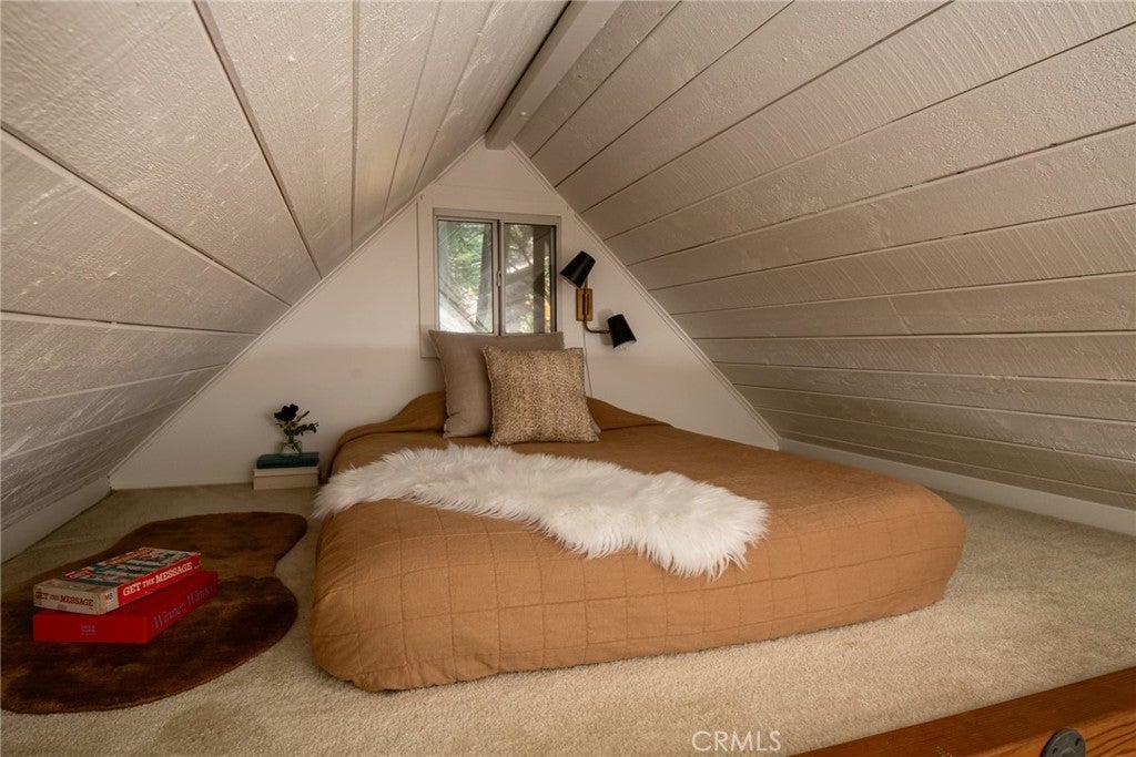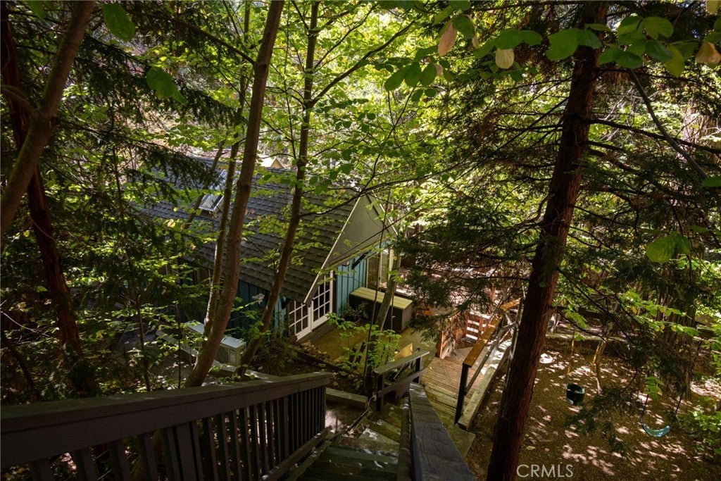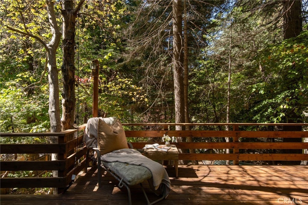 Welcome to the perfect little cottage tucked away in its own private forested haven. This home offers a rare sense of peace and seclusion, situated on a large, usable lot surrounded by majestic dogwoods, cedar, and white fir trees, this home offers serene mountain living at its finest. Step outside and discover what truly sets this property apart: the expansive wraparound deck. Nestled under the canopy of mature mountain trees, this outdoor space feels like your own private treehouse — A flat area—currently used for a swing set—provides a versatile space ideal for additional outdoor seating, a firepit lounge, or garden. Access the property via your own private two-car carport located on Lake Dr., leading you down into this enchanting woodland retreat. Step through the French double doors into a warm and inviting living room, featuring vaulted ceilings with exposed beams, skylights, and a cozy wood-burning stove. The upgraded kitchen flows seamlessly into the living area, perfect for entertaining. Just a few steps down, you’ll find a charming dining room with its own set of French doors opening to the deck, creating a beautiful indoor-outdoor living experience. The private bedroom is cozy and tucked away, complete with sliding glass doors for direct access to the deck. Upstairs, a carpeted loft offers an additional sleeping space—ideal for guests or a quiet reading nook. Ideally located in the Arrowhead Villas community, this home is just a short distance to Lake Arrowhead and Skyforest, home to local favorites like LouEddie’s Pizza, Skypark at Santa’s Village, and a collection of boutique shops. Come see for yourself!