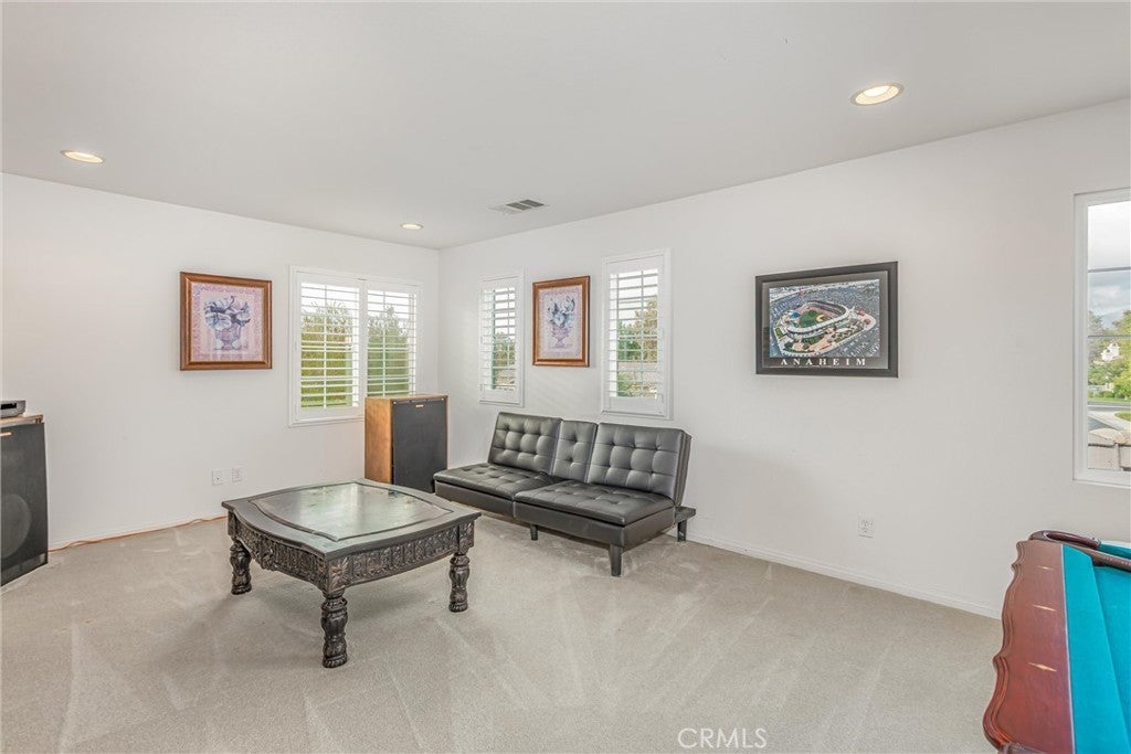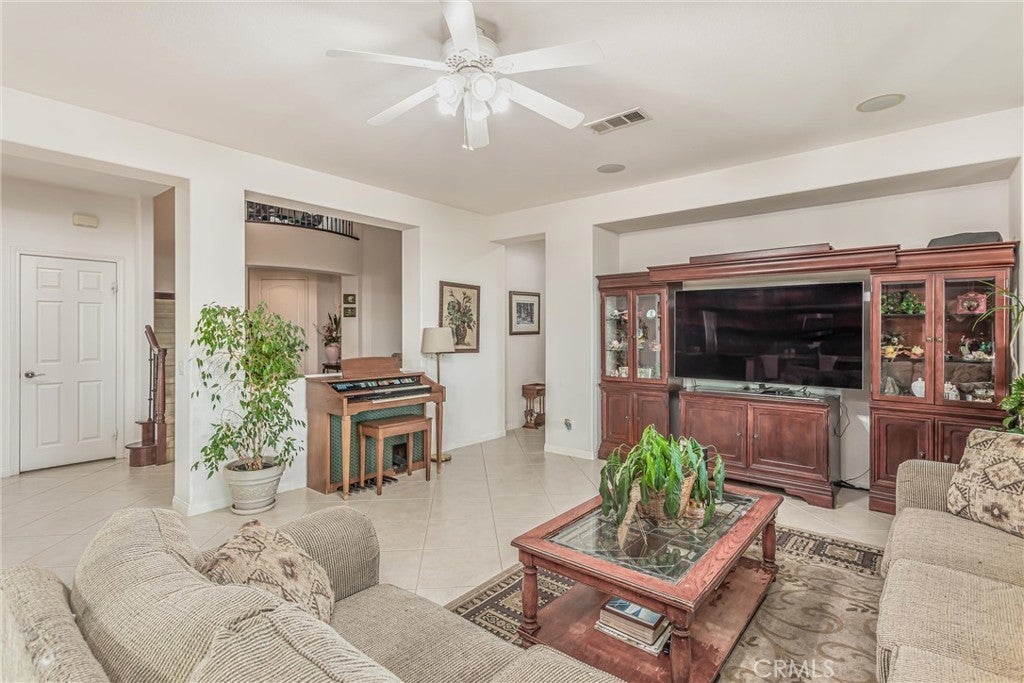This two-story home is located on one of the largest lots along the golf course in the Tournament Hills gated community. If you like SPACE and VIEWS, this is the home for you!! The first thing visitors see upon entering the home, is a beautiful custom tiled medallion at the front entry. High ceilings and neutral-colored flooring and walls come together to create an impressive view of the formal living room (with a fireplace) and staircase with peekaboo views to the family room and massive backyard. An office is located to the right of the main entrance and has a custom-built bookcase, spanning an entire wall. The family room and kitchen are open concept and have a wall of windows, showcasing the spectacular backyard and endless views. A separate formal dining room, guest bedroom with sliding doors to the backyard and a 3/4 bathroom are also located downstairs. The kitchen has granite countertops, double ovens, a built-in gas cooktop, microwave, dishwasher AND an over-sized kitchen island to accommodate counter seating and meal prep. There is also dedicated space for a breakfast nook with sliding glass doors for backyard access. Upstairs are the primary bedroom and two additional bedrooms and a LARGE loft, currently being used as a game area with electronics, a pool and poker table. The numerous windows from the loft offer spectacular views of the local San Bernardino mountains. The primary bedroom has an ensuite bathroom and spacious walk-in closet but the BEST part of this bedroom is the balcony and the VIEWS one gets of the backyard, golf course and hills off San Timoteo Canyon. The backyard is massive and an entertainer's delight with a patio cover that extends the entire length of the house, an outside BBQ with sink, gas burner, fridge and bar seating, a pool, large grassy area and a viewing deck at the far end of the yard. This home also has a 2-car garage and a single car garage and a large storage shed on the side yard. This gated community features beautiful green spaces, walking paths, the lake, gazebo and security presence. Tournament Hills Elementary is walking distance and other amenities in close proximity include shopping, restaurants, parks and close freeway access.