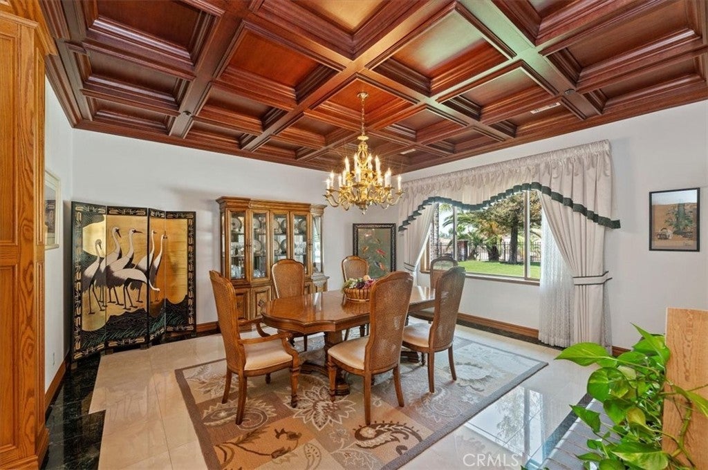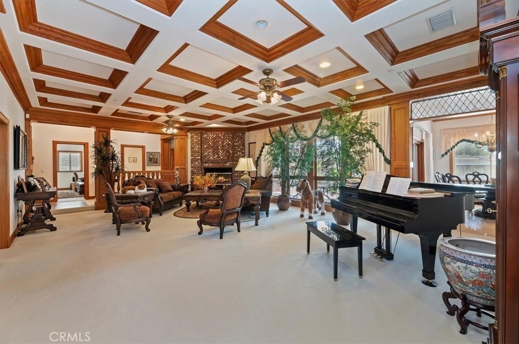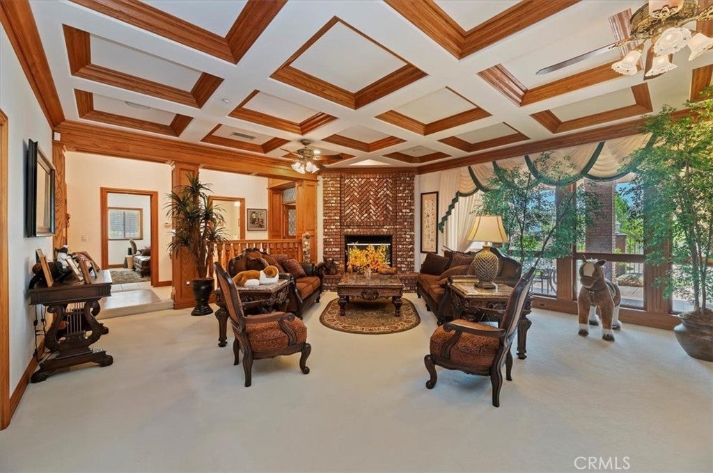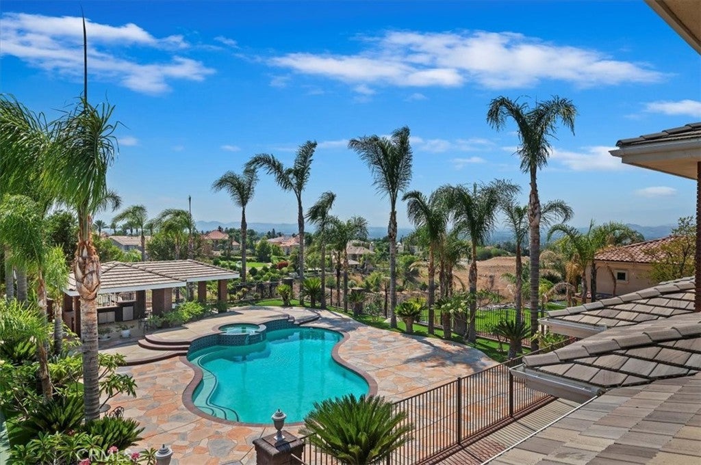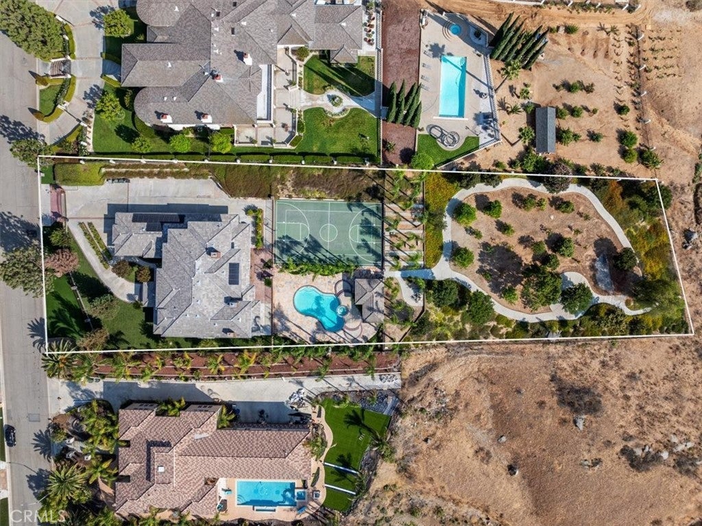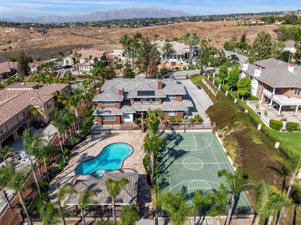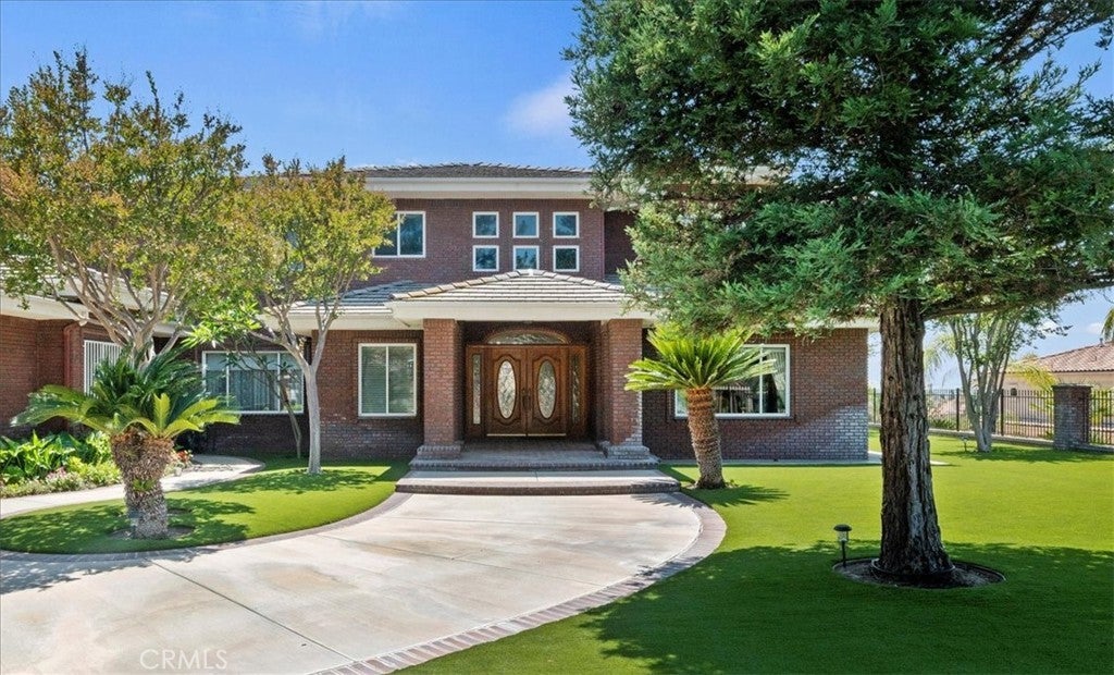 This bespoke estate in the exclusive Wyndham Hill Estates of Alessandro Heights offers a rare opportunity to own a custom designed property. Designed and maintained by its original owners, this residence blends timeless craftsmanship with thoughtful detail across 5,845 square feet of elegant living space. Guests are welcomed by a dramatic two-story foyer, featuring a grand sweeping staircase, custom oak wall paneling, and elegant marble floors with stone inlay. The entry opens to the formal living and dining rooms, where coffered ceilings, warm natural light, and artisan brick fireplaces reflect the home’s thoughtful craftsmanship and timeless appeal. Set on 1.5 acres in one of Riverside’s most prestigious neighborhoods, the residence offers 4 spacious bedrooms, 4.5 bathrooms, and an open-concept layout ideal for both everyday living and refined entertaining. Granite countertops, rich oak cabinetry, and custom built-ins are paired with enduring materials that speak to the home’s quality and thoughtful design, including hand-laid brick masonry wrapping the exterior and anchoring key interior spaces. The gourmet kitchen includes built-in appliances in pristine condition, a walk-in pantry, and seamless flow into the family and dining areas. A private study with custom oak shelving and a versatile upstairs loft with flexible spaces for work, media, or retreat. A spacious and private primary suite, accessed through beveled glass oak double doors, and includes a fireplace, dual walk-in closets with custom cabinetry, with dual private toilets, and a spa-inspired bath with jetted tub. Outdoors, the grounds are a private oasis: a resort-style pool and spa, basketball court, and a charming cabana ideal for gathering with guests or enjoying quiet mornings outdoors. A flourishing orchard of guava, mango, avocado, pomelo, apple, loquat, orange, and fig trees adds to the property’s sense of abundance and tranquility. The expansive, gated driveway accommodates multiple vehicles and leads to a 5-car garage, with one bay converted into a fully finished workshop with built-in cabinetry. Every space reflects tasteful curation and meticulous care. Framed by mountain and partial city views, this home embodies privacy, elegance, and true custom luxury in one of Riverside’s most coveted enclaves.