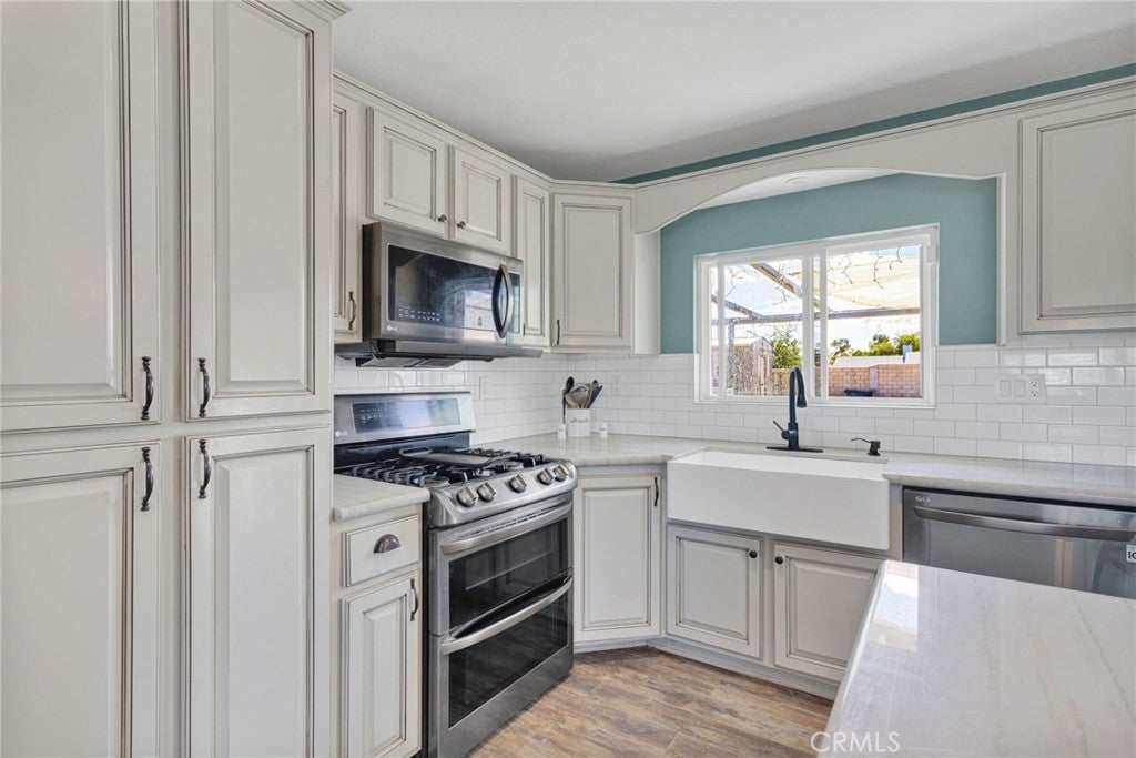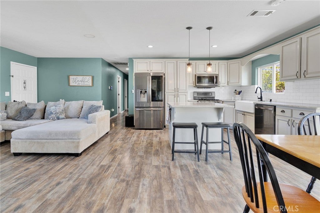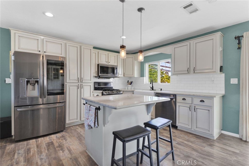 Welcome to this charming commuter-friendly home in Victorville, combining modern upgrades and comfortable living. This beautifully maintained 3-bedroom, 2-bath residence offers an inviting open floor plan and thoughtful touches throughout. The upgraded kitchen is a showstopper featuring stunning cabinetry, quartz countertops, a spacious kitchen island, and stainless-steel appliances that stay with the home. The kitchen flows seamlessly into the living room, perfect for entertaining and everyday living. Enjoy movie nights with ease the living room is wired for 5.1 surround sound, and a built-in wine cooler adds a touch of sophistication. Both bathrooms are nicely updated, and the home features laminate flooring throughout for easy maintenance and style. Step outside to an entertainer’s backyard designed for relaxation and fun! The deck is wired for speakers, internet, and cable, complete with built-in drainage, creating the perfect space for gatherings. The garage is even set up for two televisions, making it a great hangout or workshop area. A backyard shed with water and electricity provides extra versatility and storage. This home also includes an assumable solar lease with SunRun, helping keep your energy costs low. Conveniently located near major commuter routes, shopping, dining, and schools this Victorville beauty is ready to welcome you home!