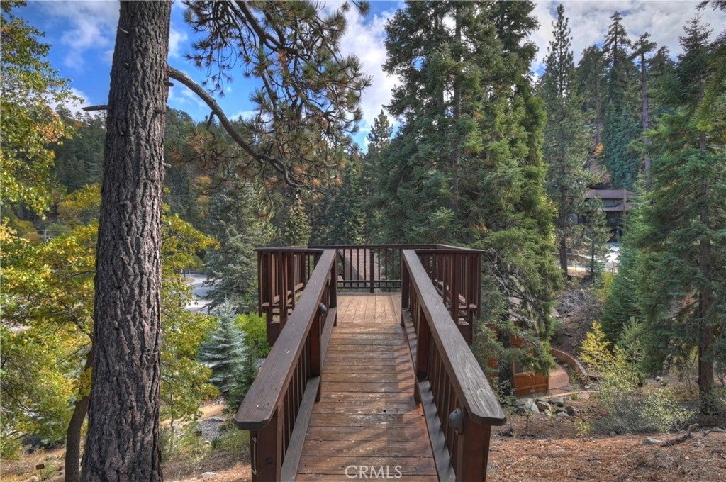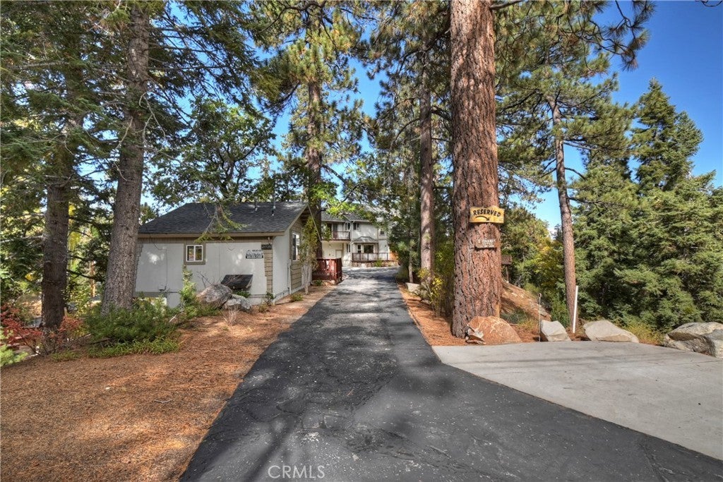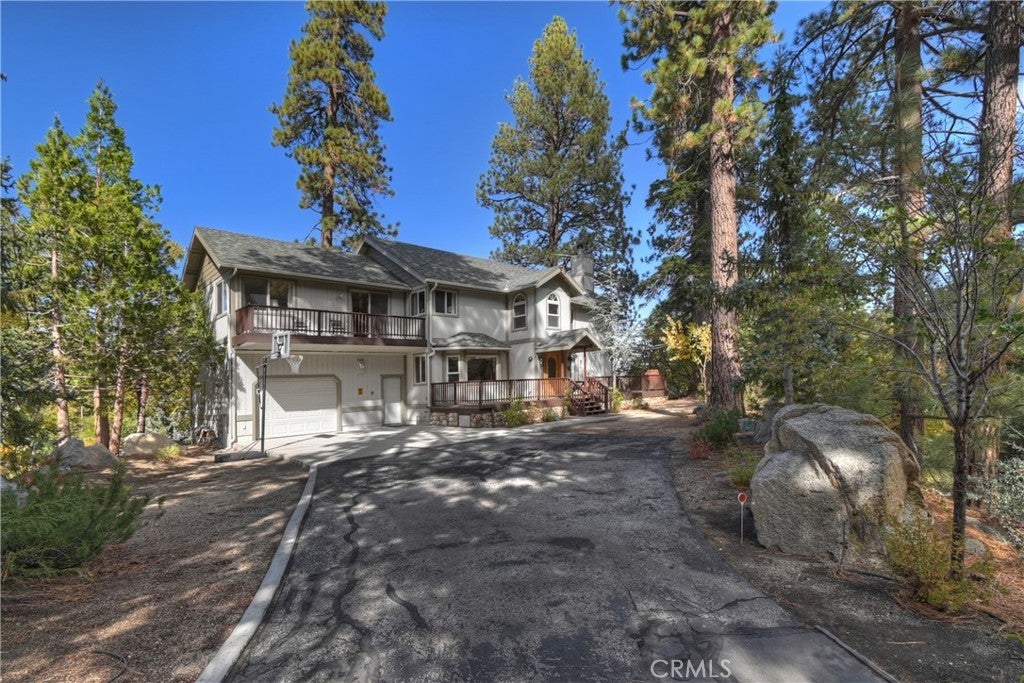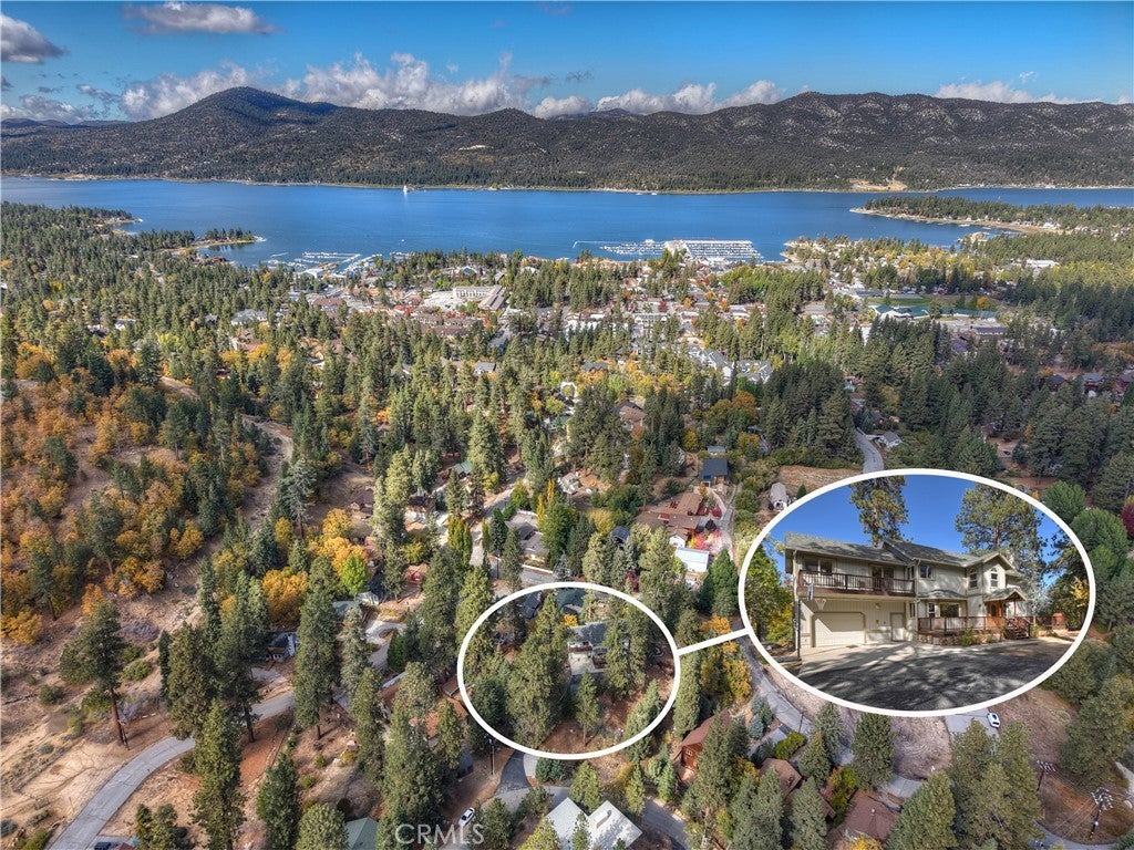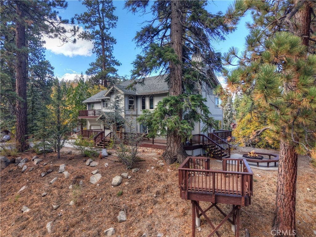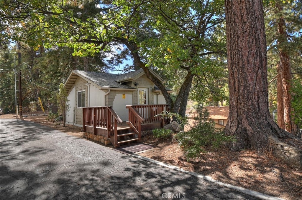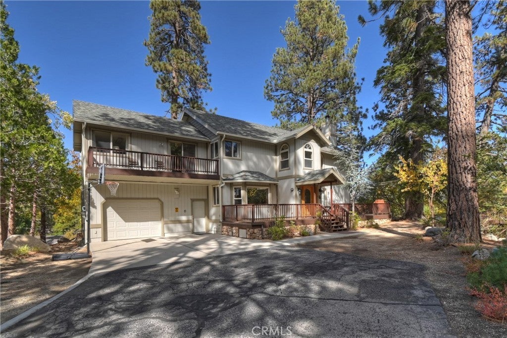 Up the San Bernardino Mountains you will find a charming town called Big Bear ~ Though small for its size, this town boasts a large lake, The Village and two resorts for skiing, snowboarding, hiking, mountain biking and all manner of recreation ~ Perched above the Village, while still within walking distance to it, you encounter this wonderful home ~ On 40,000 sq. ft., just shy of a full acre, is this 5 bedroom, 2.5 bathroom escape ~ It also has a detached guest house with it's own bedroom and bathroom ~ As you pull up to the property you will immediately fall head over heels with the setting ~ The long flat driveway leads you deeper onto the property where you find your home sitting on top of the hill like a monarch upon their throne ~ Your well treed land gives you the ultimate illusion of seclusion, making you feel as though you are alone in the forest ~ The outdoors gives you plenty of areas to relax from your front deck, firepit or your own lookout ~ As you enter you will absolutely love the floor to ceiling, and wood burning, rock fireplace in the Great Room ~ This is the ideal area to spend quality time with your loved ones creating lifelong memories together ~ The kitchen is open to the Great Room and has the cutest dining area you could wish for ~ Also on the main floor you have the master bedroom with peek-a-boo lake views, the laundry room with 1/2 bathroom and interior access to the garage ~ Upstairs you will find a large bedroom, above the master, that also has lake views, along with 2 more bedrooms, a large family room that is currently being used as the 5th bedroom and the second bathroom ~ The second bathroom is it's own work of art ~ The detached guest house is the perfect little cottage to add to this home's allure ~ Across the street from the National Forest, walking distance to the Village, 5 minutes to the lake, 8 minutes to the ski slopes and room to gather all your loved ones together under one roof! What are you waiting for?