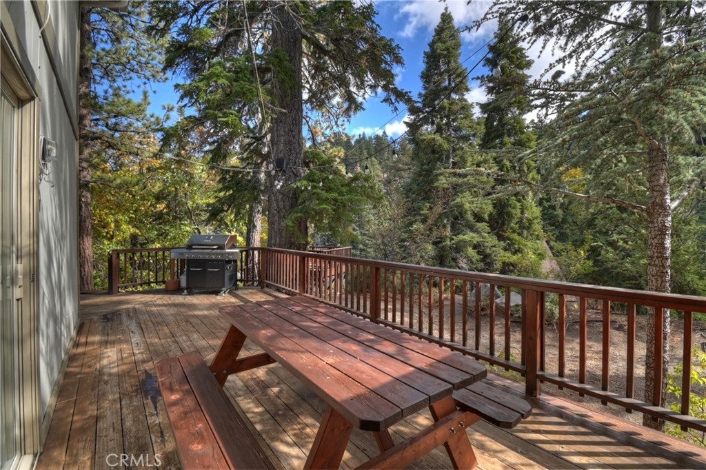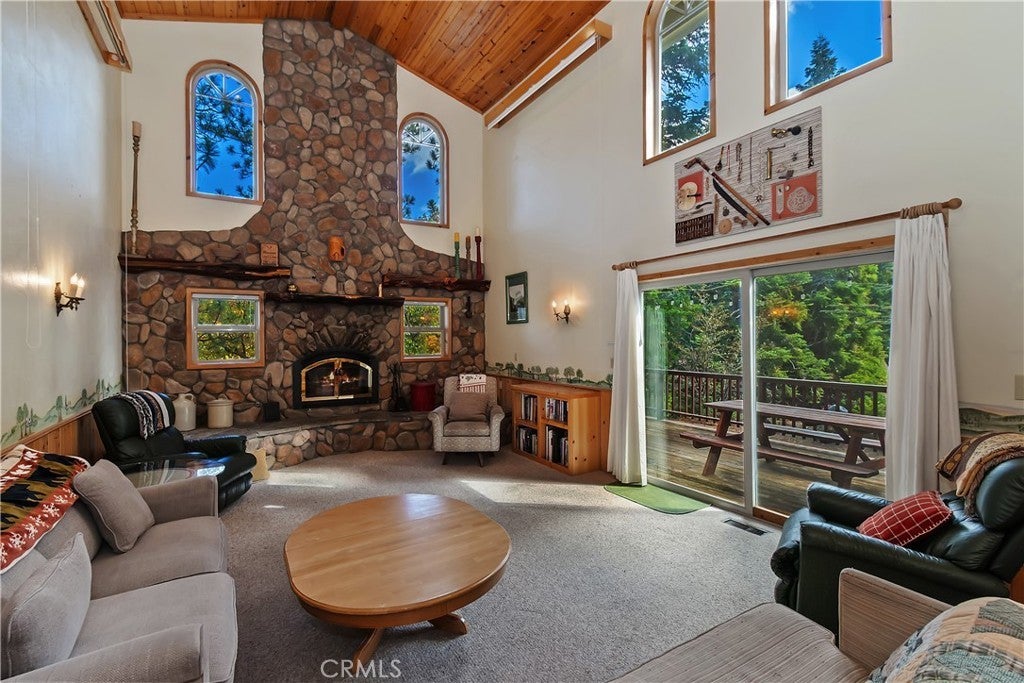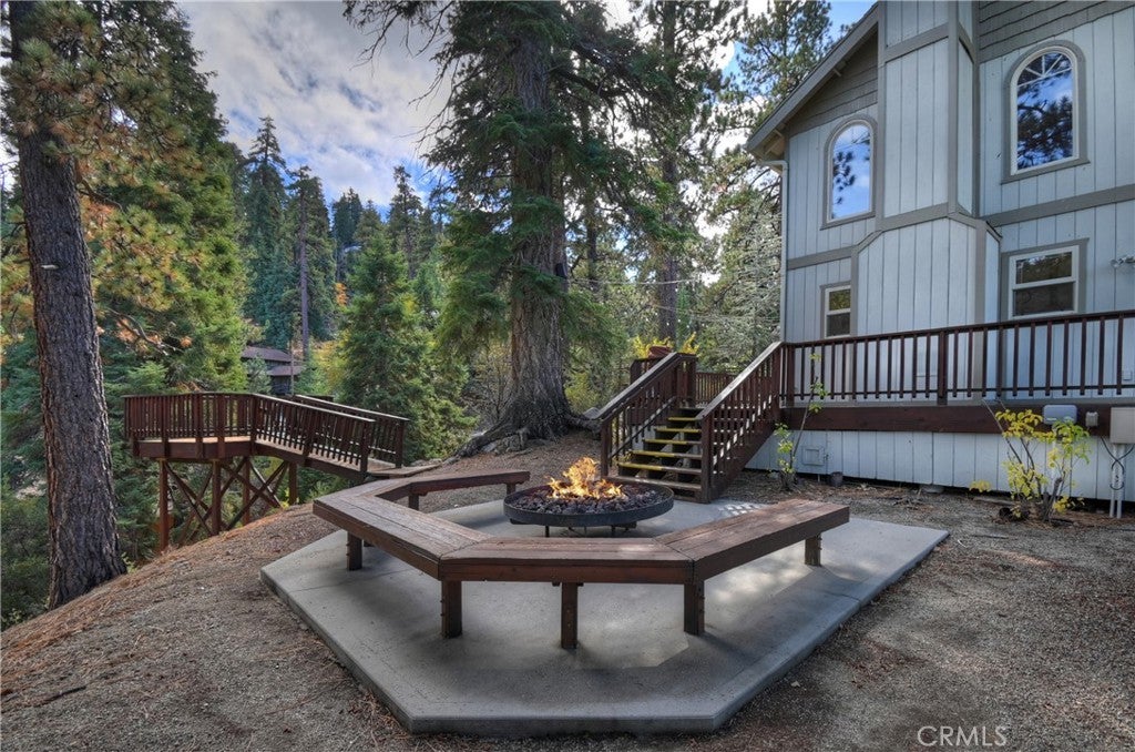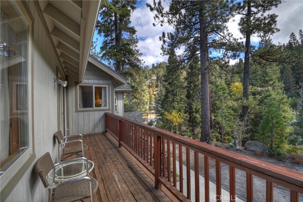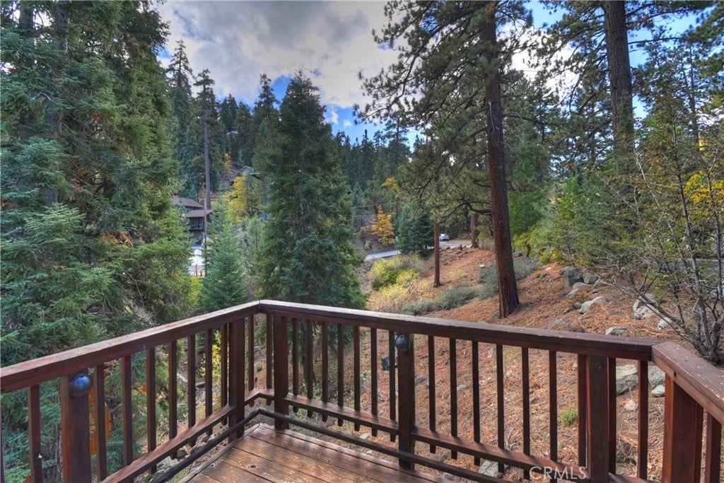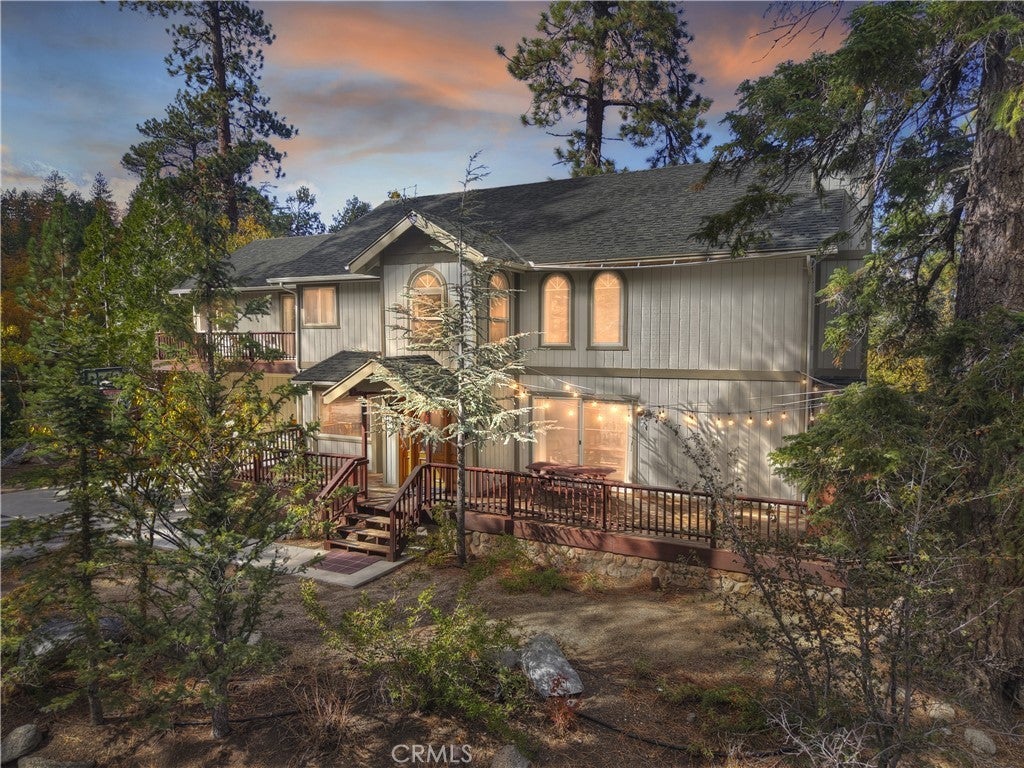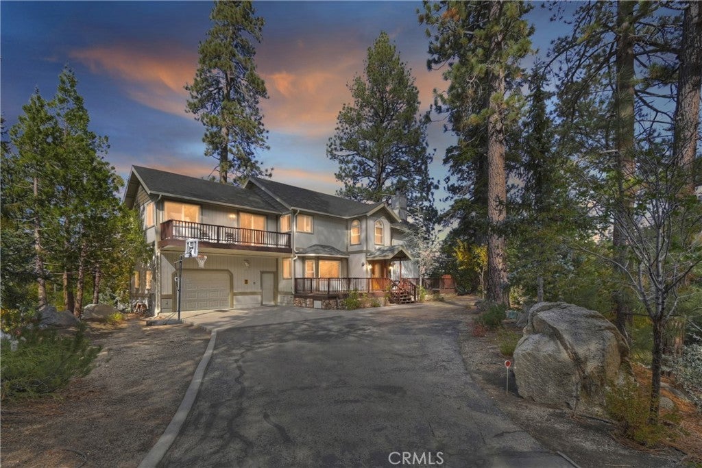 Up the San Bernardino Mountains you will find a charming town called Big Bear ~ Though small for its size, this town boasts a large lake, The Village and two resorts for skiing, snowboarding, hiking, mountain biking and all manner of recreation ~ Perched above the Village, while still within walking distance to it, you encounter this wonderful home ~ On 40,000 sq. ft., just shy of a full acre, is this 5 bedroom, 2.5 bathroom escape ~ It also has a detached guest house with it's own bedroom and bathroom ~ As you pull up to the property you will immediately fall head over heels with the setting ~ The long flat driveway leads you deeper onto the property where you find your home sitting on top of the hill like a monarch upon their throne ~ Your well treed land gives you the ultimate illusion of seclusion, making you feel as though you are alone in the forest ~ The outdoors gives you plenty of areas to relax from your front deck, firepit or your own lookout ~ As you enter you will absolutely love the floor to ceiling, and wood burning, rock fireplace in the Great Room ~ This is the ideal area to spend quality time with your loved ones creating lifelong memories together ~ The kitchen is open to the Great Room and has the cutest dining area you could wish for ~ Also on the main floor you have the master bedroom with peek-a-boo lake views, the laundry room with 1/2 bathroom and interior access to the garage ~ Upstairs you will find a large bedroom, above the master, that also has lake views, along with 2 more bedrooms, a large family room that is currently being used as the 5th bedroom and the second bathroom ~ The second bathroom is it's own work of art ~ The detached guest house is the perfect little cottage to add to this home's allure ~ Across the street from the National Forest, walking distance to the Village, 5 minutes to the lake, 8 minutes to the ski slopes and room to gather all your loved ones together under one roof! What are you waiting for?