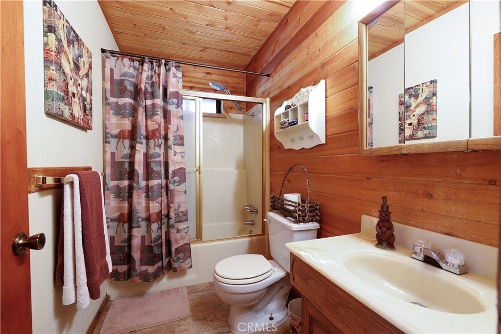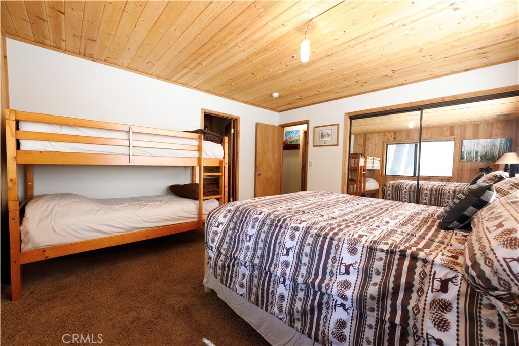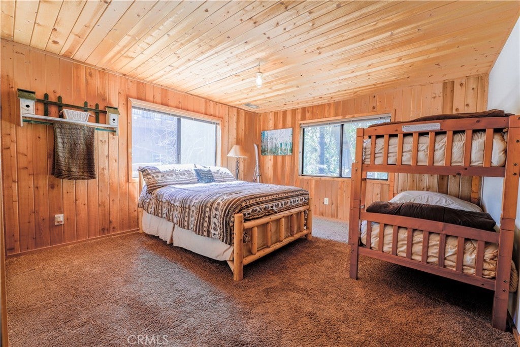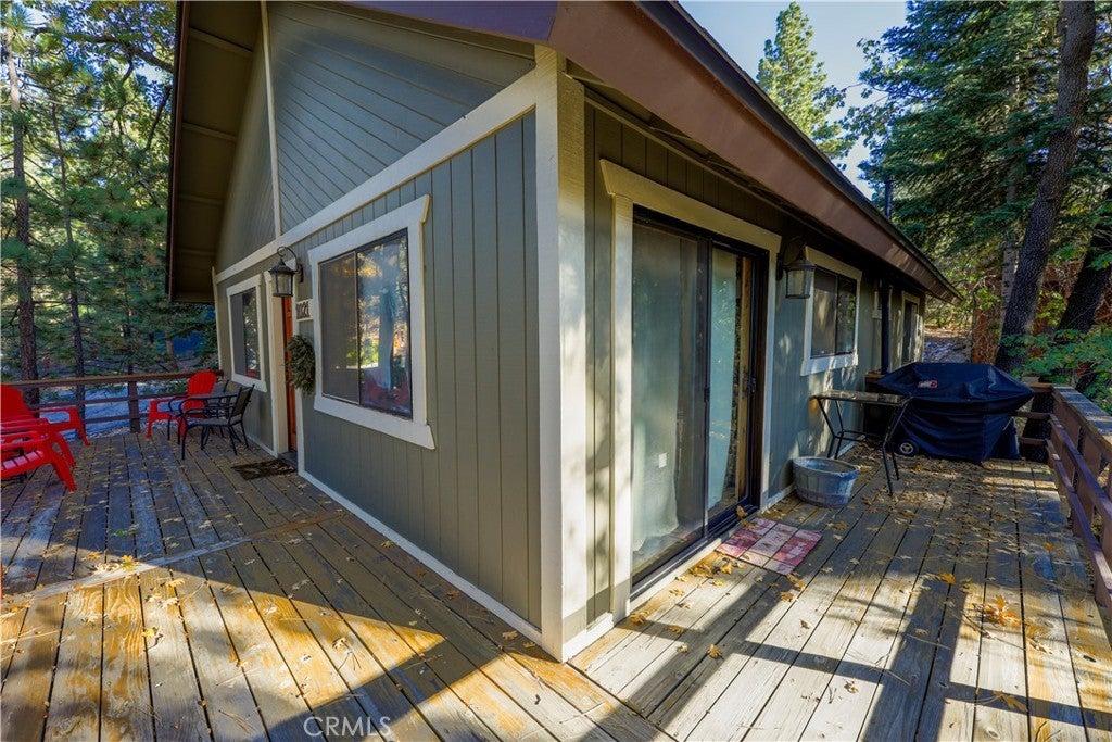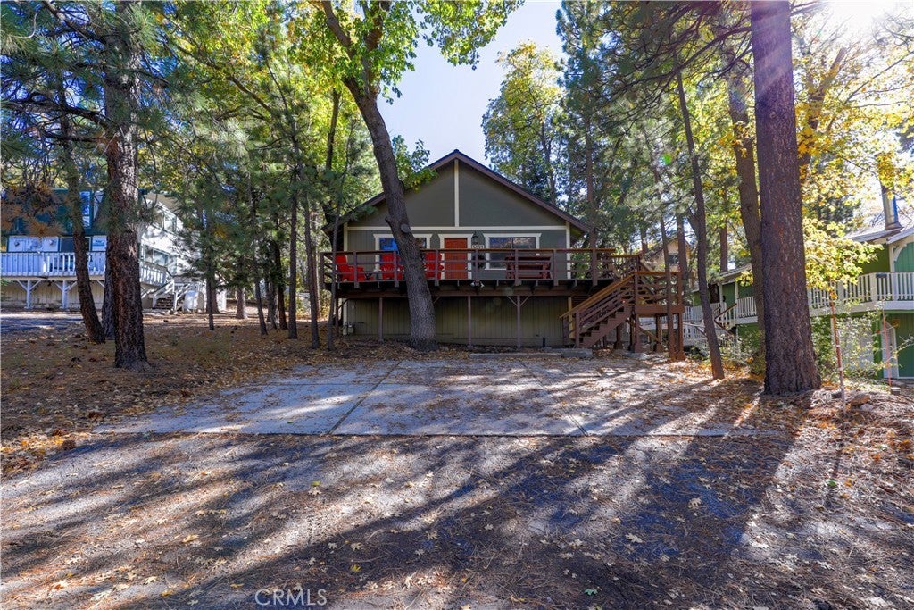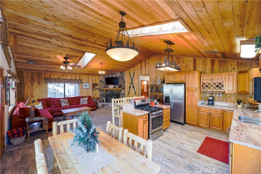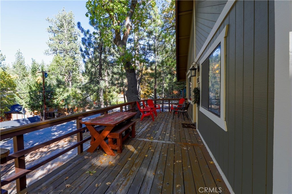 Cozy Mountain Retreat Near Bear Mountain. Nestled among towering pines and oaks, this beautifully maintained 2-bedroom, 2-bath cabin offers the perfect blend of rustic charm and modern comfort. The inviting great room features vaulted T&G ceilings, skylights, and an open floor plan ideal for relaxing or entertaining after a day on the slopes. The updated kitchen boasts granite countertops, stainless steel appliances, and warm wood cabinetry that complements the cabin’s natural feel. Both bedrooms are spacious and comfortable, while the two full bathrooms provide convenience for family and guests. Step outside to a spacious deck surrounded by serene treed views... perfect for morning coffee or evening stargazing. Recent upgrades include a newer roof and fresh exterior paint, giving you peace of mind for years to come. Located just minutes from Bear Mountain Resort, the golf course, Big Bear Alpine Zoo, shopping, and local coffee shops, this well-kept home is ideal as a mountain getaway, full-time residence, or investment property. Come enjoy the Big Bear lifestyle in this charming, move-in-ready cabin!