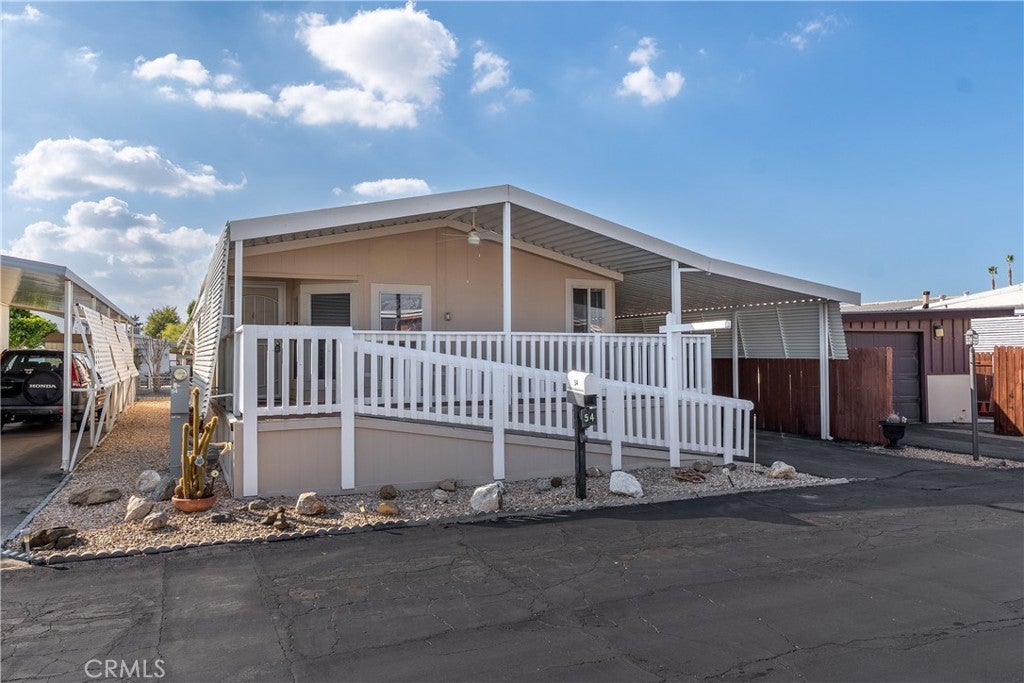 Welcome to this beautifully maintained 2 beds and 2 baths home, in a desirable 55+ community offers comfort, functionality, and thoughtful custom touches throughout. The open floor plan creates spacious and inviting layout, perfect for entertaining or everyday living. The spacious kitchen is a true centerpiece, featuring custom cabinetry, a large island, and upgraded lighting that adds warmth and charm. Both bathrooms include custom cabinets for extra storage and style. Enjoy the privacy and shade provided by awnings around the home. This home offers two bedrooms plus a bonus room, perfect for an office, hobby space, or guest area. The primary suite includes a generously sized bathroom with double sinks, built-in cabinets, and ample storage. For added convenience, the home is equipped with a custom accessibility ramp and a covered front porch with railings—perfect for relaxing outdoors. Pride of ownership shows throughout this inviting home in a peaceful, well-kept community offering low space rent. Don’t miss your chance to make it yours!