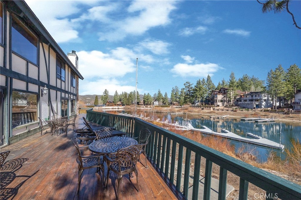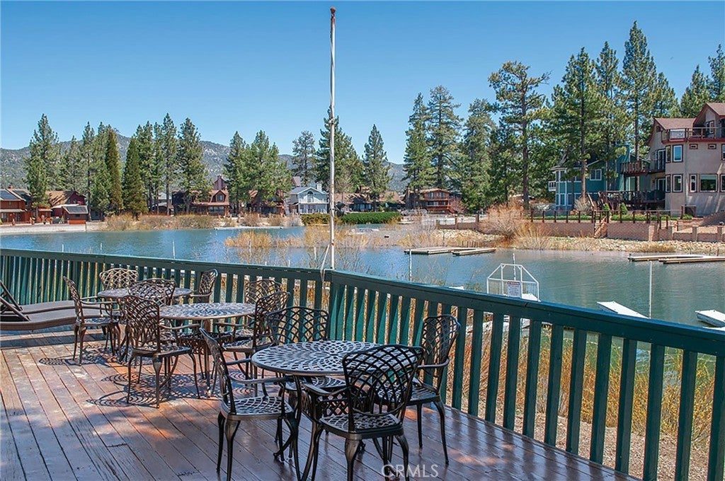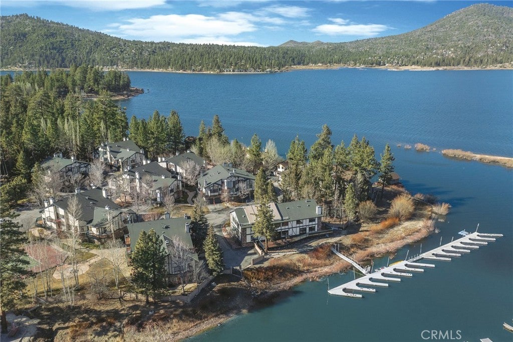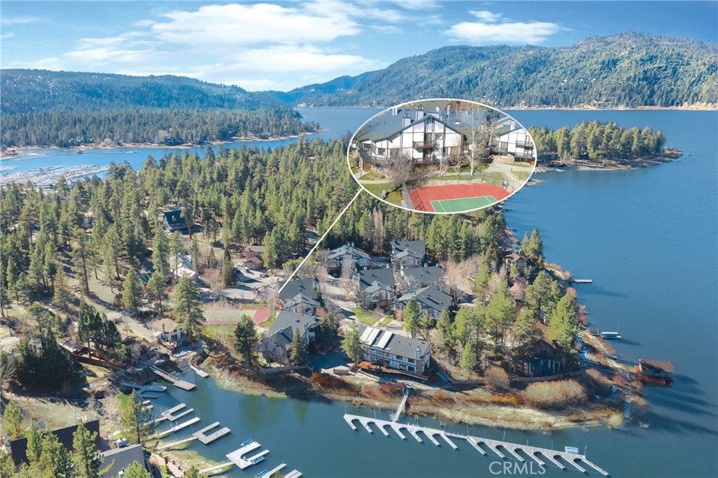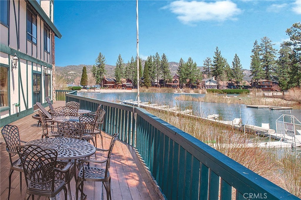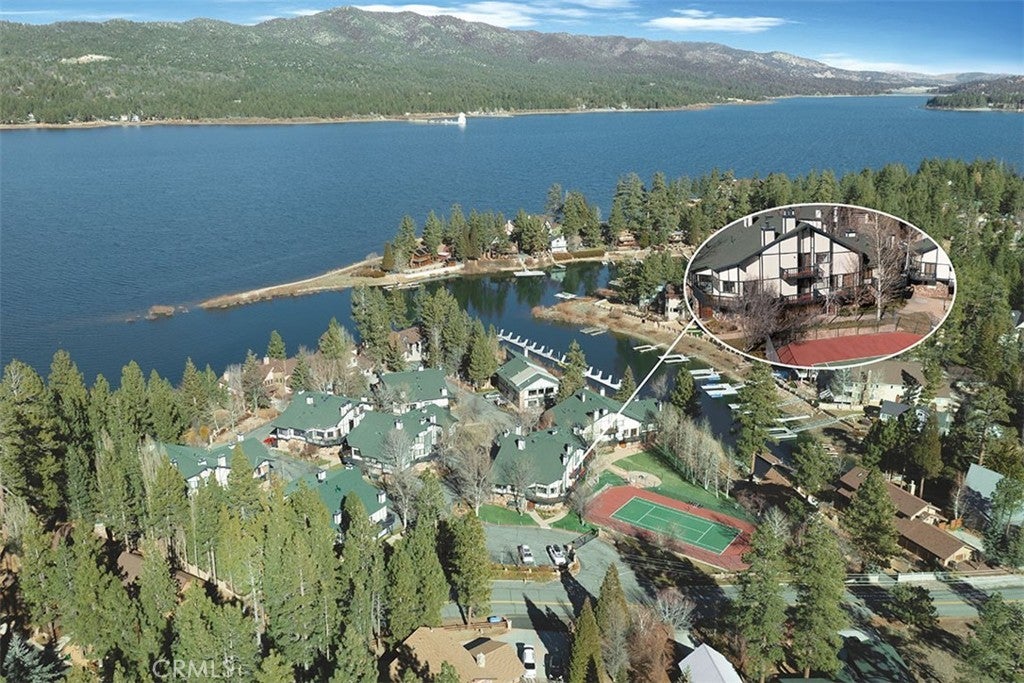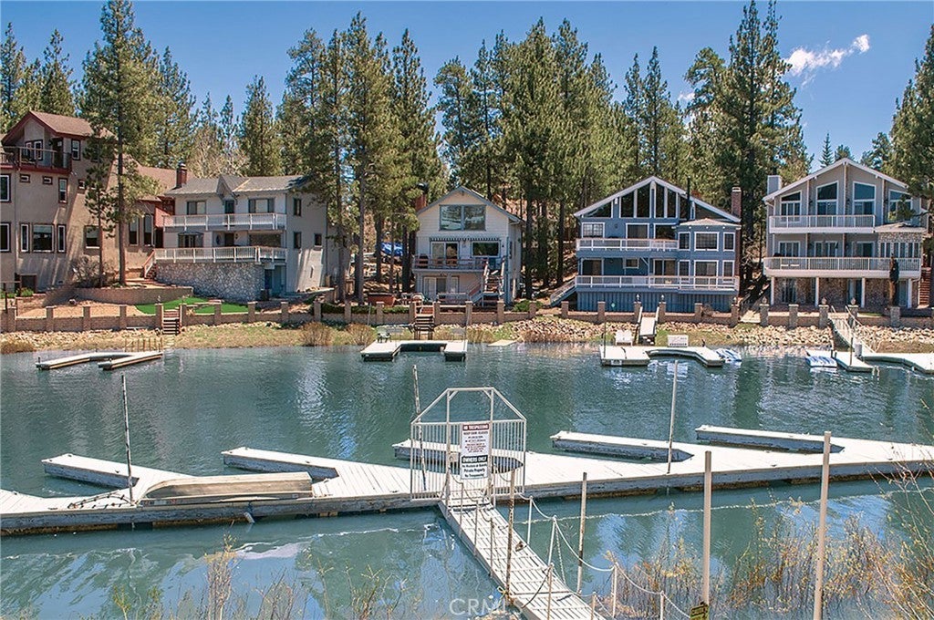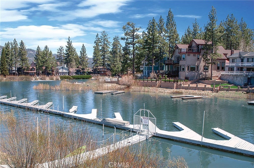 Viking Estates delivers resort-style living at its best featuring great amenities including a dock slip for owners (on a first request basis), lake access to the fun and adventure of the lake & a great clubhouse complex that can be enjoyed in all seasons offering an indoor pool, spa, lakeside sun deck, sauna and locker room, a well-equipped gym & a game room with pool table! Owners may also reserve the lakeside clubhouse for personal gatherings. This south-facing condominium delivers great natural light, updated wood-style flooring & a desirable location that overlooks the tennis-pickleball-basketball area. The open-concept kitchen, living & dining area offers a focal-point fireplace, breakfast bar & French doors opening to one of the homes two sunny decks providing the opportunity to enjoy the outdoors. Featuring 2 en-suite bedrooms + a convenient 1/2 bath, the primary suite boasts soaring vaulted ceilings, a natural gas fireplace, spacious closets, shower/tub, dual-sink vanity & its own deck. There is an in-unit laundry room with washer & dryer included, central heating & an attached single car garage! Offering a rare lakefront-adjacent location with the village shops & restaurants, ski slopes, hiking, mountain biking and many of Big Bear's most popular activities just minutes away! This intimate community is gated for added security. For extra ease, winter snow removal for the interior road & parking areas is handled by the HOA. This unit offers great options as a full-time home or a fantastic personal getaway with the added potential as an income-producing short term rental (STR)!