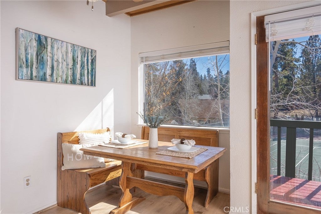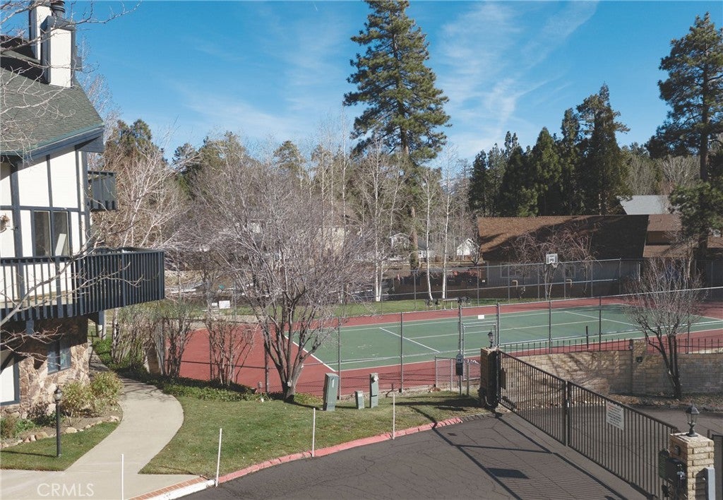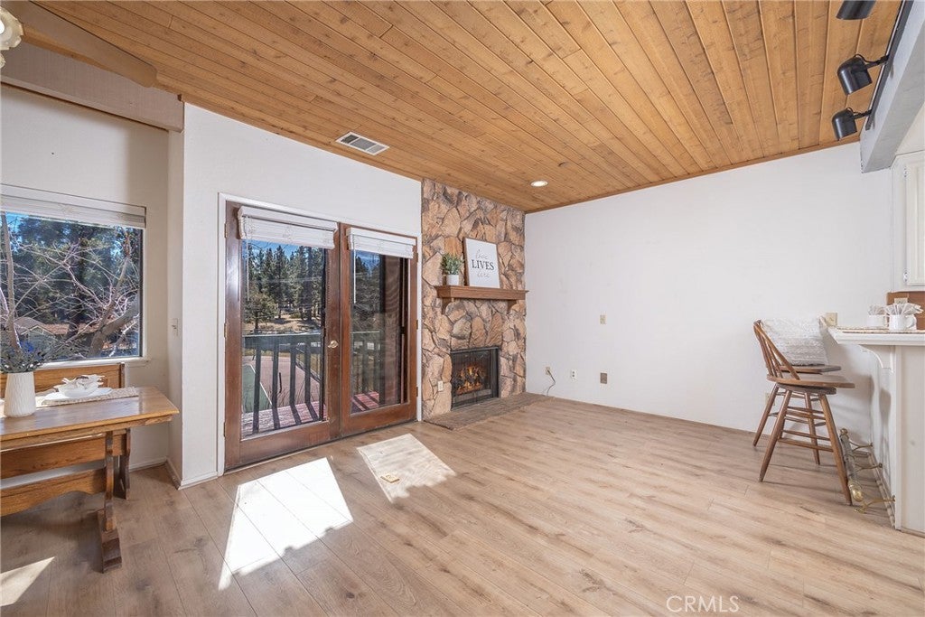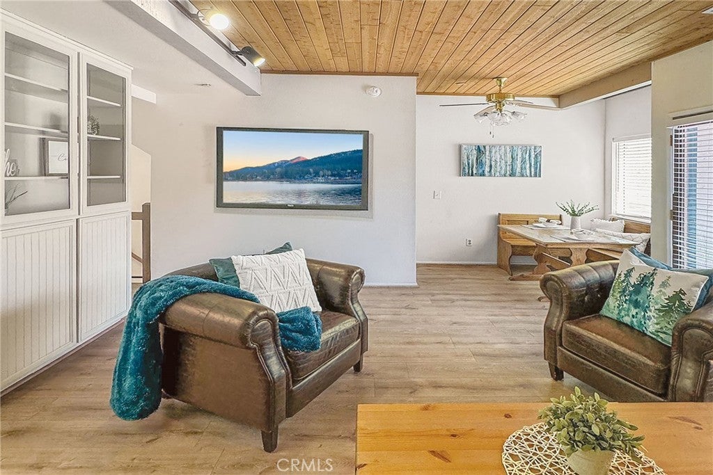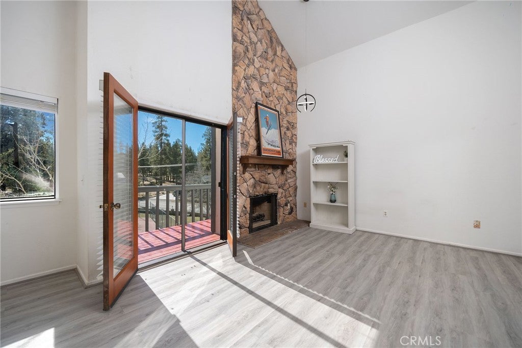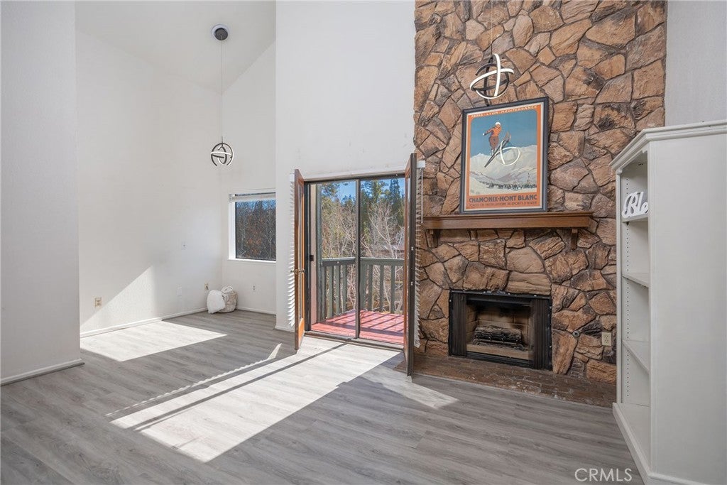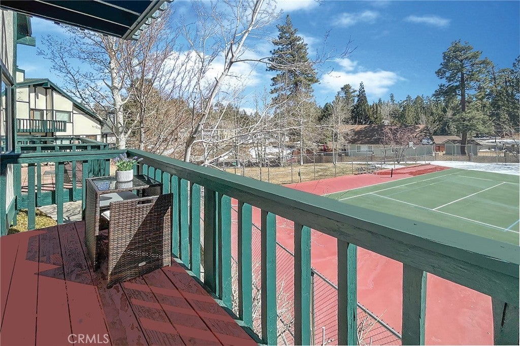 Viking Estates delivers resort-style living at its best featuring great amenities including a dock slip for owners (on a first request basis), lake access to the fun and adventure of the lake & a great clubhouse complex that can be enjoyed in all seasons offering an indoor pool, spa, lakeside sun deck, sauna and locker room, a well-equipped gym & a game room with pool table! Owners may also reserve the lakeside clubhouse for personal gatherings. This south-facing condominium delivers great natural light, updated wood-style flooring & a desirable location that overlooks the tennis-pickleball-basketball area. The open-concept kitchen, living & dining area offers a focal-point fireplace, breakfast bar & French doors opening to one of the homes two sunny decks providing the opportunity to enjoy the outdoors. Featuring 2 en-suite bedrooms + a convenient 1/2 bath, the primary suite boasts soaring vaulted ceilings, a natural gas fireplace, spacious closets, shower/tub, dual-sink vanity & its own deck. There is an in-unit laundry room with washer & dryer included, central heating & an attached single car garage! Offering a rare lakefront-adjacent location with the village shops & restaurants, ski slopes, hiking, mountain biking and many of Big Bear's most popular activities just minutes away! This intimate community is gated for added security. For extra ease, winter snow removal for the interior road & parking areas is handled by the HOA. This unit offers great options as a full-time home or a fantastic personal getaway with the added potential as an income-producing short term rental (STR)!