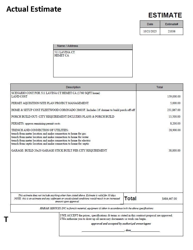 Zoning: Residential Description: Rare opportunity to own a fully improved residential lot in a quiet Hemet cul-de-sac. This build-ready lot comes with all major utilities in place: Water meter installed Gas line connected Power pole on site Certified septic tank – ready for use Permits are pre-approved for installation of a manufactured home up to 1,800 sq. ft. and a stick build garage. The seller is a licensed contractor and can assist with installation and setup and show you options of the manufactured home from start to finish. Financing options are available with low down payment we can help with that as well. Important Disclosure: Lot is being sold land-only. Manufactured homes are NOT INCLUDED in the sale price and CAN be purchased separately. Enjoy convenient access to shopping, restaurants, schools, medical facilities, and outdoor recreation including Diamond Valley Lake, golf courses, and hiking trails. This is a rare, turnkey-ready opportunity for buyers looking to build or place a manufactured home in Hemet.