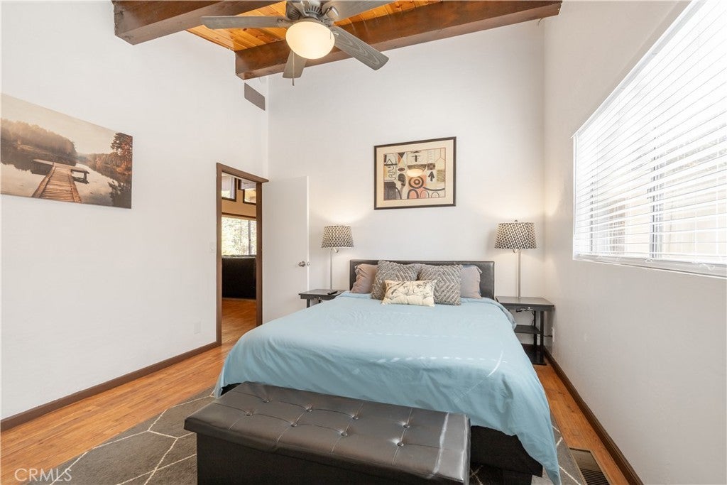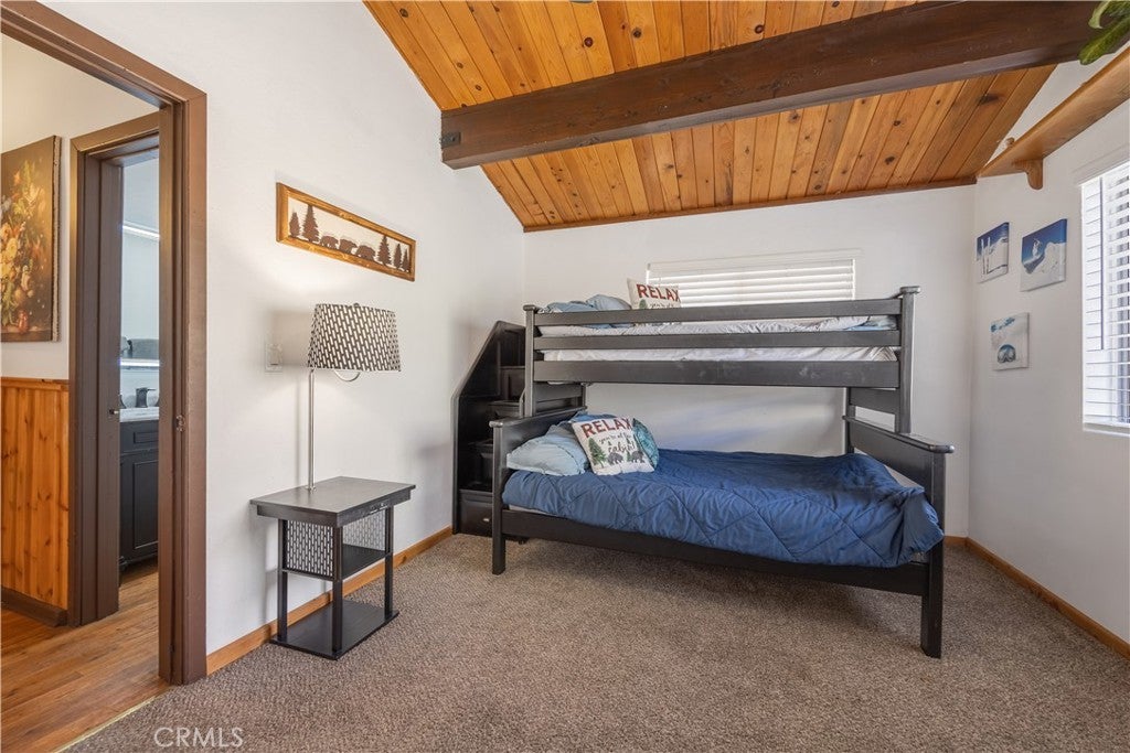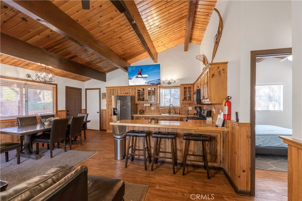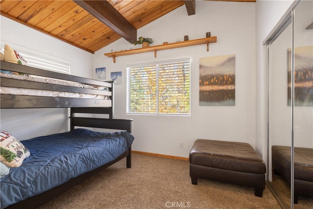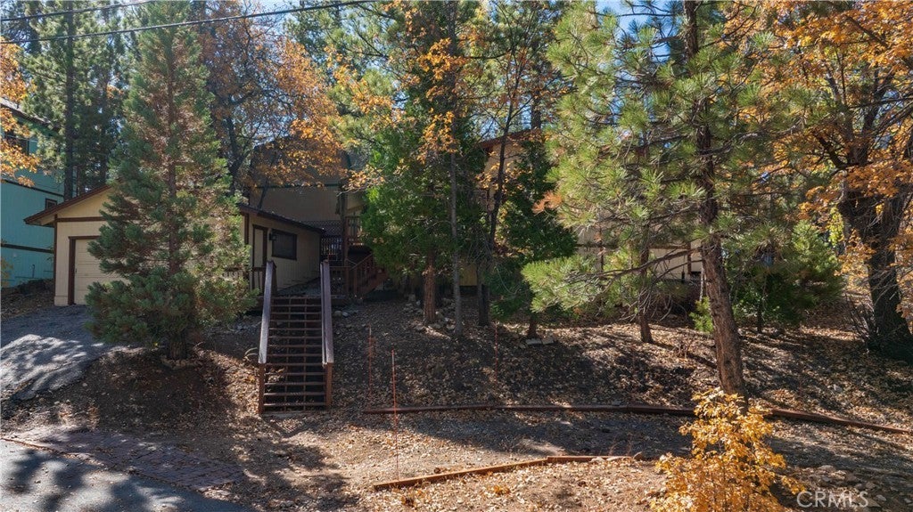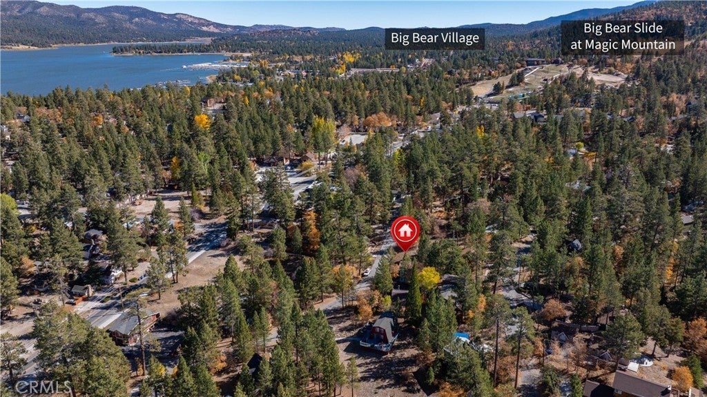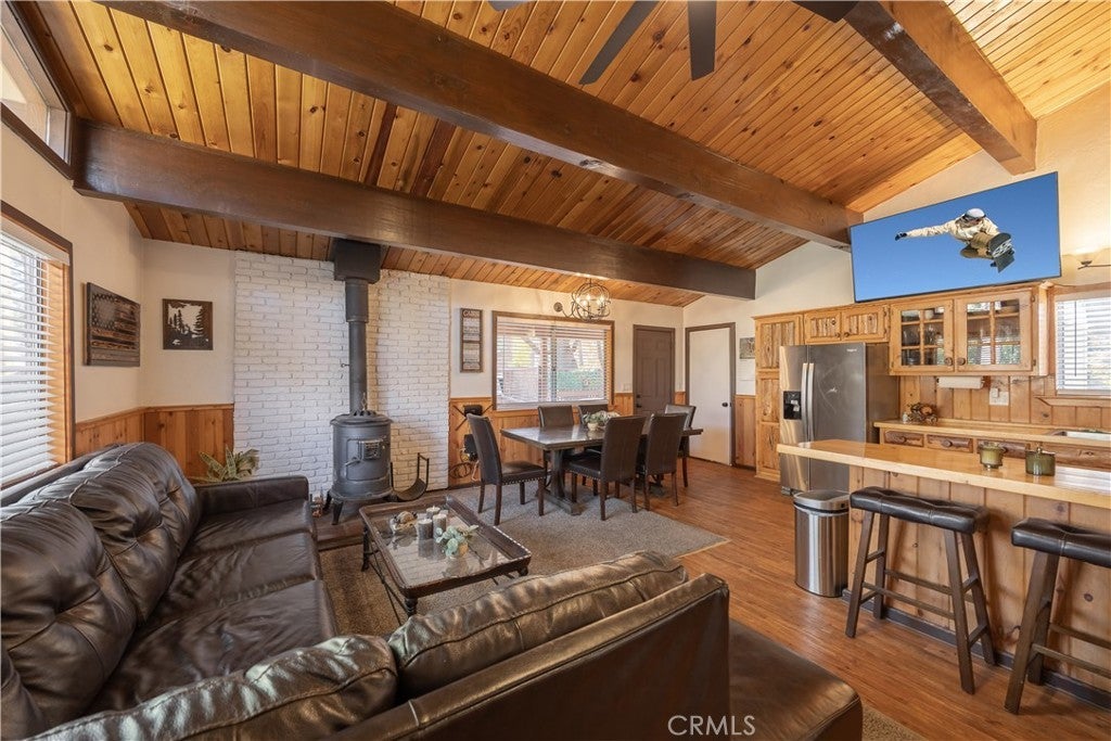Discover this charming, updated mountain cabin on a spacious 9,200 sq. ft. lot surrounded by trees. Featuring vaulted T&G ceilings, exposed beams, a cozy wood-burning stove, and an open floor plan that flows to a large wraparound deck with hot tub—perfect for relaxing or entertaining. This single-story retreat offers 2 bedrooms, a remodeled bath, a stylish kitchen with custom wood cabinets and stainless appliances, plus a heated sunroom with laundry. Enjoy a two-car garage, extra parking in the circular driveway, and a storage shed for your mountain toys. Tucked away near Boulder Bay, the Village, and forest trails, this home blends rustic charm with modern comfort—your peaceful Big Bear escape awaits!