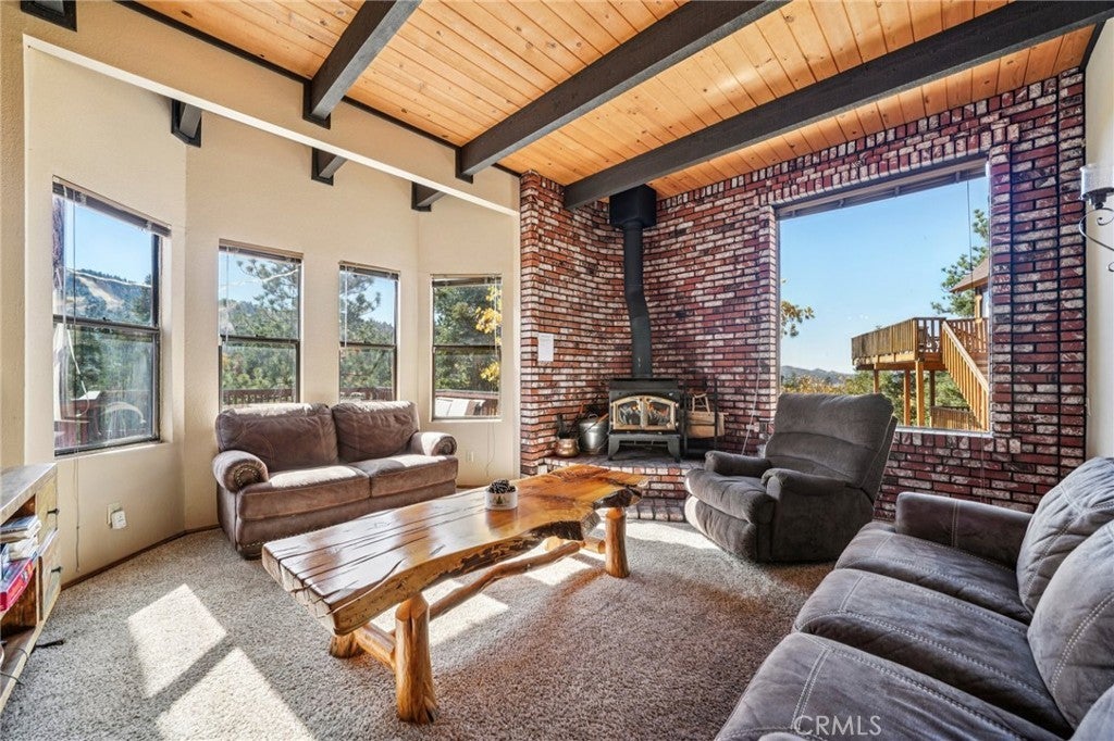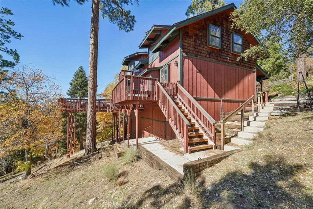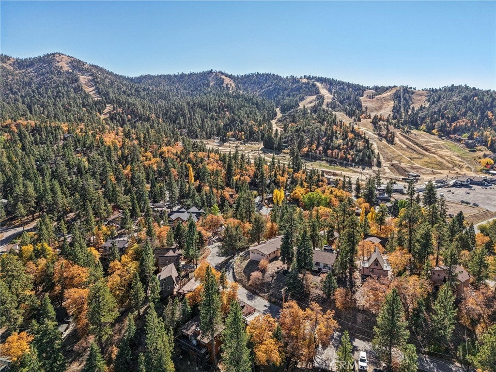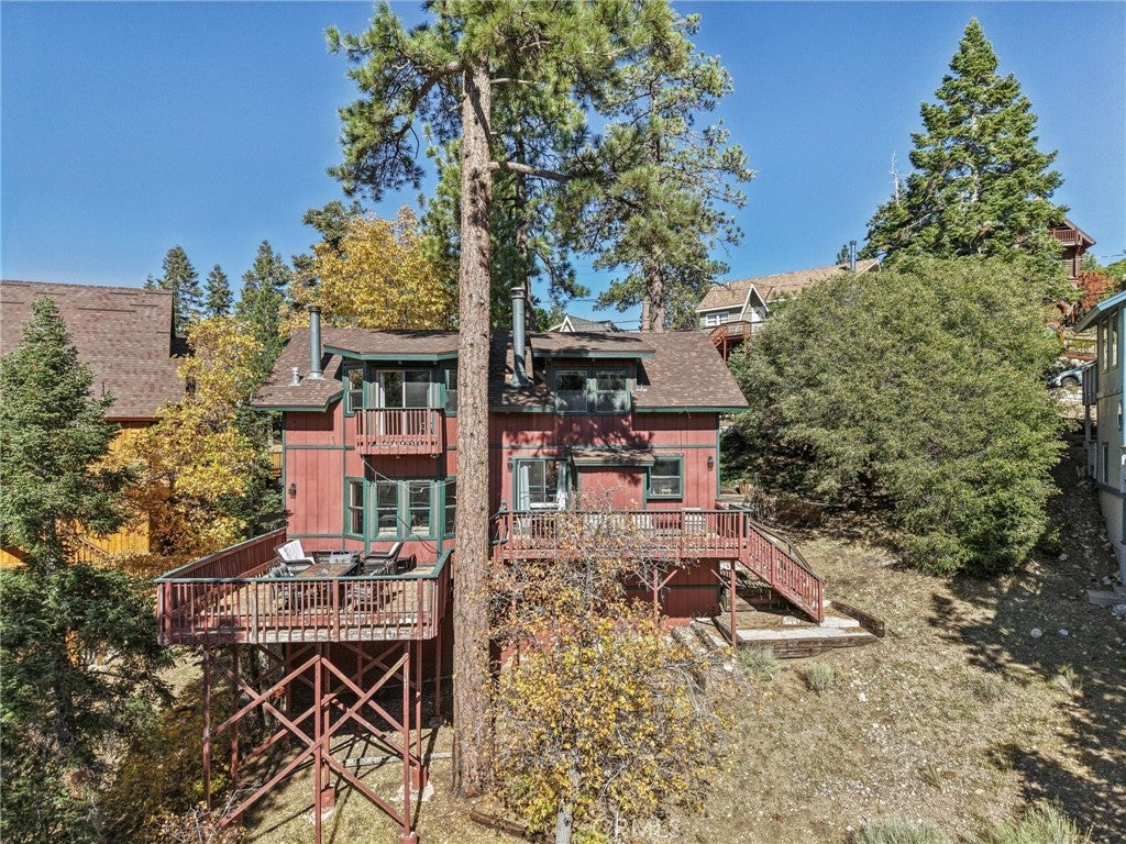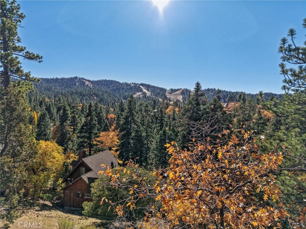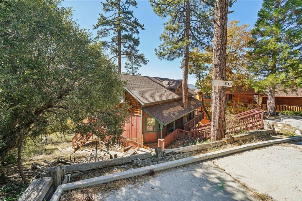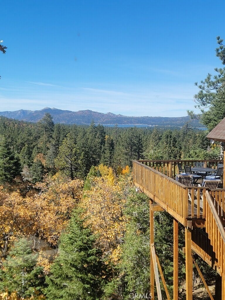 Enjoy incredible views of the lake, ski slopes, and forest from this beautiful Moonridge retreat! The expansive deck is perfect for outdoor dining and lounging while taking in the stunning scenery. Inside, the open floor plan combines the living, dining, and kitchen areas under a charming wood-beamed ceiling. The living room features large view windows and a wood-burning stove with a brick surround and raised hearth, creating a cozy mountain ambiance. The kitchen offers stainless steel appliances, a peninsula with bar seating, and a convenient laundry closet. There are two main-level bedrooms and a full bathroom. Upstairs, a spacious loft with a second fireplace makes a perfect additional living or game room. The primary suite includes a full en suite bathroom and a private balcony—ideal for enjoying the mountain and forest views. Additional highlights include a newer roof (2022), spacious parking pad and a prime location close to the zoo, golf course, and Bear Mountain Resort.
