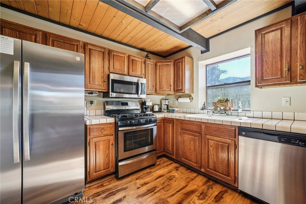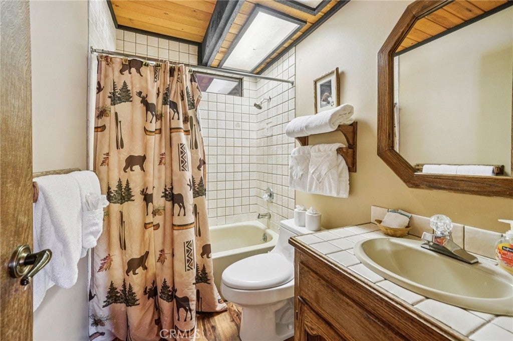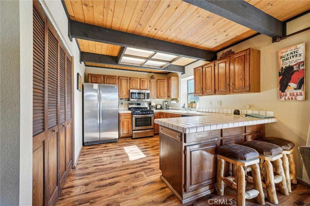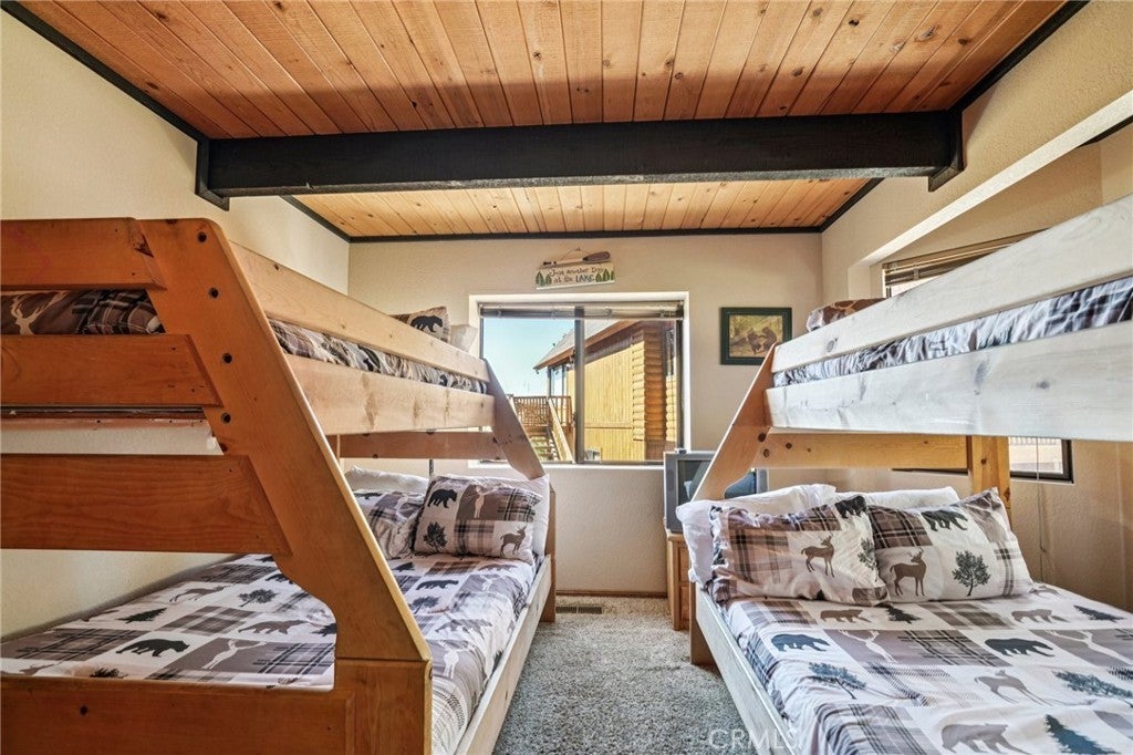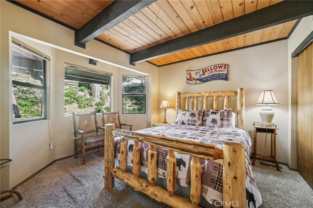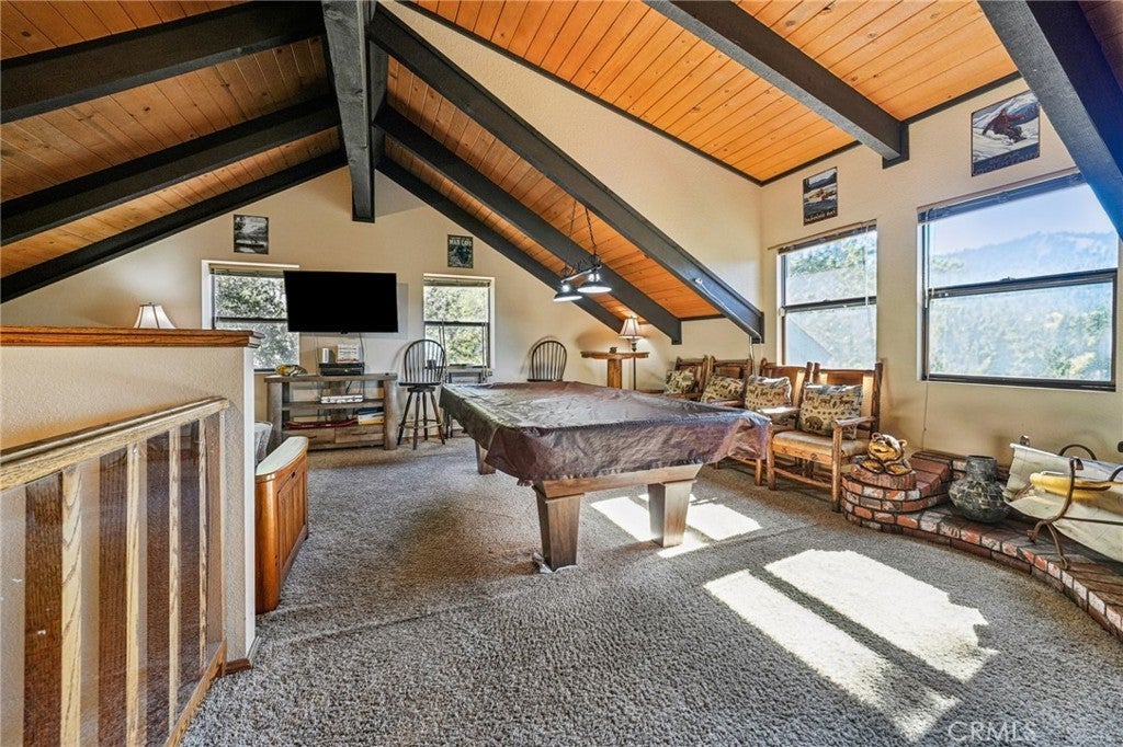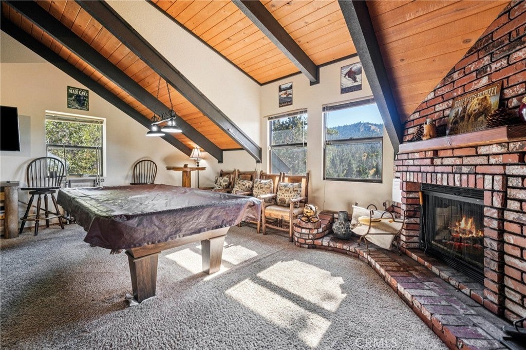 Enjoy incredible views of the lake, ski slopes, and forest from this beautiful Moonridge retreat! The expansive deck is perfect for outdoor dining and lounging while taking in the stunning scenery. Inside, the open floor plan combines the living, dining, and kitchen areas under a charming wood-beamed ceiling. The living room features large view windows and a wood-burning stove with a brick surround and raised hearth, creating a cozy mountain ambiance. The kitchen offers stainless steel appliances, a peninsula with bar seating, and a convenient laundry closet. There are two main-level bedrooms and a full bathroom. Upstairs, a spacious loft with a second fireplace makes a perfect additional living or game room. The primary suite includes a full en suite bathroom and a private balcony—ideal for enjoying the mountain and forest views. Additional highlights include a newer roof (2022), spacious parking pad and a prime location close to the zoo, golf course, and Bear Mountain Resort.