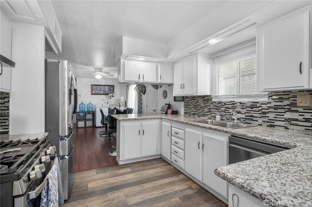 Welcome to the gated Swan Lake community, offering resort-style living with an attendant at the gate, clubhouse, swimming pool and spa, sports court, and a serene fishing lake. This spacious home sits on a desirable lot and features a carport with a fenced side patio and side yard—great for outdoor relaxing or gardening. Fruit trees and a storage shed add to the charm and functionality of the outdoor space. Inside, the main living area features laminate flooring and a wonderfully open layout. The large family room flows into the dining room, which includes built-in cabinetry for added storage and display. The kitchen is bright and inviting, equipped with granite countertops, tile backsplash, and a cozy breakfast nook with washer/dryer hookups nearby for convenience. The primary bedroom is generously sized and includes a closet and additional built-in cabinetry. The primary bathroom offers dual sinks and a vanity area. There is also a second bedroom and full bathroom inside the main home. A standout feature of this property is the ADU (Accessory Dwelling Unit), providing a versatile living space complete with a bedroom, bathroom, and kitchenette—ideal for guests, extended family, or rental income potential. This is a wonderful opportunity to enjoy comfortable living in a community with exceptional amenities. Don’t miss your chance to make this home yours!