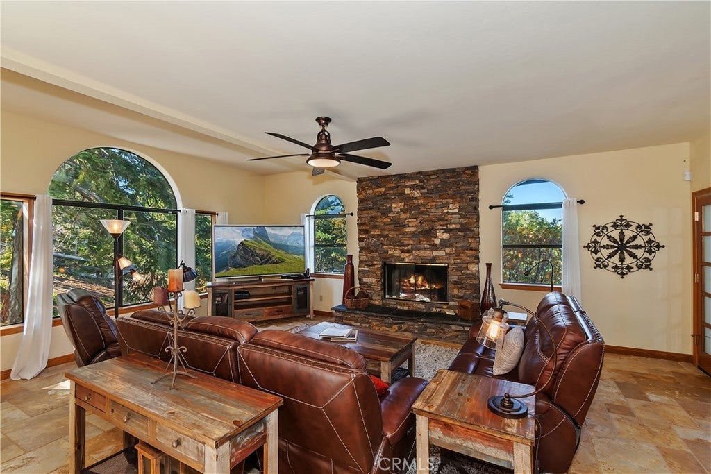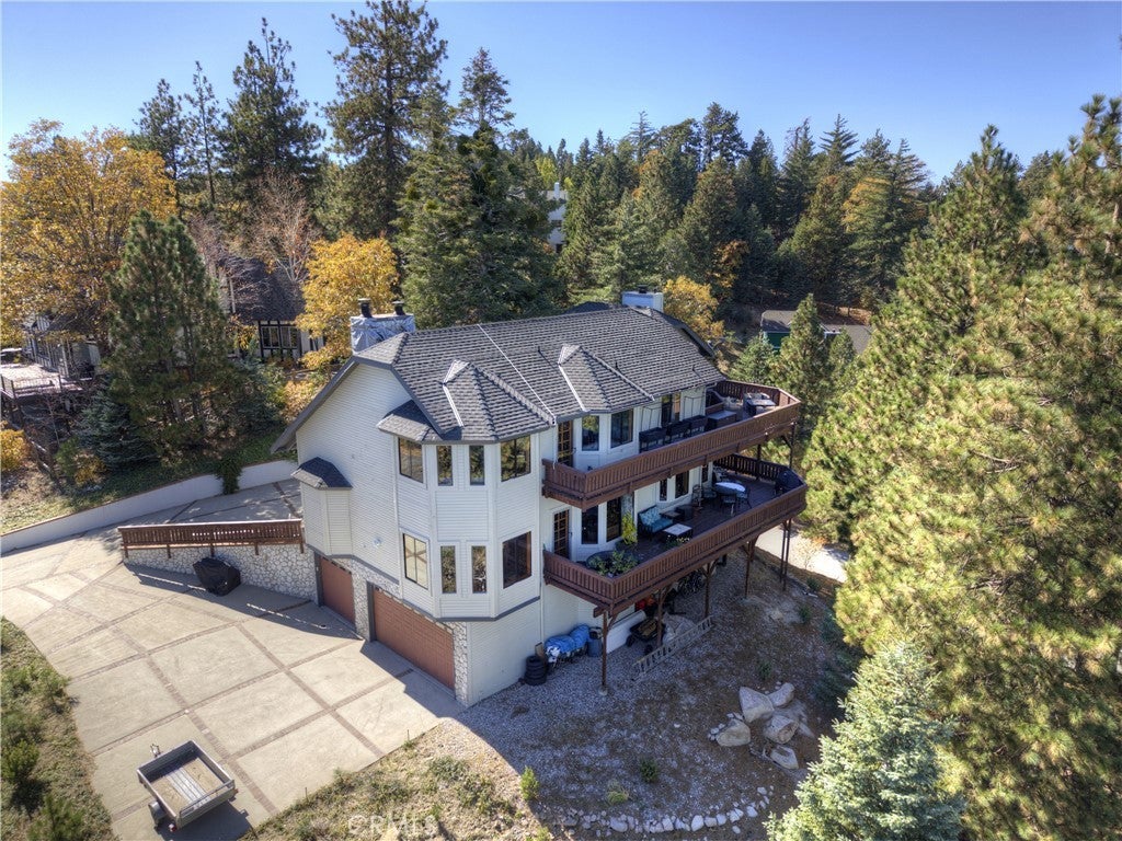 Experience the ultimate mountain retreat with this stunning 2-acre estate in the Lake Arrowhead Summit! Boasting 270-degree breathtaking views, this estate has 3 separate buildable adjacent lots. Located at end of private driveway offering incredible privacy and versatility. All public underground utilities ensure a seamless, unobtrusive setting nestled in a lush, forested landscape. ~ Designed for comfort and convenience, the home features a level-entry with a guest bedroom and bath on the main level, perfect for visitorsor home office. A spacious four-car garage, including a dedicated space for your golf cart or toys, plus ample RV, boat, and vehicle parking, make this property truly exceptional. ~ Relax in the living room with a cozy fireplace or unwind in the family room, also with a fireplace, both opening to expansive deck ideal for outdoor living and taking in the stunning vistas. The luxurious master retreat offers a spa-like bath, fireplace, walk-in closet, and a private deck with unobstructed views—your personal sanctuary. ~ Enjoy modern comforts like A/C and full privileges to the pristine waters of Lake Arrowhead. For your convienece can come furnished, decorated & fully equipped. ~ This unique estate offers nothing else like it—your mountain paradise awaits! Re-cap: 3100sq' on 2 acres including 3 additonal view lots each about 1/2 acre downslope for easy level-entry & garage builds. 3.5 car garage. Level-entry with 1 bed/bath on main level. Views from every window & every deck. RV & Boat parking plus multiple cars. New central A/C & Heat. Copper plumbing. Master retreat with private deck, fireplace, spa-tub. Underground utilities.... Wow! 3 additional lots to be purchased with House for addtional $100k. Those lots are: 26133, 26155, 26091 Walnut Hills.. all are downslope with panoramic views. Lots are 21,420sq' , 24,500sq', 21,420sq'.