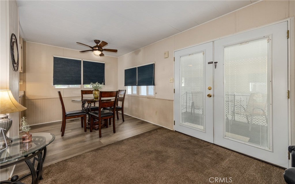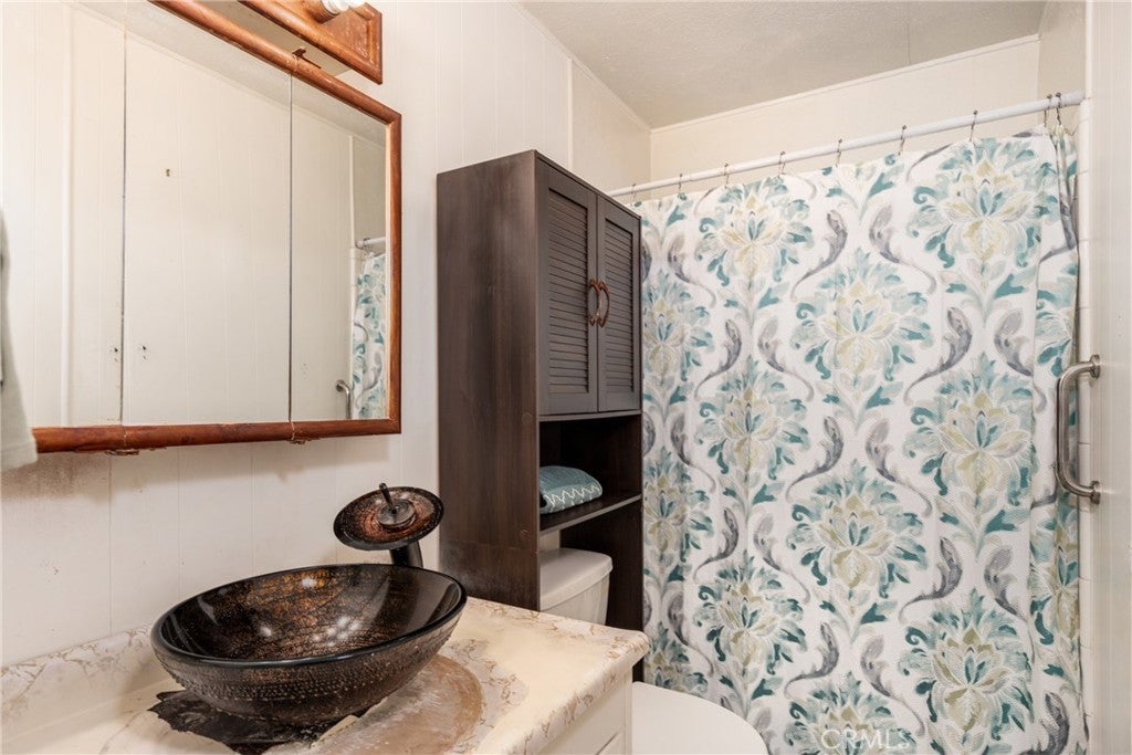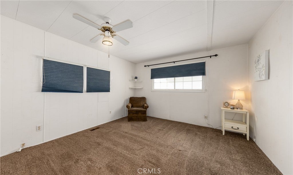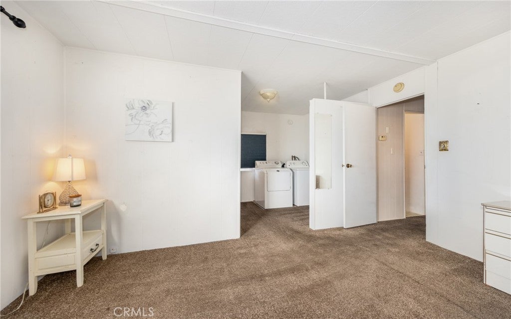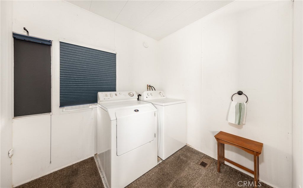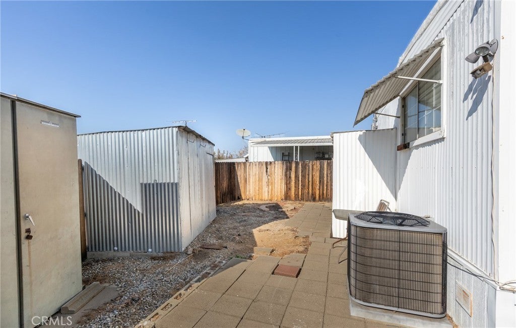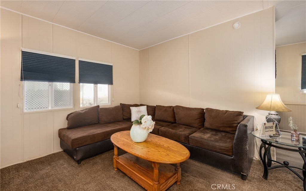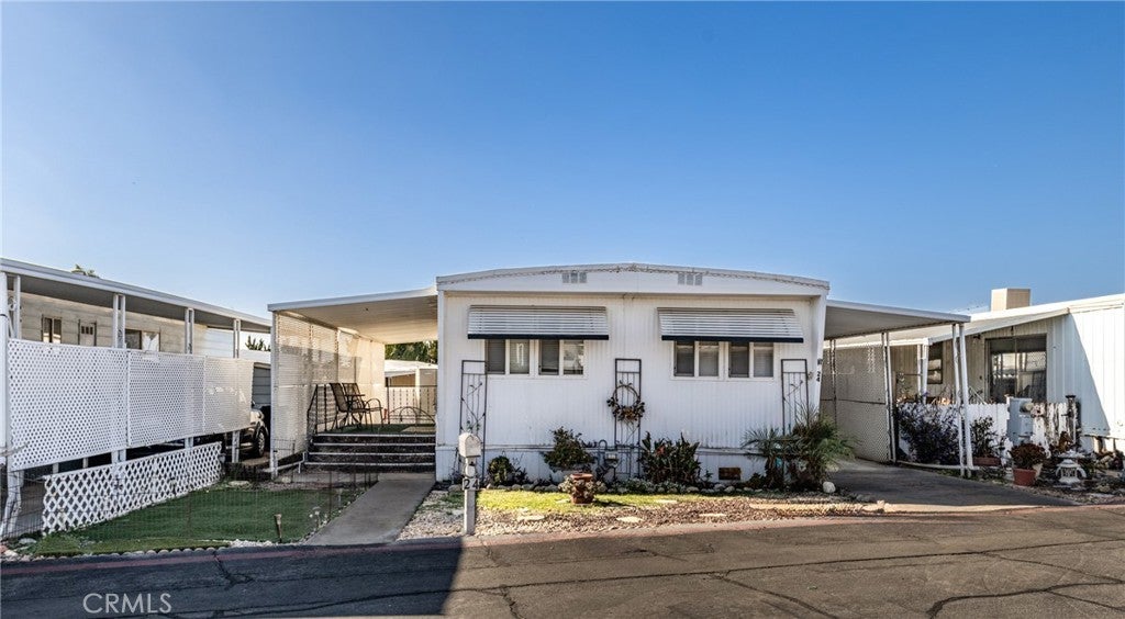 WELCOME HOME! This QUAINT & SPACIOUS PROPERTY has been THOUGHTFULLY CUSTOMIZED by the seller. The paneling throughout has been painted offering a brighter and upgraded interior. The home contains dual paned windows, a 2 year old HVAC offering central heat and air which adds to your monthly cost savings. A new main plumbing line was also installed a year ago. As you enter, a nice sized living room welcomes you. The kitchen and dining areas flow seamlessly providing a pleasing floorplan. While sitting at the dining room table, the newer windows provide ample natural light. The bathroom has a bowl sink adding an upgraded style to the space. This home was previously a two-bedroom home; however, the seller has customized the bedroom, providing a single primary suite that offers ample space, a walk- in closet with an indoor laundry area as well. The covered carport provides covered parking, there are 3 storage sheds that stay with this property with 110v electrical in all 3 sheds. The covered front porch provides extra living space as well outside. The current space rent is $416.31 which includes water, trash, sewer and access to the community pool/spa and clubhouse. If you are looking for a spacious 1- bedroom home, please come see this home in person!