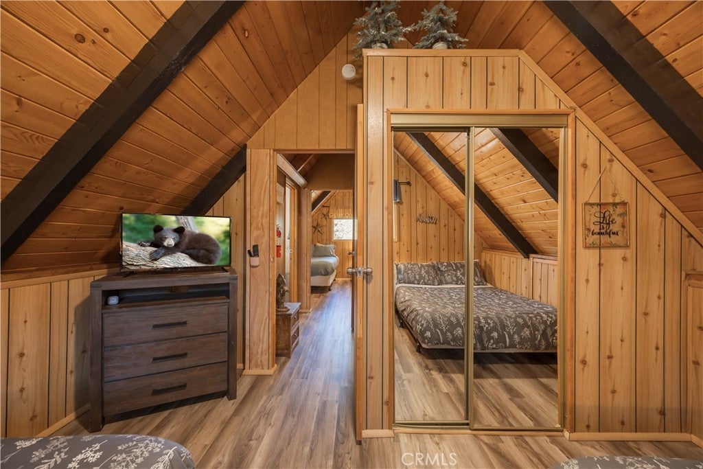 Experience the perfect blend of rustic charm and modern comfort in this 1,300+ sq. ft. cabin surrounded by towering pines and backing to acreage. Beautiful wood floors and tongue-and-groove wood beam ceilings & vaulted ceilings upstairs create a warm, authentic mountain vibe. Features include two bedrooms, two baths, and an open kitchen with stainless appliances and granite counters. Enjoy cozy evenings by the wood-burning fireplace or entertain in the step-down game room w/non-conforming sleeping area in the loft; game room also has a pool table and separate entrance. A spacious deck and fenced yard offer ideal outdoor living. Recent upgrades include a new roof and windows. This successful AirBNB is conveniently located just minutes from ski resorts, the lake, and The Village. Furnishings are negotiable.