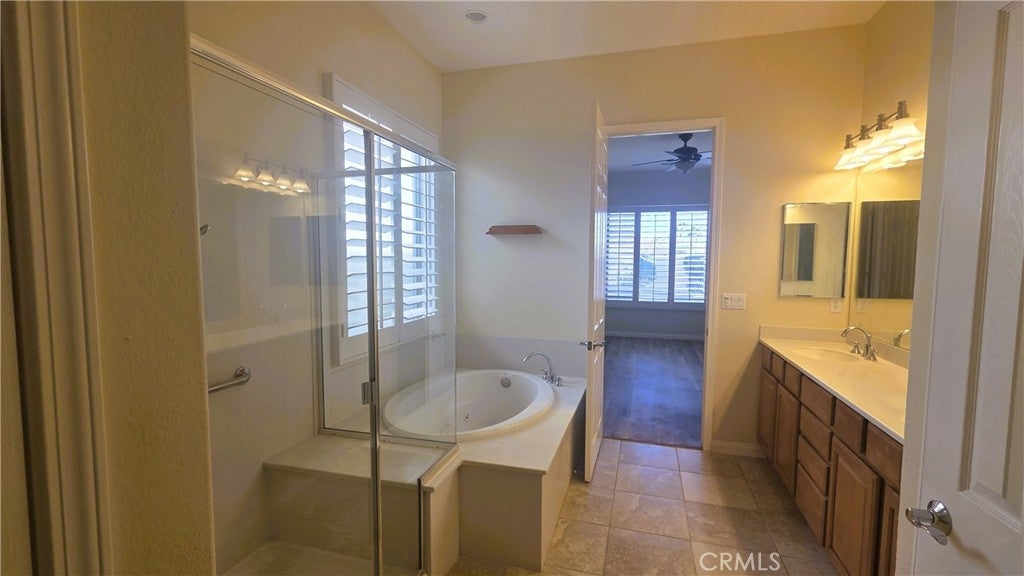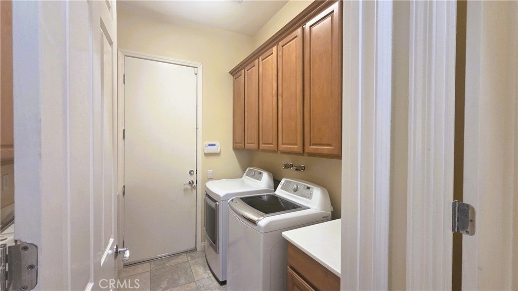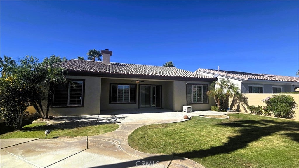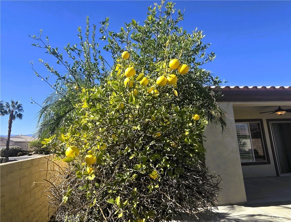 Welcome to the CASTELLANO MODEL—where charm meets grandeur. This is a great Corner-Lot with lovely curb appeal. A half-walled courtyard greets you as you approach. What a perfect spot to have dinner al fresco with palm trees rising like royalty against the distant mountain views. Entering the home you immediately find an office or den space. This room could easily be used as a 3rd guest bedroom. Traveling further into the home you will find the forgotten treasure of a formal dining room. Perfect for those large gatherings or hosting a mahjong game night. The stylish, open-concept kitchen was designed for everyday ease but clothed in rich granite and maple hued cabinets. This kitchen features sleek stainless-steel appliances—including a double wall oven, dishwasher, microwave, double sink & a sleek black 5 burner cook top. A central island offers additional prep space and storage. A cozy breakfast nook completes the kitchen area. The open layout flows effortlessly with bar seating off the kitchen counter into the adjacent living room, creating a seamless space for entertaining or relaxing. Large windows & a massive sliding glass door with plantation shutters bathe the room in natural light. A guest half bath & laundry room with tons of cabinets & a utility sink, round out this area. The Bedrooms are on opposite sides of the home, evoking separate wing living. The master is large & bright with a master bathroom retreat. A glass-enclosed shower with a built-in bench offers both comfort & accessibility, while the adjacent soaking tub—set beneath welcoming windows—creates the perfect spot to unwind in natural light. The dual-sink vanity stretches across the opposite wall and features sleek solid-surface countertops. There is an expansive walk-in closet with plenty of room for all your shoes or clothes obsessions. The 2nd bedroom is down its own hallway with a full bathroom located right before entering. Venturing out to the back yard you will find your own serene retreat—this beautifully landscaped backyard offers relaxation by the fire-pit, mountain views, & a lemon tree that is ready to lend its zest to your next cocktail. The covered patio is ideal for morning coffee, evening cocktails, or weekend gatherings. This spotless, oversized 2.5 car garage is a dream for homeowners who value organization & functionality. Ceiling-mounted metal grid racks provide overhead storage, while custom wall-mounted cabinets keep tools & supplies neatly tucked away.