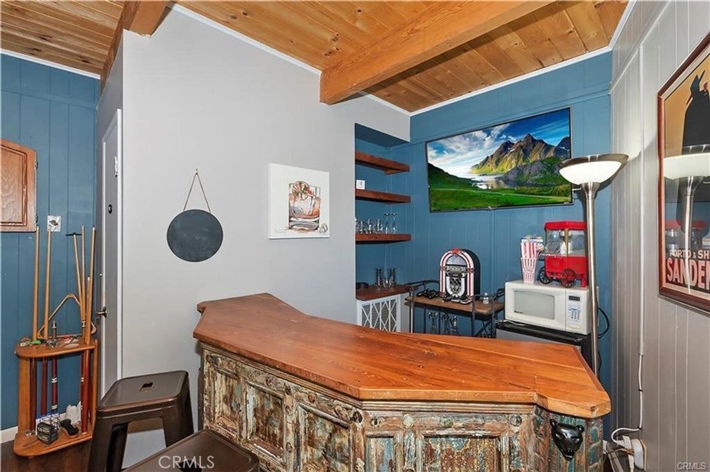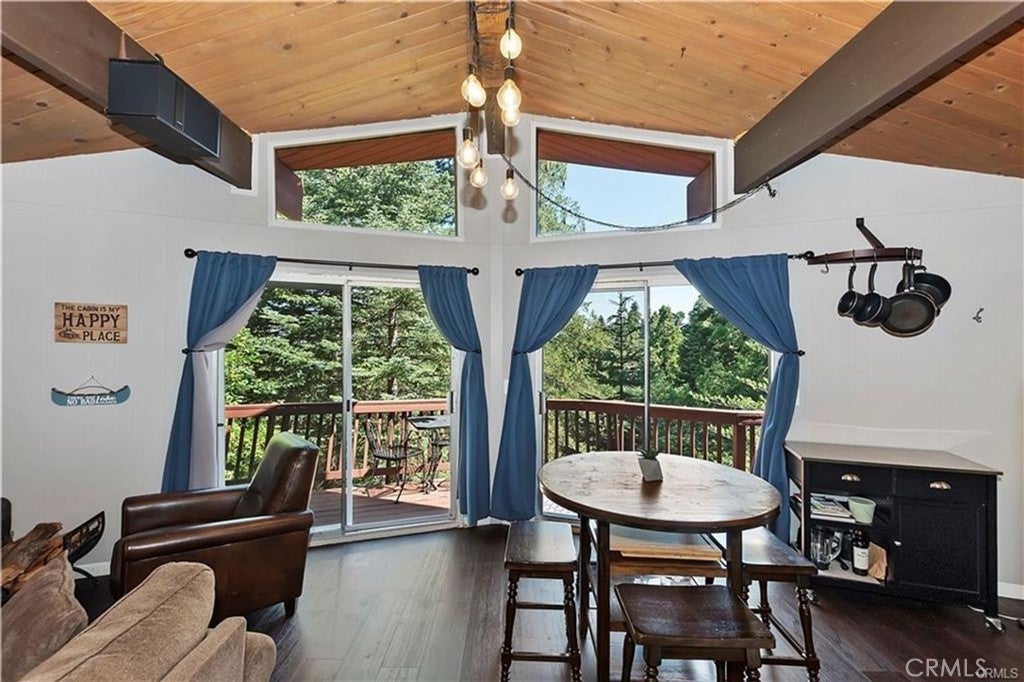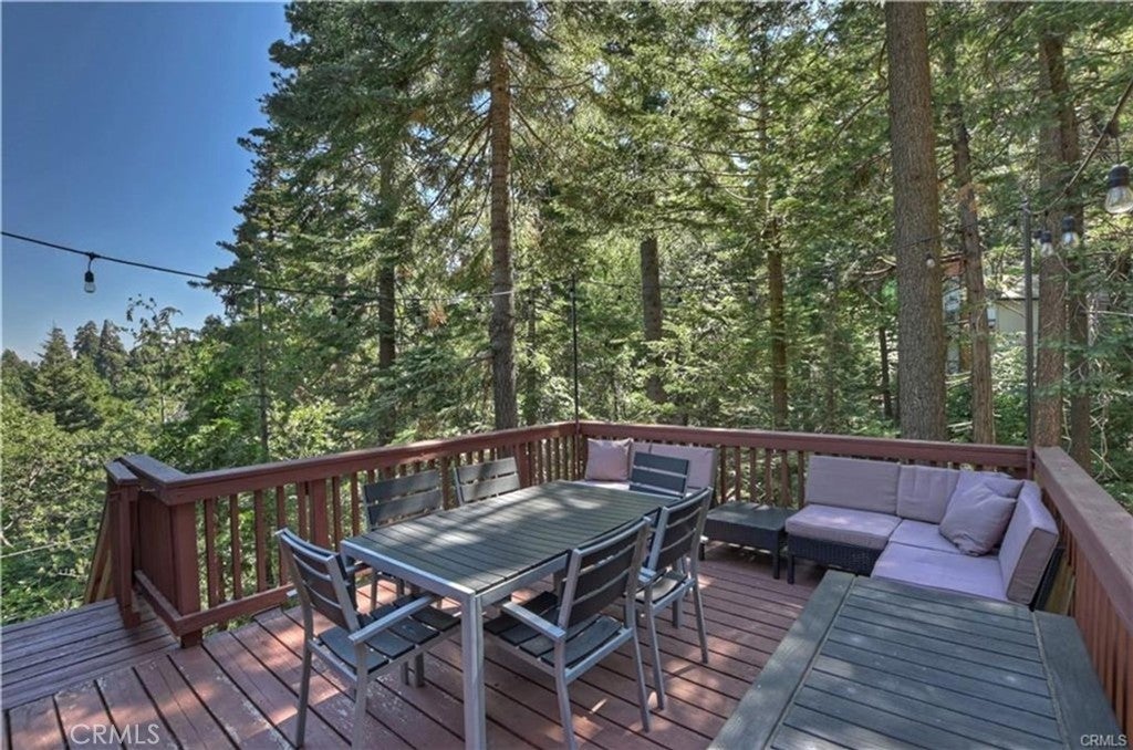 Treehouse-like atmosphere with peek-a-boo views of Lake Arrowhead. The main level features a welcoming kitchen, dining, and great room area, along with a comfortable bedroom that has its own deck—perfect for morning coffee or evening relaxation. A full bath and a cozy nook for office space are also on this level. Downstairs includes a second bedroom, a 3/4 bath, a laundry closet, and a versatile game room with a dry bar—ideal for family game nights or entertaining friends. This property comes fully furnished, from cozy living room seating to comfortable beds, and from kitchen essentials to outdoor furniture. Recent upgrades ensure comfort and reliability, including a full house generator, new plumbing pipes, an indoor water shut-off valve, an updated electrical panel, fresh flooring throughout, and a new central heating system. The adjacent lot enhances your sense of privacy and provides extra outdoor space. While the steep slope and stairs offer a challenge, they also provide unparalleled privacy and stunning forest views. With Lake Arrowhead's growing popularity among Southern California residents seeking weekend escapes