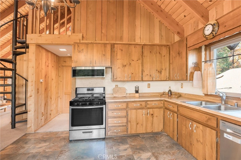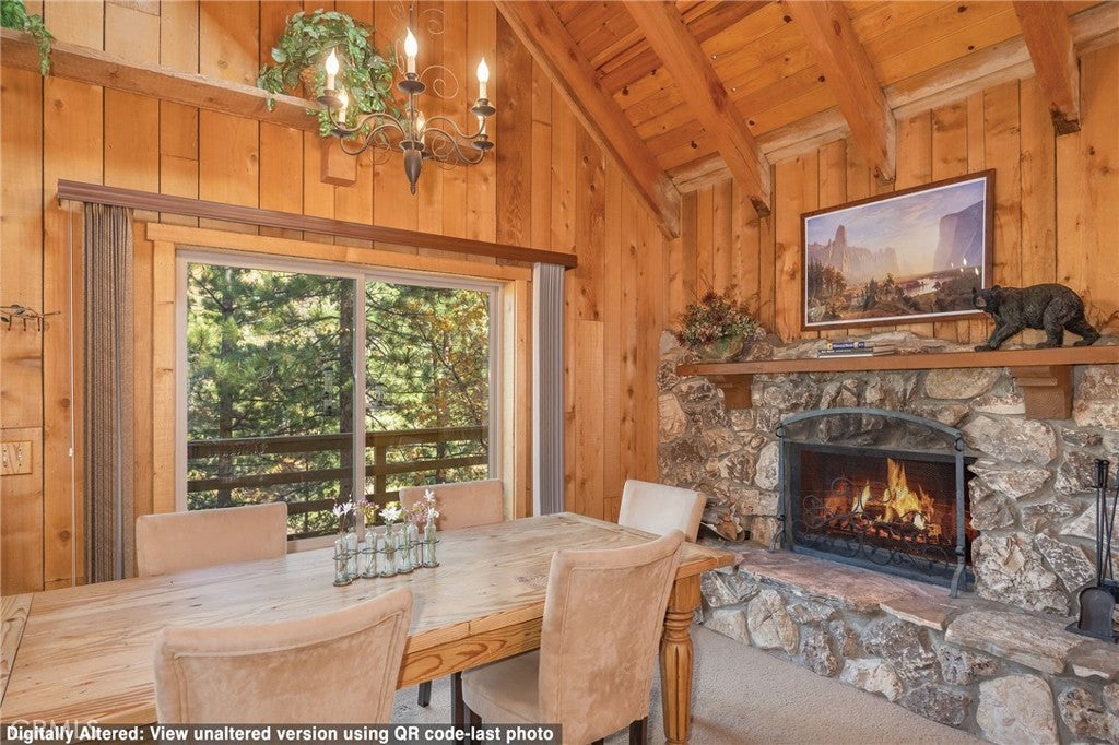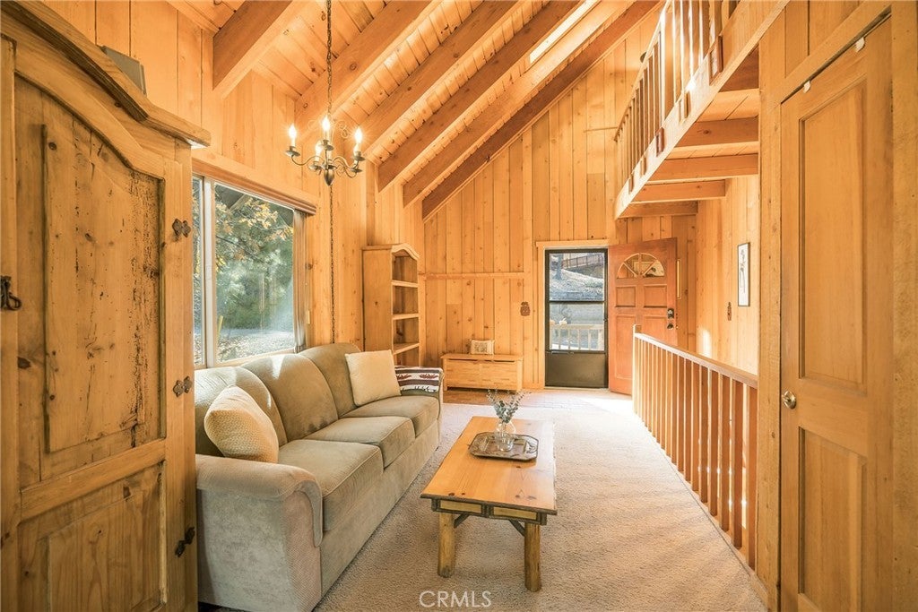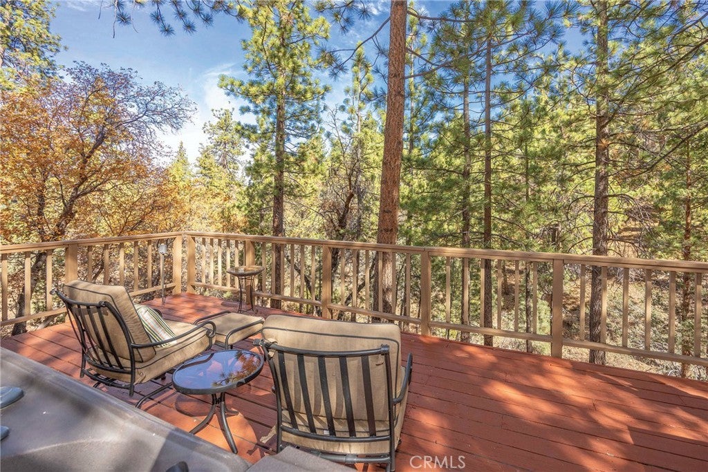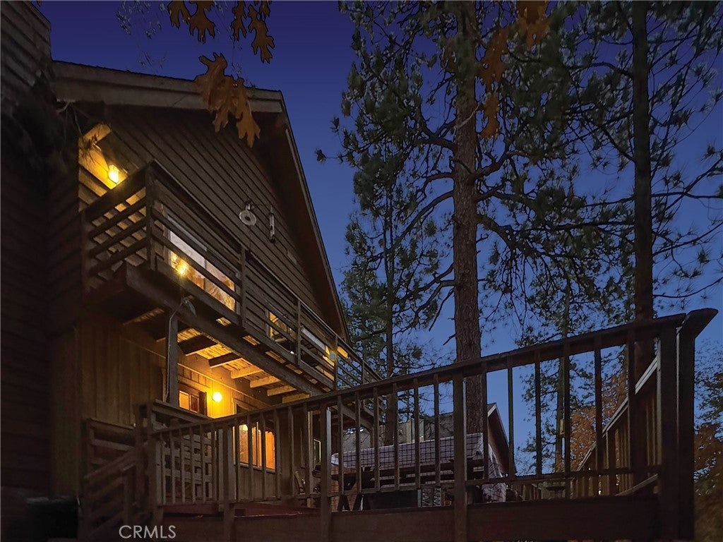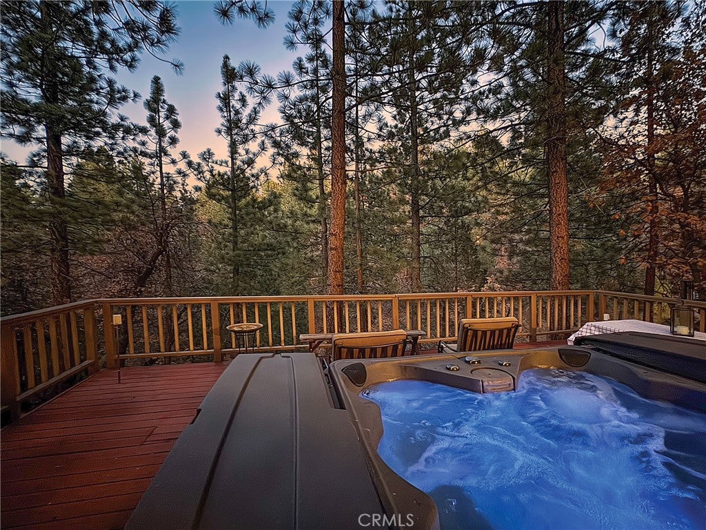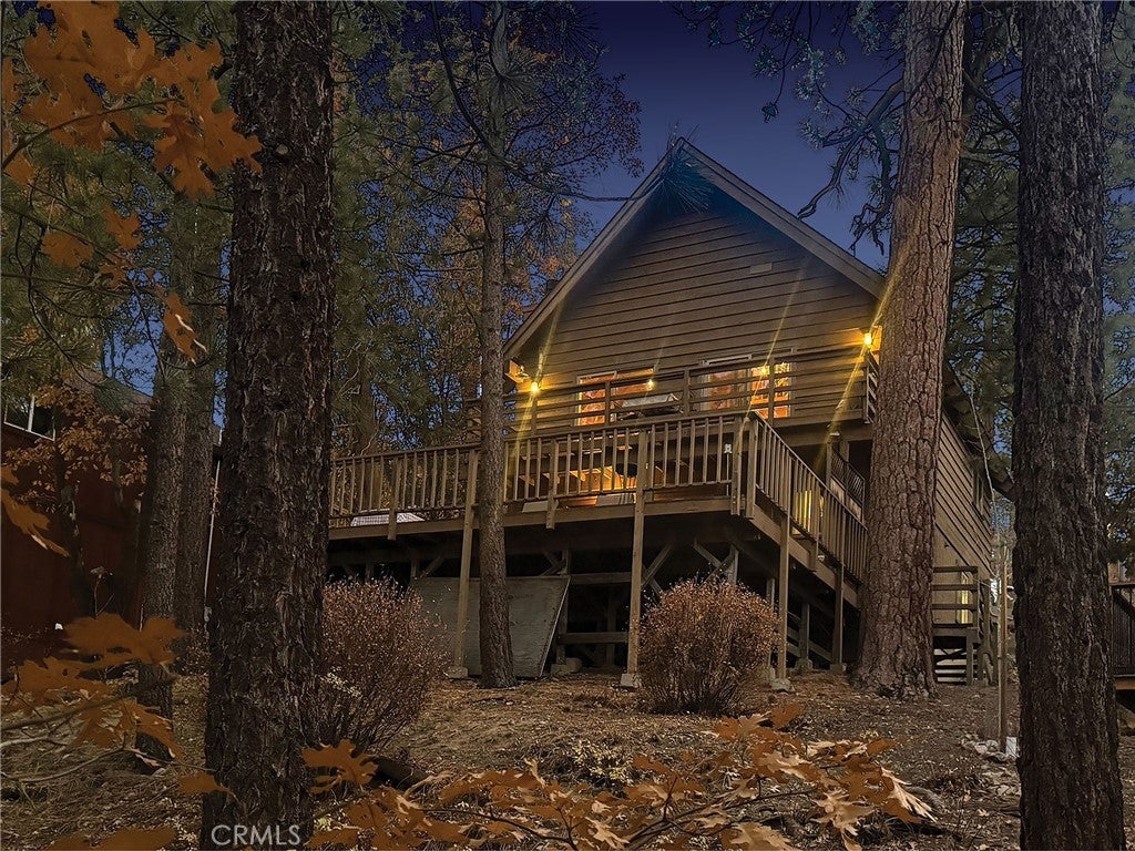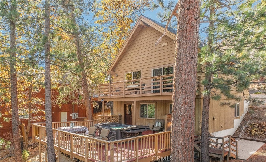 Experience the magic of Moonridge in this wonderful home, where the soaring beamed ceiling, architectural lines, and thoughtfully crafted wood details create a space that feels naturally radiant and beautifully grounded. The spacious kitchen with updated appliances and the dining area overlook a beautiful stone fireplace, with a skylight above it adding soft natural light and a wall of glass framing a stunning treed backdrop—unforgettable when dusted with snow. The expansive deck off the kitchen is wonderful for barbecuing or morning coffee. The inviting primary bedroom enjoys warm, restorative afternoon light, a large closet, and a charming bay-window seat. The main-floor bath is beautifully updated with custom tile, a granite-topped vanity, and a built-in linen cabinet. The home’s windows & sliding door were replaced w/dual-pane in 2019. The dramatic spiral staircase leads to a large loft, used as the third bedroom, with room for a crowd. Downstairs is a fantastic gathering/game room featuring a pool table and a brick wood-burning fireplace, creating a fun and welcoming space to relax, watch TV, and hang out with friends or family. There is a wonderful guest bedroom with log accents delivering mountain charm. The downstairs bathroom is conveniently located and features a large custom shower. The supersized laundry room offers a washer/dryer, storage, a workbench, and easy access to the water heater and heater—making home projects and seasonal upkeep easier. The amazing deck immerses you in the sights and sounds of nature, delivering outdoor living at its most inspiring. The exceptional spa—offering custom lighting and an integrated hard cover for durability and year-round ease—is a wonderful spot to experience the beauty of Big Bear’s star-filled nights. This remarkable outdoor area becomes a true extension of the living space, designed for quiet reflection, memorable gatherings, and everything in between. A large, level concrete parking area with sunny exposure simplifies winter visits. Minutes from Bear Mountain, Snow Summit, the golf course, zoo, hiking, cycling, the lake, markets, dining, and Big Bear’s Village, this Moonridge location offers outstanding access to the best of Big Bear. Most of the home’s furnishings are available, making it easy to start your Big Bear adventure. Whether you’re seeking a weekend escape, a full-time retreat, or a sought-after STR, this home delivers natural beauty, inviting warmth, and restorative year-round enjoyment.