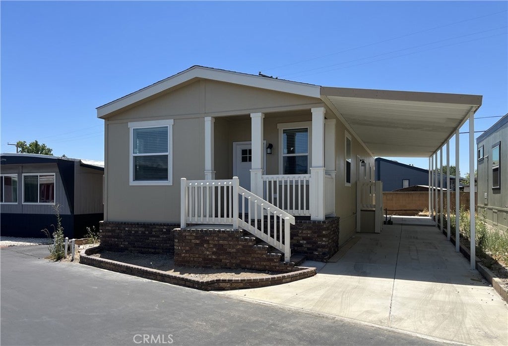 Just Reduced! Seller is motivated to sell, and will entertain all offers. A Brand New Manufactured Home in a Senior Community/55+ Foothill Village. This 2-bedroom and 2-bathroom home has an open floor plan and is approx. 1040 sq. ft. The kitchen is equipped with stainless steel appliances: dishwasher, built-in microwave oven, refrigerator, and oven/range. The laundry room is steps away from the kitchen and has hook-ups for a full-size washer and dryer. The primary bedroom has an adjoining bathroom with a walk-in shower. The home has central a/c and heating, and an attached covered carport.