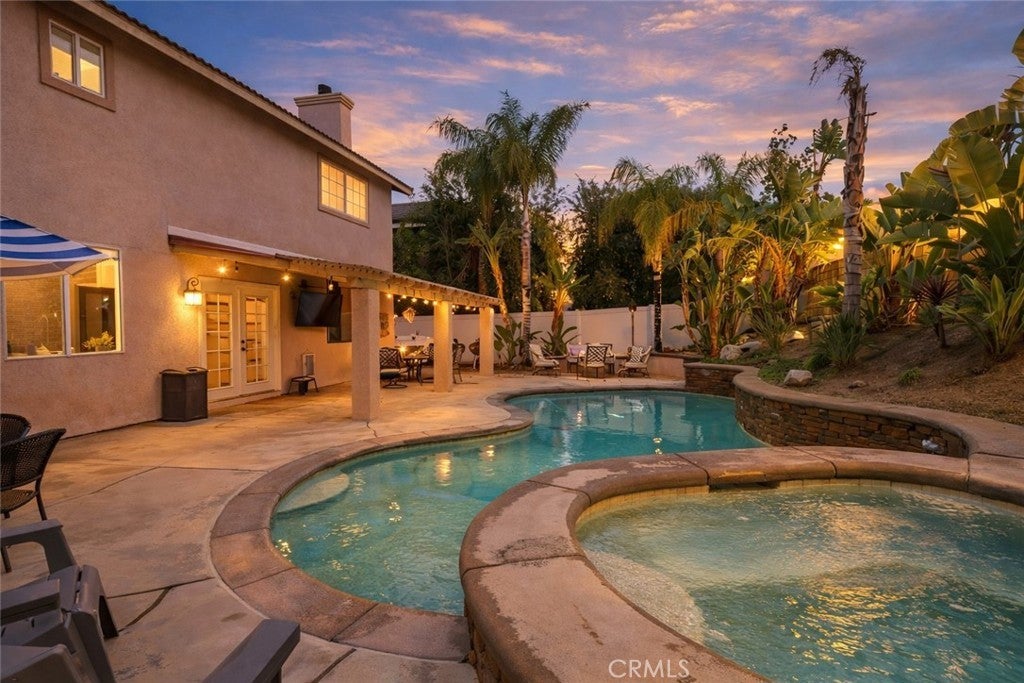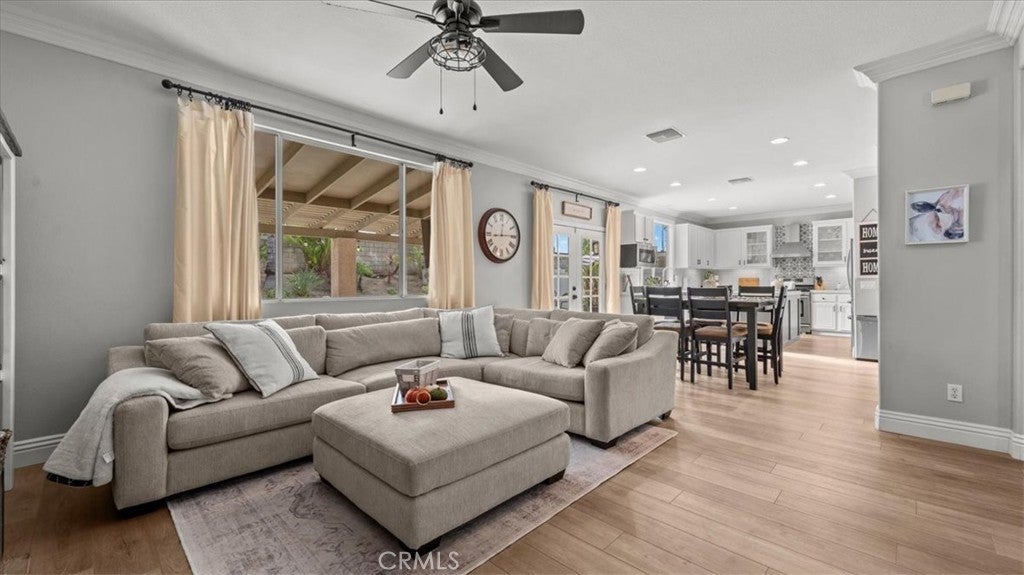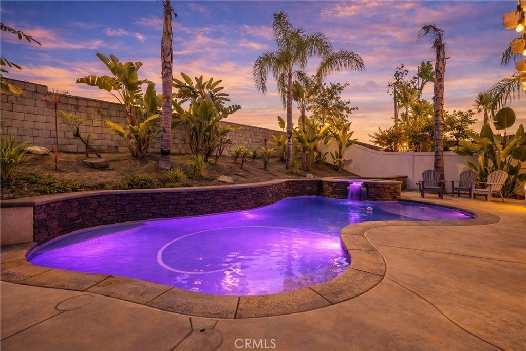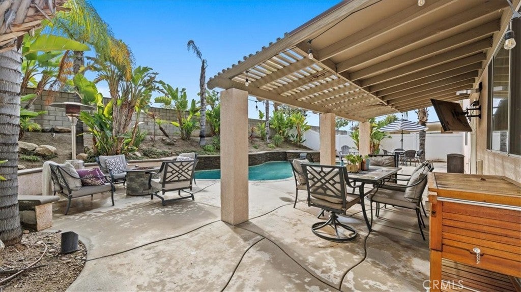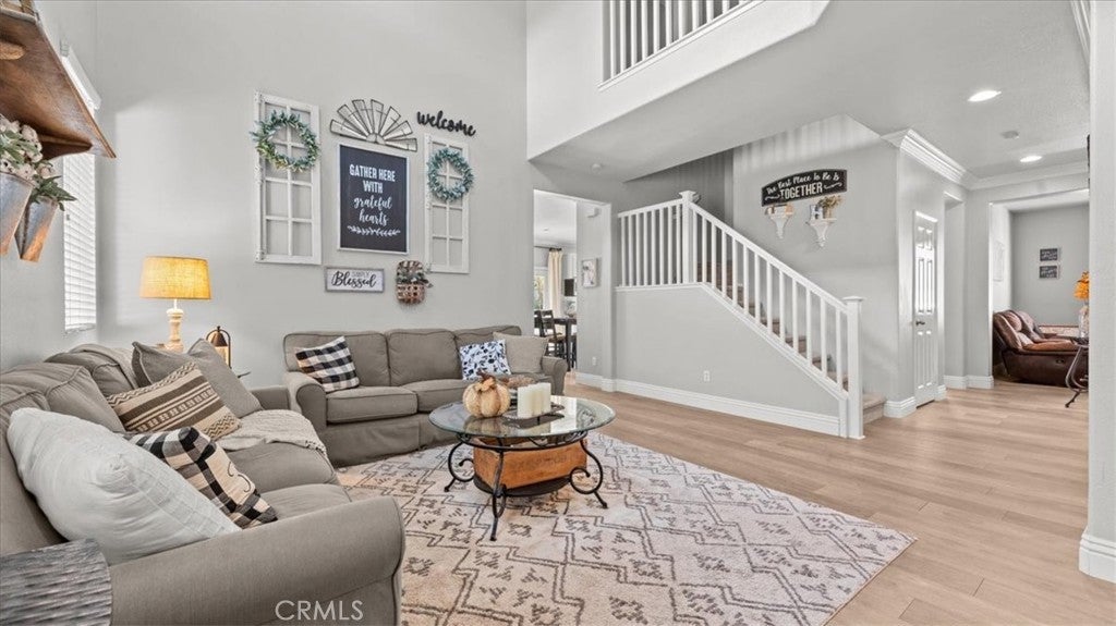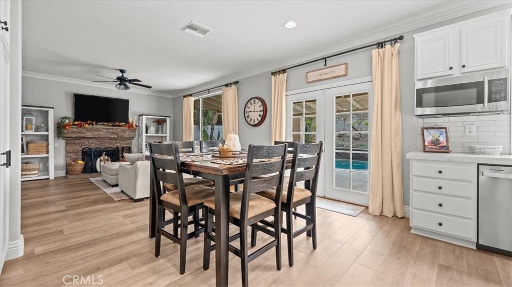 Is there a 4-bed home in Riverside with a pool, 3-car garage, and no HOA? Yes—right in the heart of Orangecrest. This upgraded 4-bed, 3-bath home offers over 2,600 sq ft of elegant living on a quiet, tree-lined street in the 92508 zip. From the custom pebble-tech pool to the upstairs laundry room and designer kitchen, every detail blends comfort with California style. Inside, you'll find wide-plank luxury vinyl flooring and detailed crown moulding throughout. The kitchen showcases white shaker cabinets, quartz countertops, a charcoal-toned island, and a tile accent wall behind the gas range and stainless chimney hood. A large stainless farmhouse sink overlooks the private backyard. The open layout connects the kitchen, dining, living, and family rooms—ideal for both everyday flow and entertaining. The main floor includes a full bedroom(currently used as an office) and bath, perfect for guests or multigenerational living. Upstairs: three more bedrooms, including a spacious primary suite with dual sinks, two walk-in closets, a soaking tub, and a separate shower. The upstairs laundry room adds everyday ease. Step outside to your resort-style yard: a custom pebble-tech pool with spa, stacked-stone spillway, palms, birds of paradise, and low-maintenance landscaping with full irrigation. Enjoy the extended concrete patio, vinyl fencing, and retaining wall. Additional upgrades: newer water heater, 17 SEER HVAC with heat pump, new ductwork returns, and a stacked-stone fireplace in the main living area. A 3-car attached garage, no HOA, and proximity to top-rated schools and parks complete the package.
