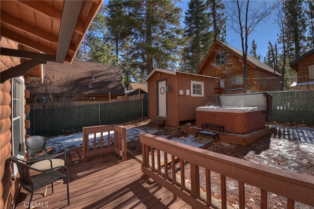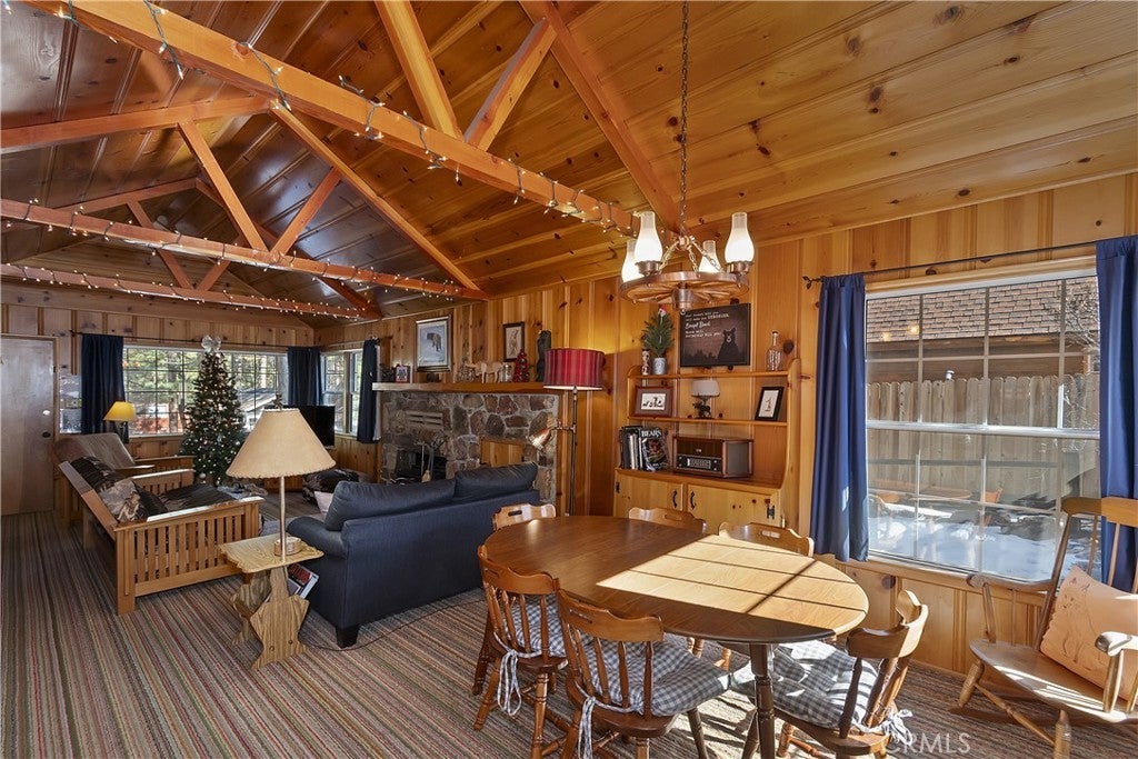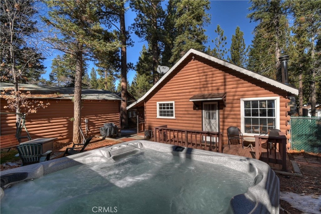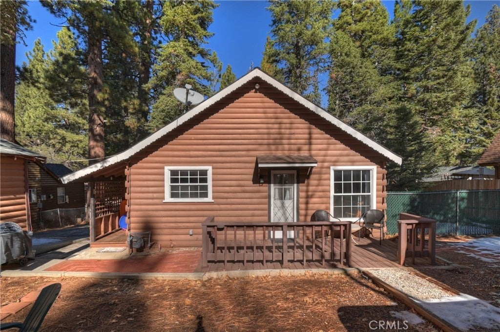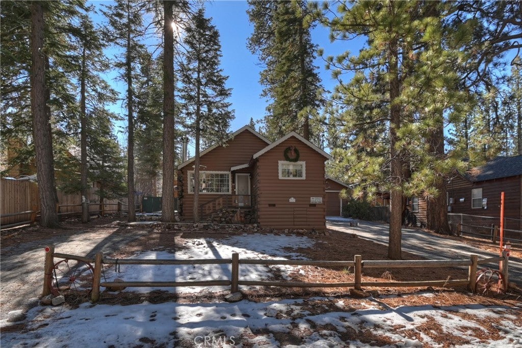 Nestled just one block from the National Forest in the highly sought-after Lower Moonridge neighborhood, this charming mountain cabin sits on an expansive 7,500 sq. ft. lot offering the perfect blend of tranquility, privacy, and outdoor adventure ~ Step inside to discover a warm and inviting interior featuring vaulted ceilings, beautifully complemented by tongue-and-groove pine walls that exude classic mountain character ~ A stunning native rock fireplace with an efficient insert becomes the heart of the living and dining area, allowing you to enjoy long, cozy fires after a day on the slopes or trails ~ The cabin features dual-pane windows that bring in natural light, along with a vintage classic stove and range that adds a touch of nostalgic charm ~ Enjoy the mountain air from the spacious Trex deck, perfect for morning coffee, evening gatherings, or simply watching the seasons change ~ soak in the hot tub after a day of adventure. Outside, the property continues to impress with a detached one-car garage ~ Ideal for storing all your mountain toys ~ Plus an additional storage shed for extra convenience ~ The lot is fully fenced and offers ample parking for the whole family, accommodating up to 10+ vehicles off-street with ease ~ Take a short walk to Lower Moonridge to grab a coffee and a donut at Dank Donuts or a night cap at the Moonridge Room. Whether you’re seeking a serene getaway, a cozy year-round retreat or an investment property, this Lower Moonridge haven captures the true essence of mountain living in close proximity to all Big Bear has to offer.