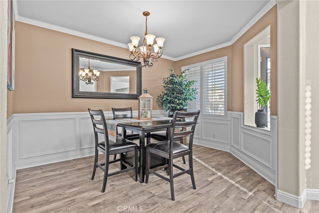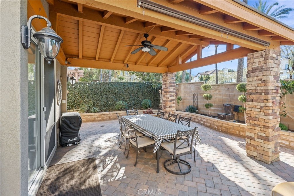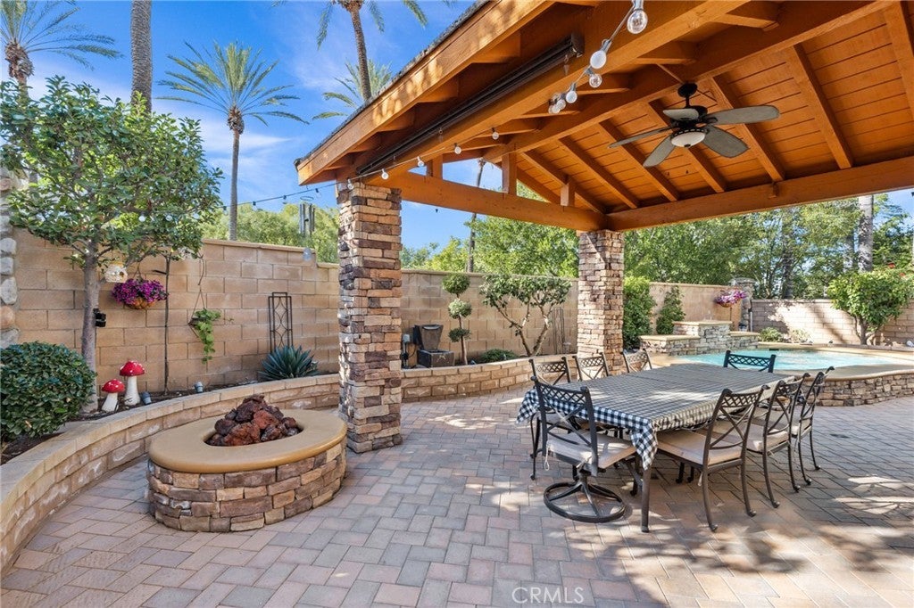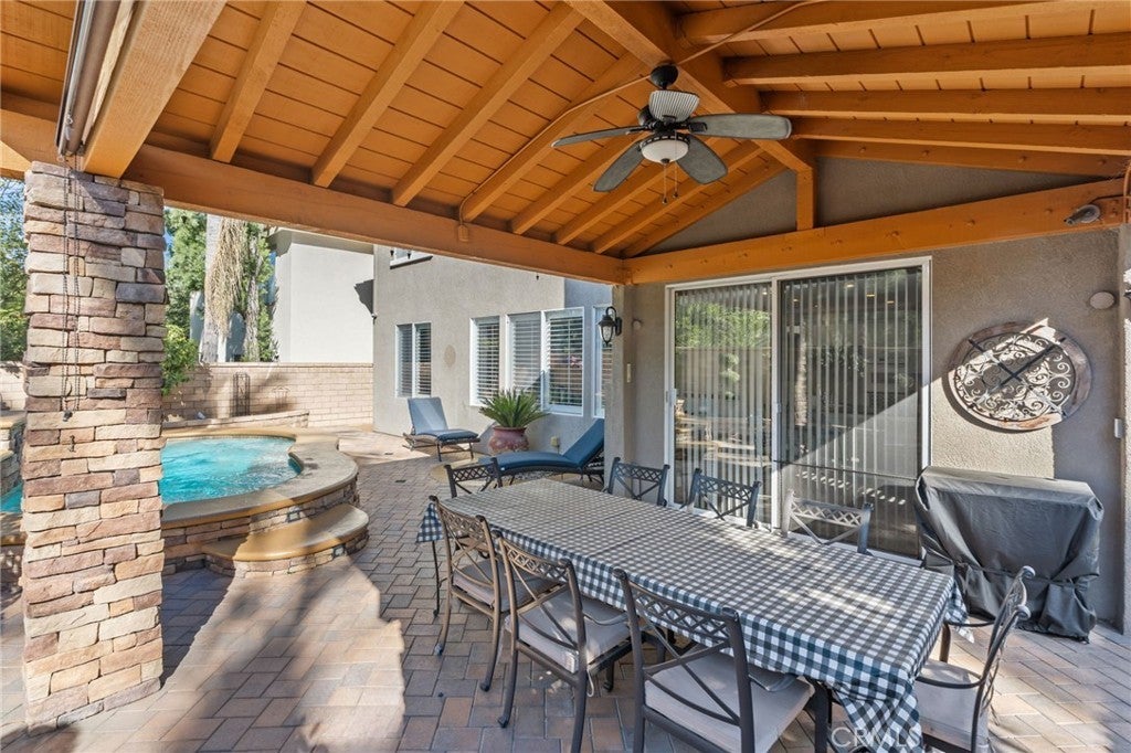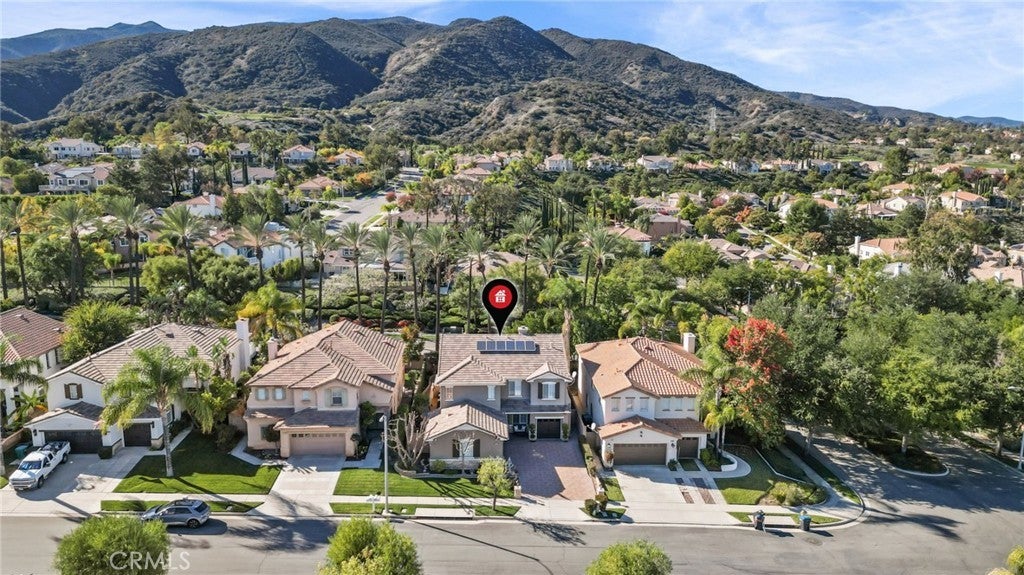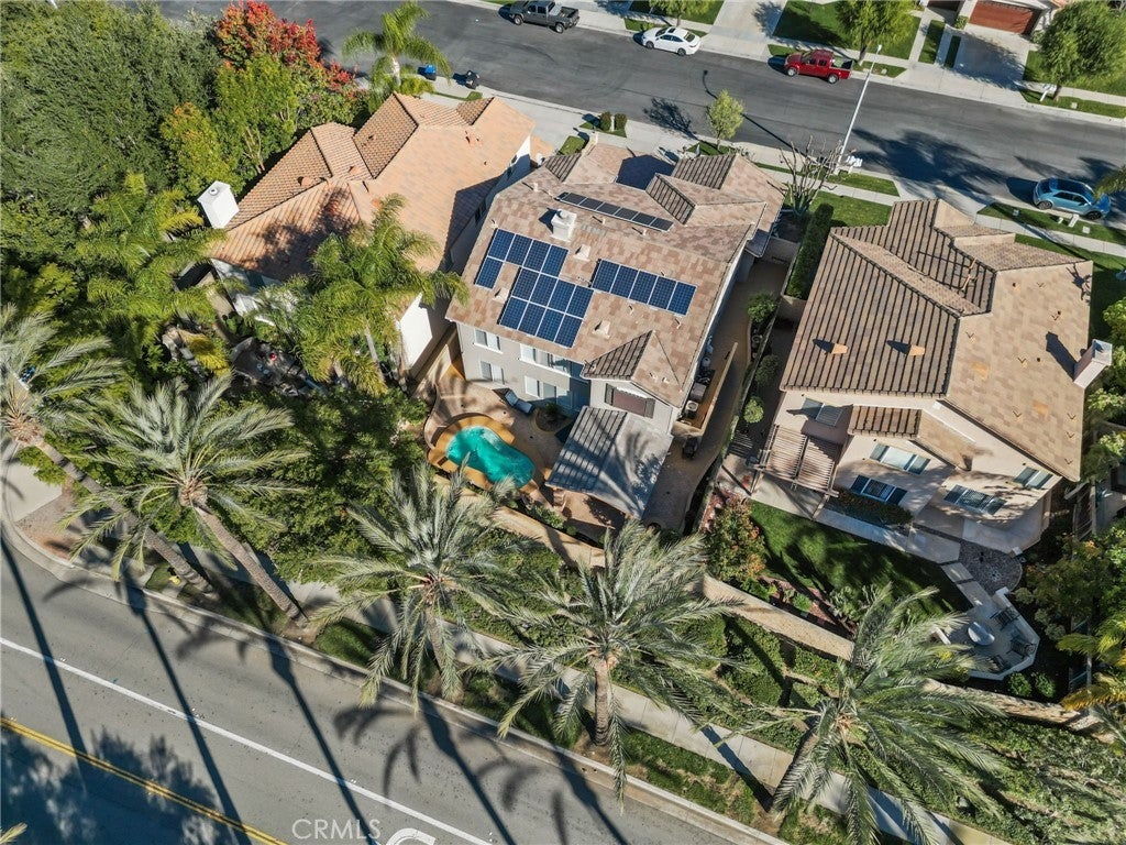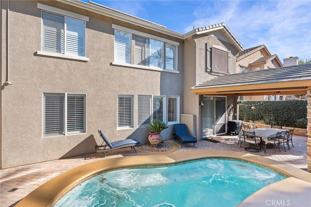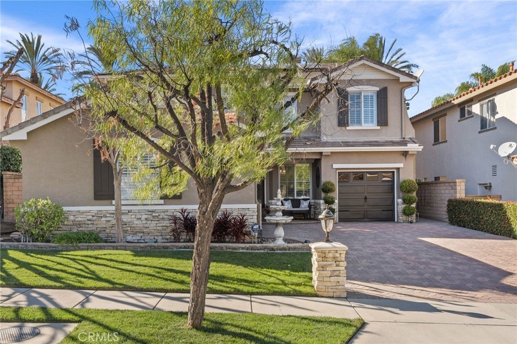 Elegant home in the prestigious Eagle Glen Community! This beautifully upgraded residence features a stunning front door, soaring high ceiling, and a spacious, open floor plan. Offering 5 bedrooms and 3 bathrooms, including a convenient main-floor bedroom and full bath, this home is perfect for comfort and flexibility. The primary suite includes an oversized shower and generous walk in closet. Additional highlights include wood-like tile flooring, iron stair railings, a cozy family-room fireplace, and a well appointed kitchen with a cooktop range, walk-in pantry, center island, and abundant cabinetry. Throughout the home you'll find crown molding, window shutters, upgraded baseboards, and ceiling fans. Vacation in your own resort-style backyard featuring a covered patio with ceiling fan, a cozy fire pit, a relaxing swim spa, and glamorous hardscape. Other features include a 3-car non-tandem garage, attractive driveway, two AC condensers, Ecobee thermostat, security cameras, and lower property taxes with NO CFD. The backyard is enclosed with block walls, offering durability, low maintenance, and enhanced privacy. Paid off Solar. Conveniently located near schools, shopping, and the freeway. Com and see - This is perfect place to call home!