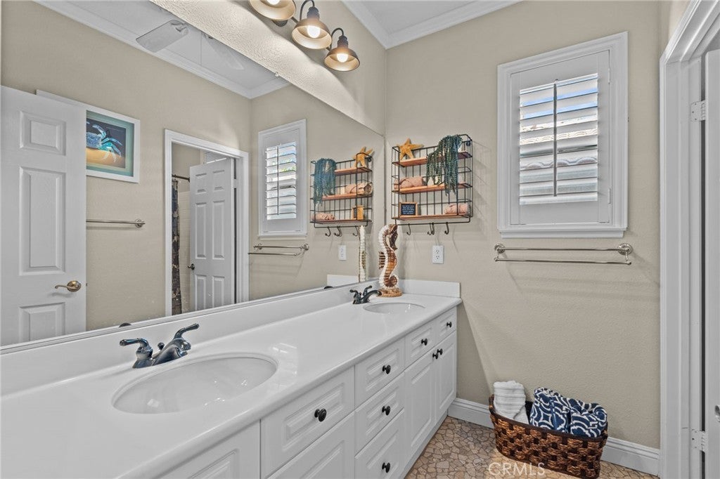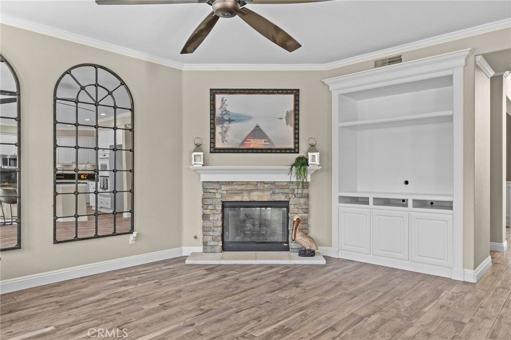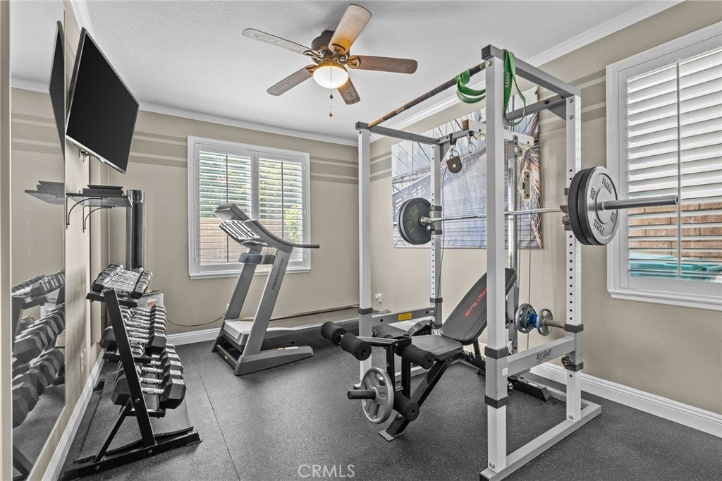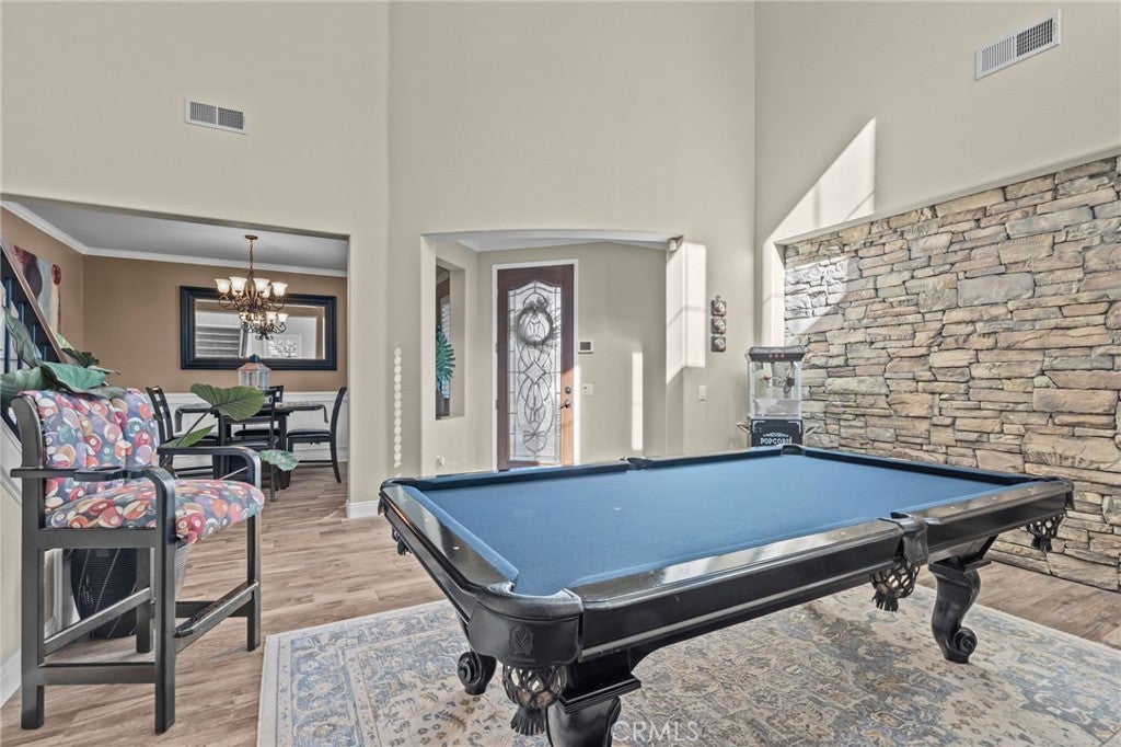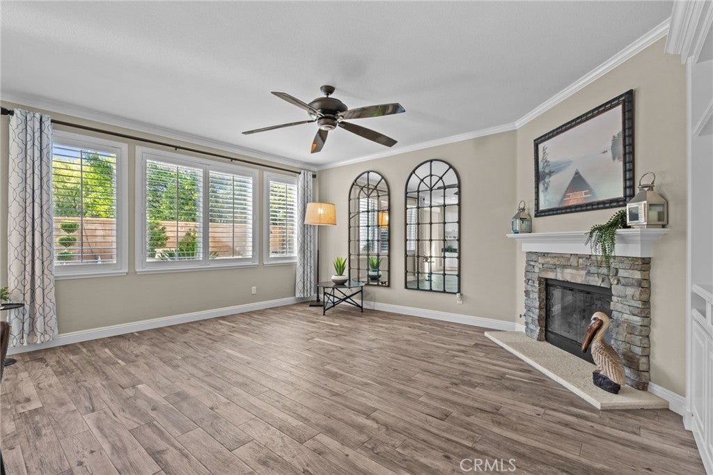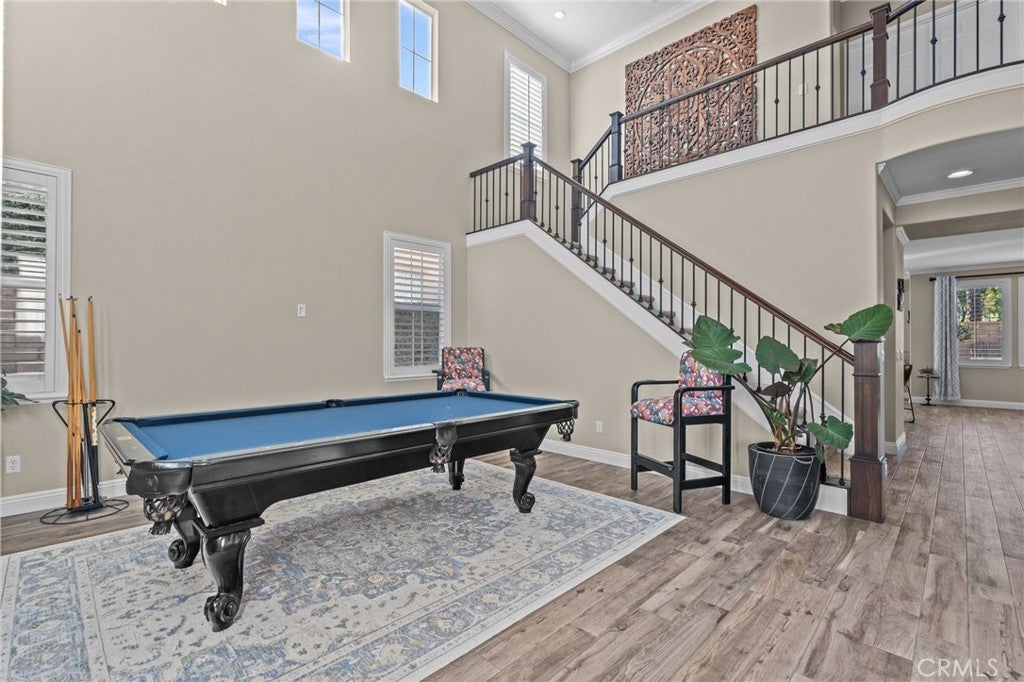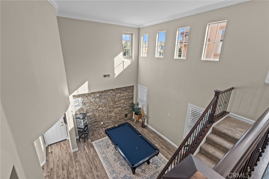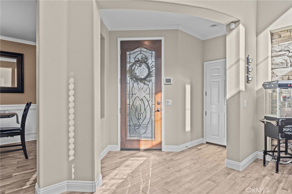 Elegant home in the prestigious Eagle Glen Community! This beautifully upgraded residence features a stunning front door, soaring high ceiling, and a spacious, open floor plan. Offering 5 bedrooms and 3 bathrooms, including a convenient main-floor bedroom and full bath, this home is perfect for comfort and flexibility. The primary suite includes an oversized shower and generous walk in closet. Additional highlights include wood-like tile flooring, iron stair railings, a cozy family-room fireplace, and a well appointed kitchen with a cooktop range, walk-in pantry, center island, and abundant cabinetry. Throughout the home you'll find crown molding, window shutters, upgraded baseboards, and ceiling fans. Vacation in your own resort-style backyard featuring a covered patio with ceiling fan, a cozy fire pit, a relaxing swim spa, and glamorous hardscape. Other features include a 3-car non-tandem garage, attractive driveway, two AC condensers, Ecobee thermostat, security cameras, and lower property taxes with NO CFD. The backyard is enclosed with block walls, offering durability, low maintenance, and enhanced privacy. Paid off Solar. Conveniently located near schools, shopping, and the freeway. Com and see - This is perfect place to call home!