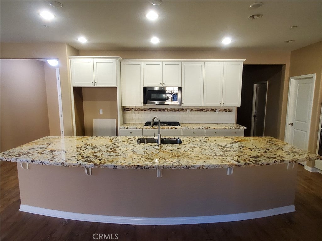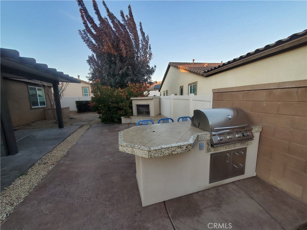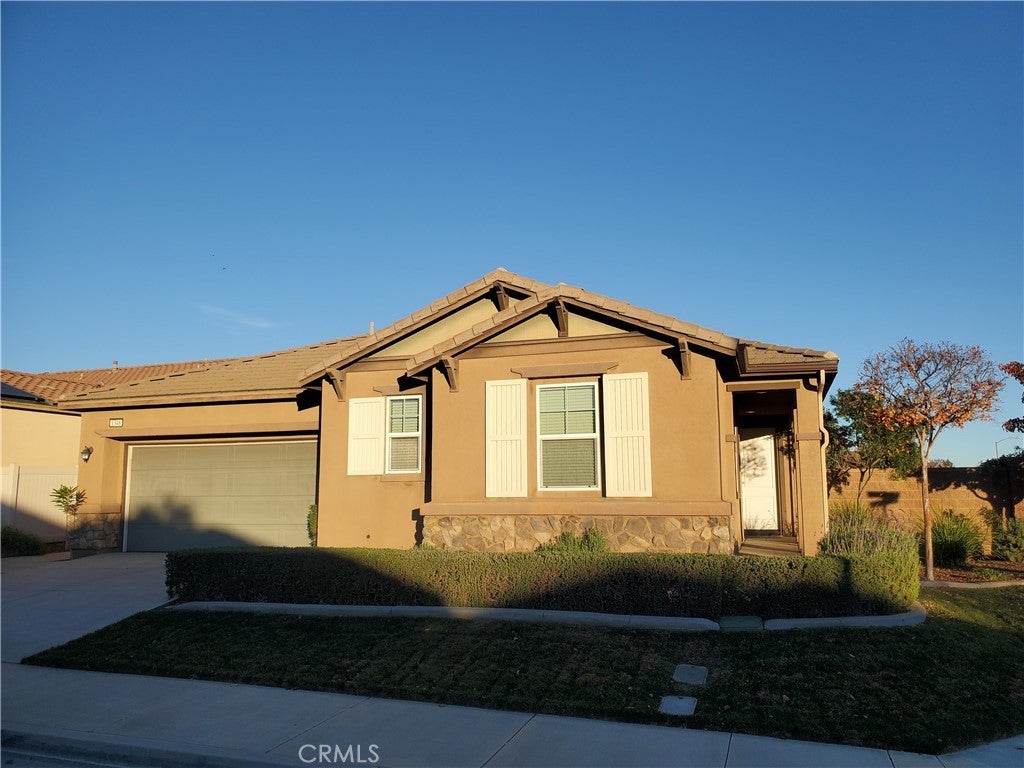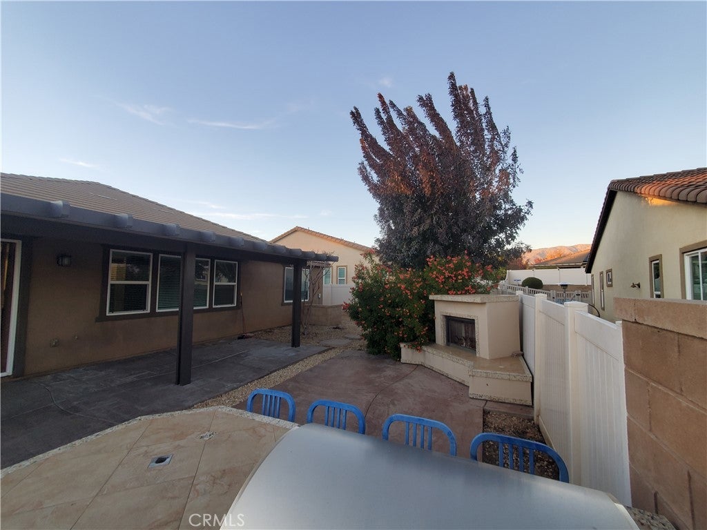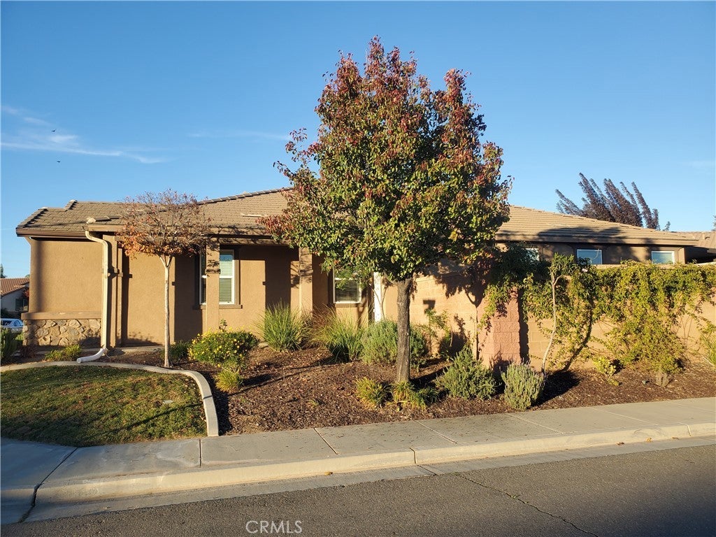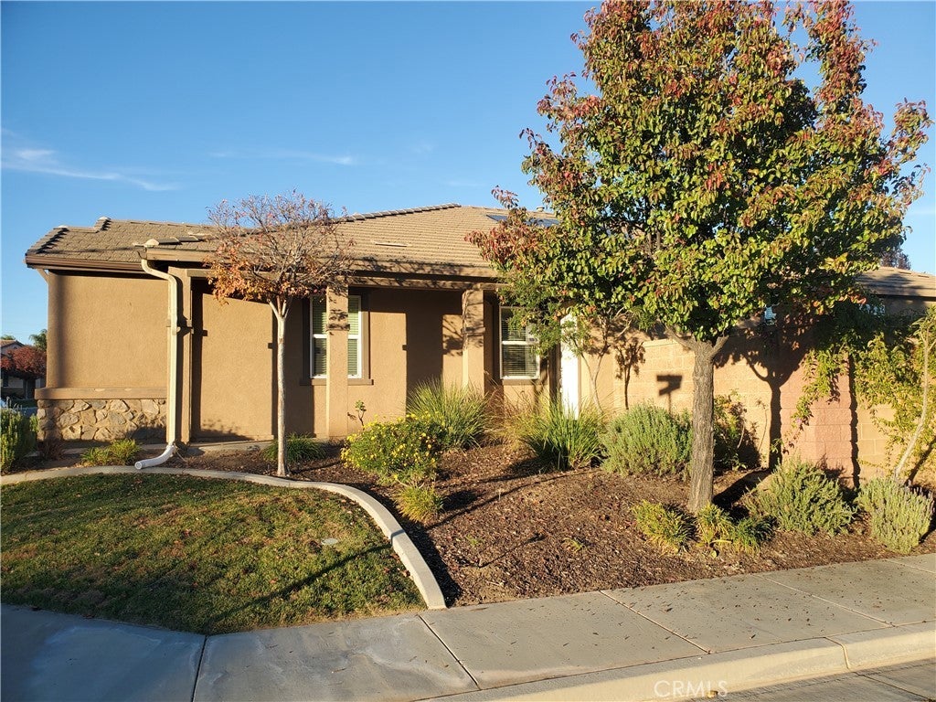 Wonderful single story home on a corner lot!! This 3 Bedroom, 2.5 Bathrooms, with an office has an open spacious floor plan with a large open concept family room, and high ceilings. Beautiful Laminate Plank flooring for easy maintenance, a Chef's Dream Kitchen With 13' X 5' Granite Center Island, Upgraded Stainless Appliances, And Walk-In Pantry. Custom upgraded White Cabinets with Self-Closing Drawers. Recessed Lighting and Blinds throughout. Ceiling fans are in every room. Large Master Bedroom Suite. Master Bath includes separate bath tub and shower, dual sinks. Indoor laundry room. Solar System installed and PAID For. INCREDIBLE back yard for entertaining and family enjoyment! Custom Stamped Concrete patios and stepping stones to navigate this this professionally landscaped yard. Maintenance free Aluma-Wood patio cover. The back yard also comes equipped with a custom outdoor Gas Fireplace and custom built BBQ Island. The Entire Rear Yard Is Well Appointed With Desert Plants And Surrounded By Decorative Rock. This home has everything you could ask for, come see it before it is gone!!