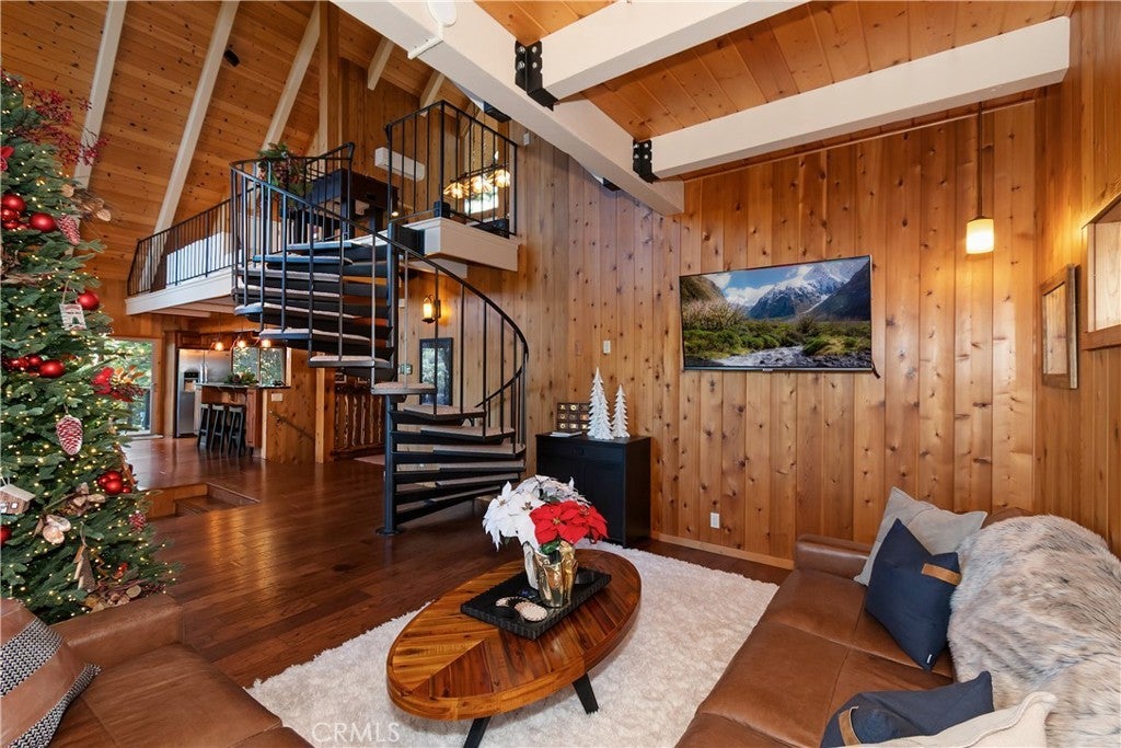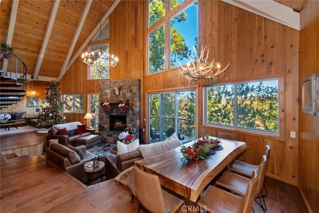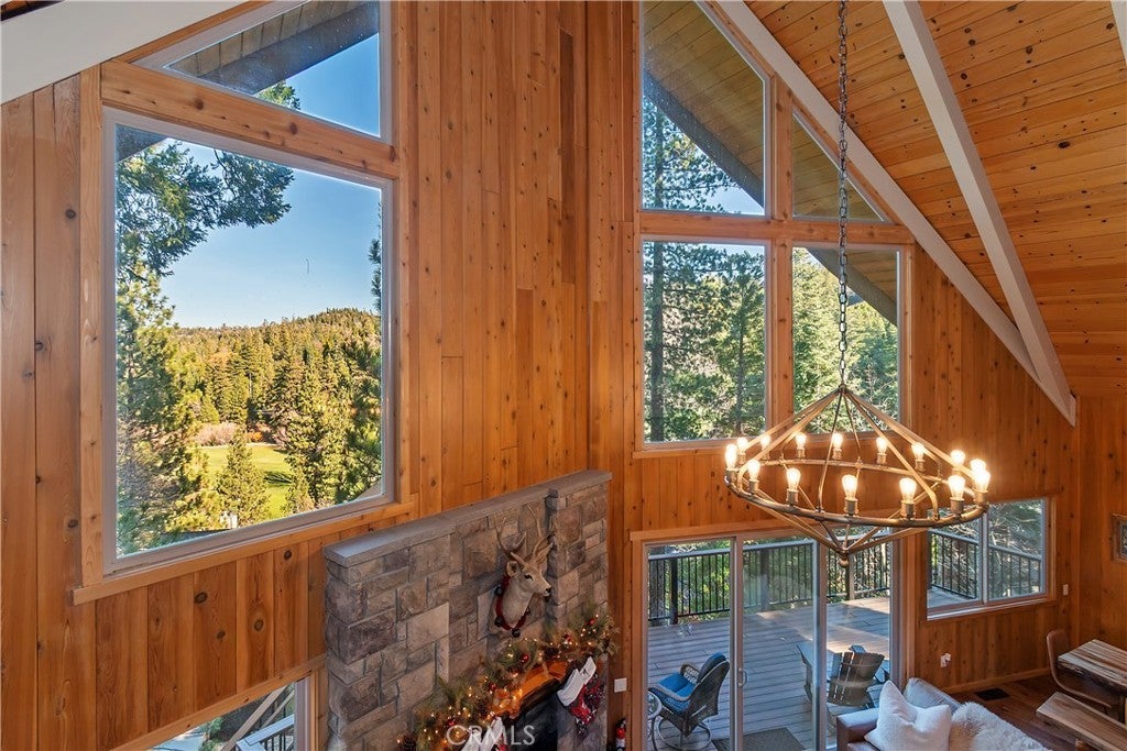 What is a "Prow-Style" home? Think of the front of a large boat or ship with an impressive "bow", if you will. The "Prow-Style" homes with their "wall of glass" represent the most popular architectural style of home in Lake Arrowhead. Most of the "Prow Style" homes were built by a renowned local builder in the 1960's-1970's. This particular "Prow" is a true gem offering modern comfort with timeless rustic charm. With 3 bedrooms, 4 baths, a den & a separate loft open style family room, it offers breathtaking panoramic views of the golf course and would work wonderfully as a full-time residence, vacation home, or short-term rental. The home features 3 spacious bedroom suites, one on the main level, and each with an attached bath for exceptional privacy. The lower-level primary suite offers a spa-like retreat with a soaking tub, fireplace, dual vanities, and direct access to the outdoor spa—perfect for peaceful relaxation. A unique bunkroom suite sleeps up to six. The expansive upstairs loft is currently the perfect family/game room although it could double as a bedroom, too, offering flexibility for your lifestyle needs. The main level showcases cathedral ceilings and a “great room” open floor plan that fills the living space with natural light and frames the long-range mountain and golf course views. The living room features a beautiful stone fireplace, enhancing the home’s warm mountain ambiance. The chef’s kitchen includes gorgeous granite slab countertops, high-end stainless steel appliances, a wine refrigerator, a breakfast bar, and a walk-in pantry. It’s designed for both entertaining and everyday convenience. Outdoor living shines with the wraparound deck, offering multiple areas to dine, relax, and take in the scenic surroundings. The current sellers made recent improvements including a newly added air conditioning system, new chandeliers in the living room and pool/game room, new carpet, and new blinds. The entire home underwent a massive renovation with the previous owner, including a newly redesigned kitchen and remodeled baths. Located in Lake Arrowhead, this home includes valuable lake rights, granting access to private Lake Arrowhead for boating, paddleboarding, kayaking, waterskiing, wakeboarding, sailing, and year-round alpine recreation. Beautifully updated throughout and thoughtfully designed, this home blends comfort, luxury, and nature in perfect harmony. Schedule your private showing today and experience mountain living at its finest.